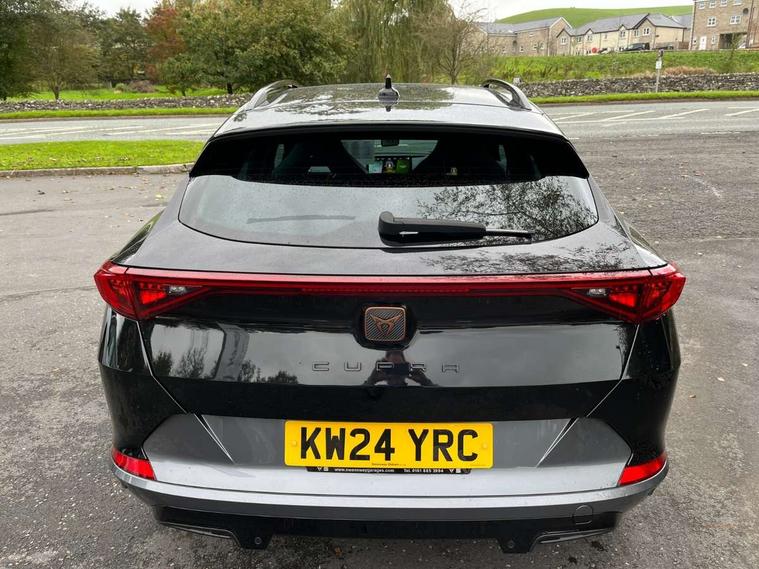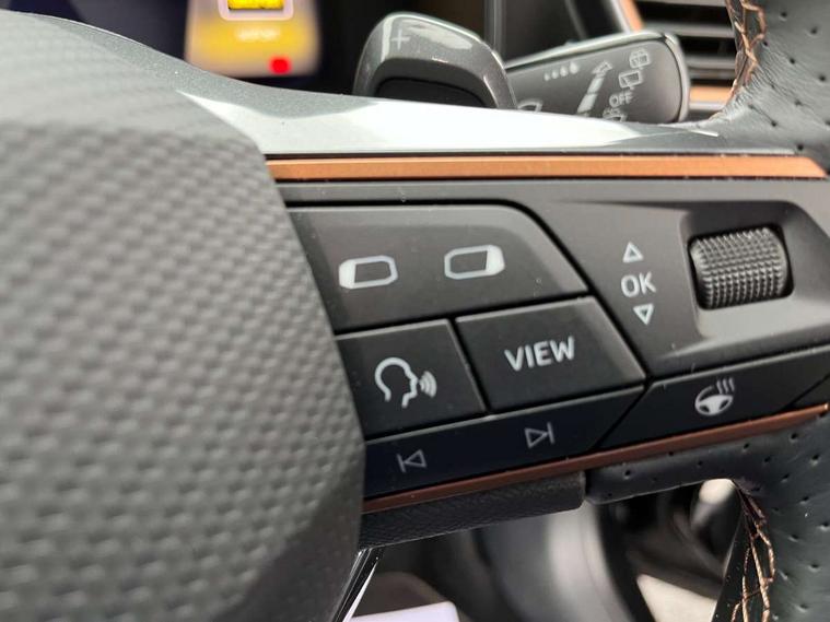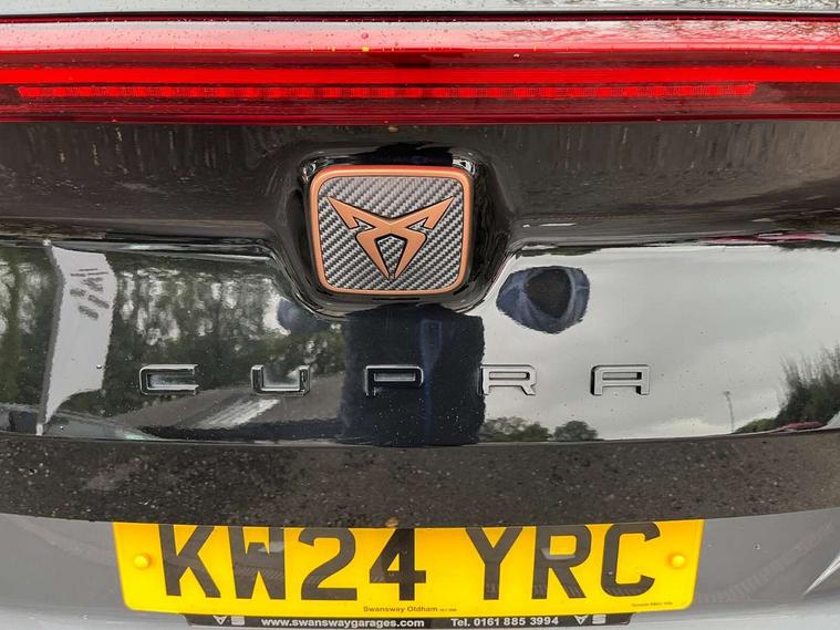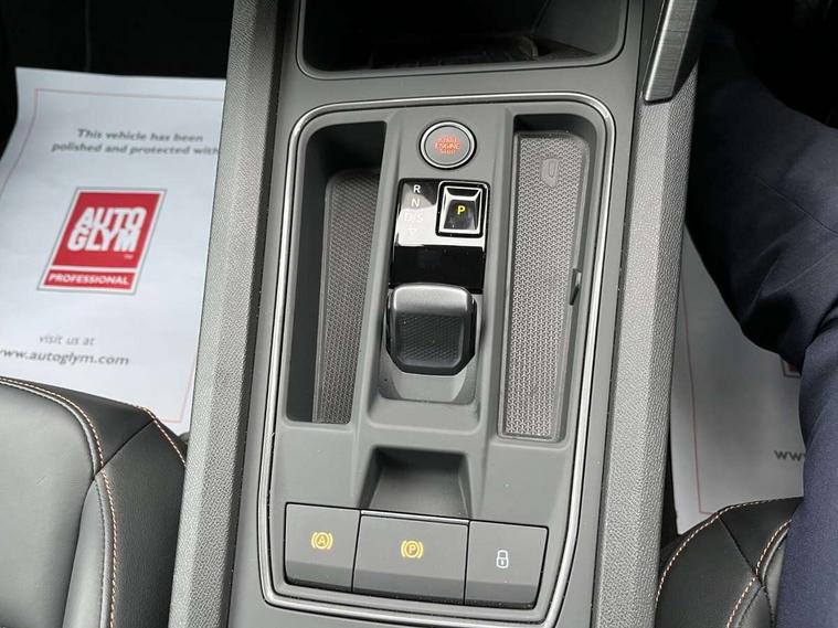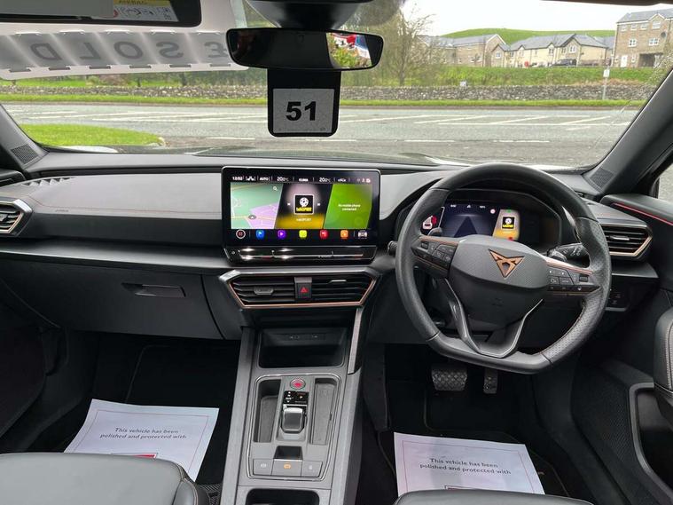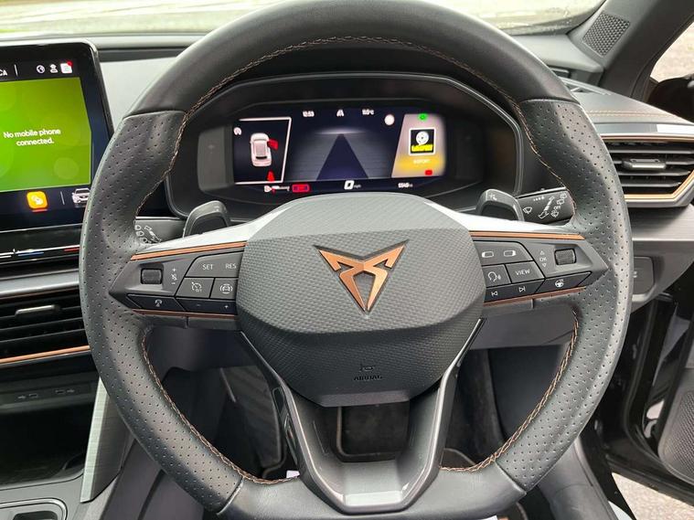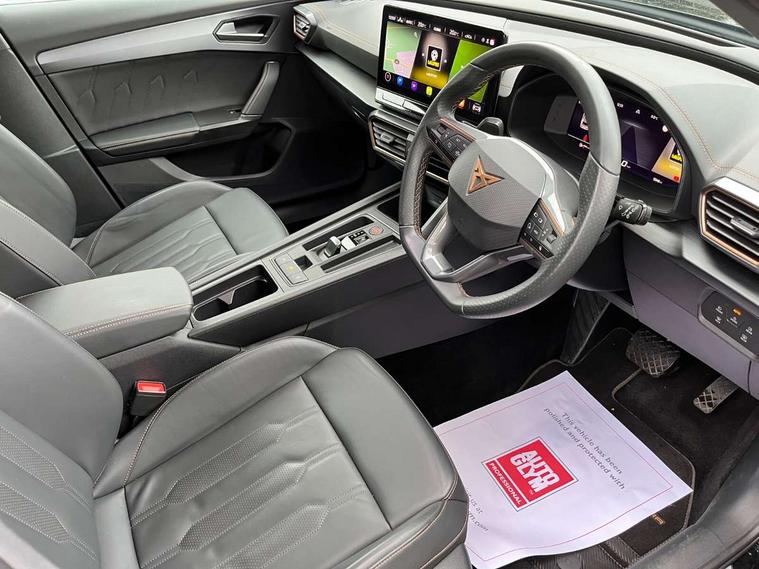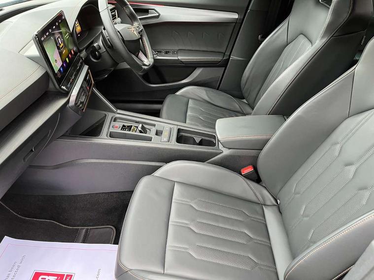 Digital cockpit and configurable dashboard, Driver alert system, Driving profile selection, Forward collision warning with automatic braking, Lane assist, Navigation system with 12'' Touchscreen Display, Park assist (inc front/rear parking sensors), PAS, Predictive adaptive cruise control with speed limiter, Rear view camera, RPM, trip computer, outside temp gauge, instrument light brightness, low fuel warning light, lights on reminder, gearshift indicator, Service interval indicator, Start/stop system with regenerative braking, Voice control system, Wired Android Auto, Wireless apple carplay, Wireless phone charger, Electronic locking differential and dynamic traction support, Standard suspension, 2 front and 2 rear USB type C sockets, Auxiliary input socket, DAB radio, Auto dimming rear view mirror, Body colour door handles, Body coloured bumpers, Dark grey wing mirror, Daytime running light with automatic headlight control and coming home feature, Dynamic headlight range control, Electric front/rear windows, Electrically adjustable heated and folding door mirrors with memory function, Front fog lamps with cornering function, Gloss black roof rails and window surrounds, LED Headlights, LED Taillights with dynamic indicator, Rain sensing wipers, Rear diffuser with black simulated exhaust pipes, Rear side wing doors, Rear wash/wipe, Third brake light, Tinted rear windows, Welcome lights, 12v power supply in centre console, 12V socket, 12v socket in loadspace, 2 front and 2 rear reading lights, 230V socket, 3 seat bench in 2nd row, 60/40 split rear bench seat with armrest and mechanical seat release, Black headlining, Dust/pollen filter, Front and rear head restraints, Front centre armrest, Height/reach adjust steering wheel, Illuminated interior front door sills, Illuminated sunvisor with mirror, Isofix, Leather multi function heated steering wheel with gear shift paddles, Luggage tie-down hooks, Single front passenger seat, Three zone climate control with control panel in rear, Variable luggage/load compartment floor, Wraparound lighting, Genuine Nappa leather Pack - Cupra, 3 point seatbelts on all rear seats, ABS, Brake control system - ESC and brake booster, Child proof door locks, Driver and front passenger airbags with front passenger airbag de-activation, Electronic parking brake, Front and rear disc brakes, Front side curtain airbags, Hill hold control, Public e-call, Seat belt reminder for front and rear seats, Tyre pressure monitoring system, Anti theft alarm system, Keyless entry and start system (KESSY), Locking wheel bolts, Copper and aluminium interior detailing, 19" 'Exclusive' machined sport matte black and silver alloy wheels,