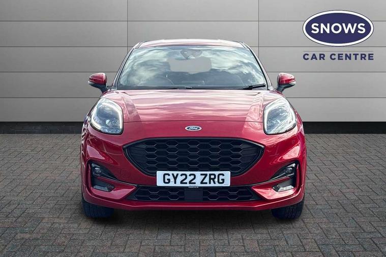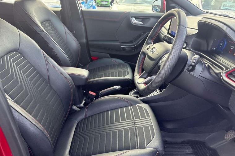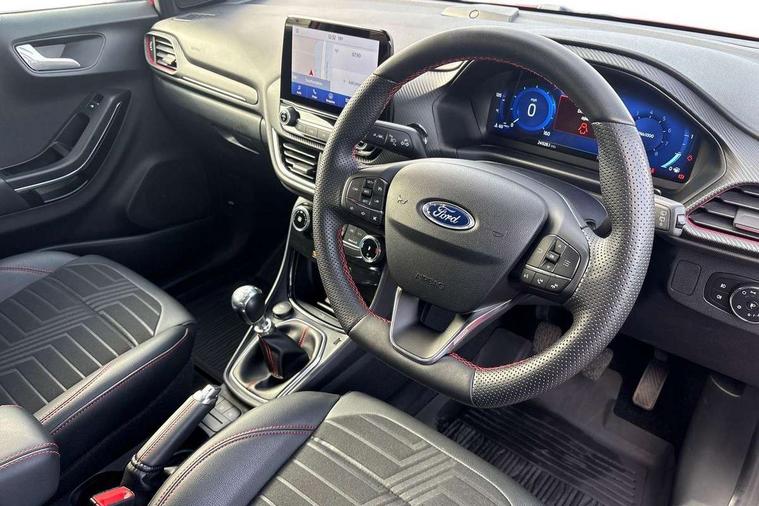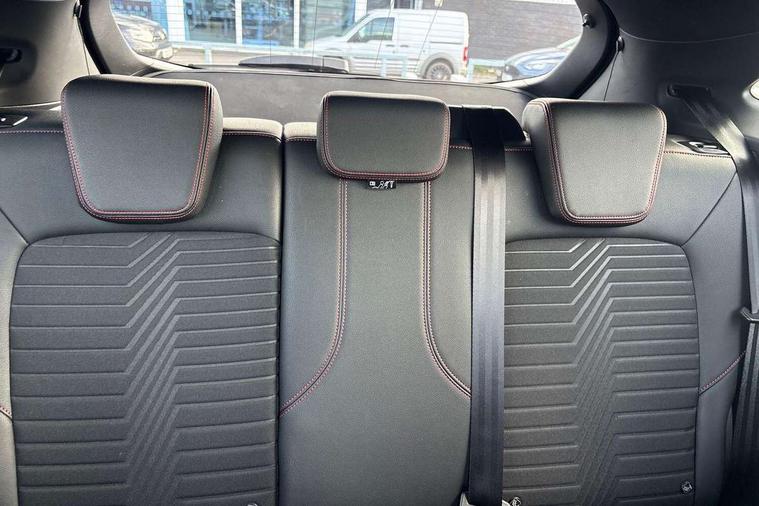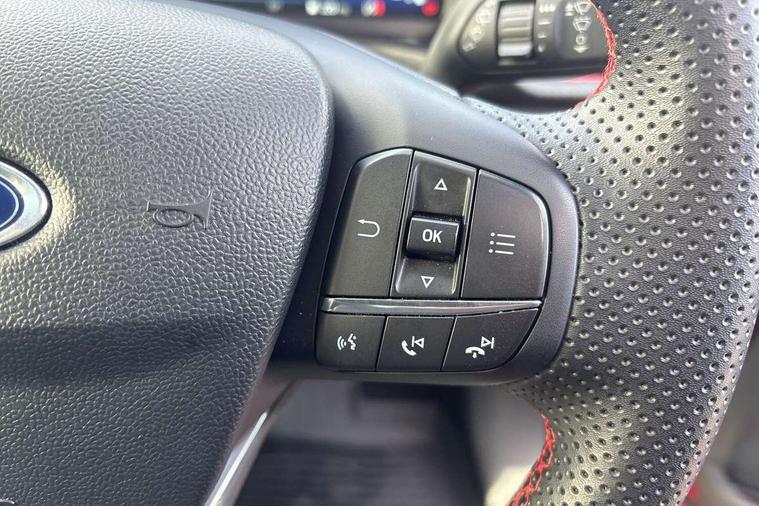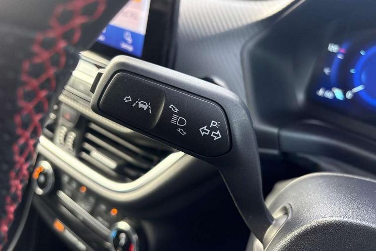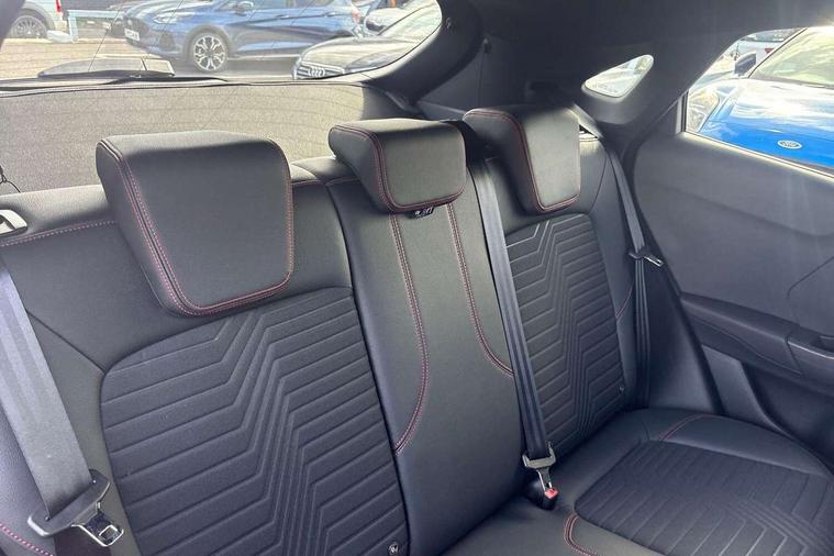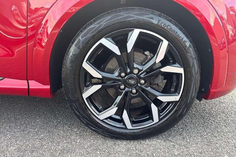 Driver impairment monitor, Emergency call service, Ford easy fuel, Full digital 12.3" instrument cluster, Lane keeping aid with lane departure warning, Power assist steering, Power start button, Rear parking sensor, Selectable drive modes(Normal, sport, Eco, trail, slippery), Speed sign recognition, Sport suspension, Automatic headlights with auto high beam, Automatic rain sensing wipers, Front fog lamps, LED daytime running lights, LED rear lamps, Power foldable heated door mirrors with puddle lamps, Privacy glass to side rear windows and tailgate glass, Quickclear heated windscreen, Rear side wing doors, Rear wiper, ST-Line body styling kit with unique grille and large body colour rear spoiler, Third brake light, 3 seat bench in 2nd row, Centre console with armrest and stowage, Ford megabox extended bootspace, Front and rear head restraints, Front floor mats, Manual 4 way driver seat adjust with lumbar adjustment, Manual 4 way passenger seat with lumbar seat adjustment, Sensico partial premium upholstery, Single front passenger seat, ST-Line flat bottomed sensico leather steering wheel with leather handbrake and aluminium gear knob, Wireless charging pad with electronic air temperature control (EATC), B&O Premium Audio system + Ford SYNC 3 navigation pack - Puma, Driver assistance pack with Lane departure warning - Puma, 3 rear seatbelts, Child safety lock, Electronic stability control (ESC) and hill start assist, Pedestrian/cyclist detection & post-collision braking, Pre collision assist with autonomous emergency braking, Tyre pressure monitoring system (TPMS), Thatcham alarm, Carbon look interior deco spears,