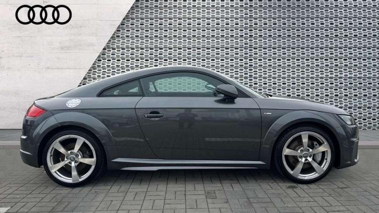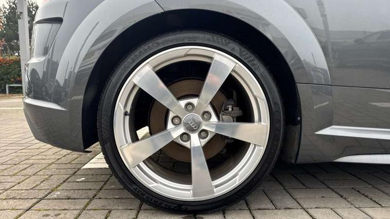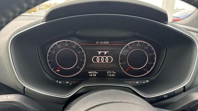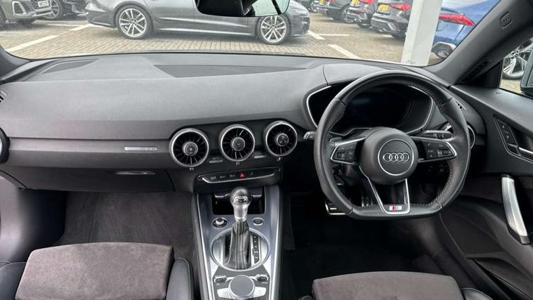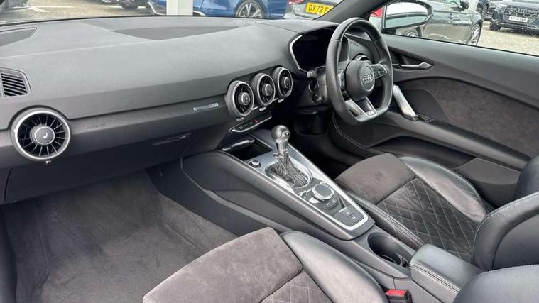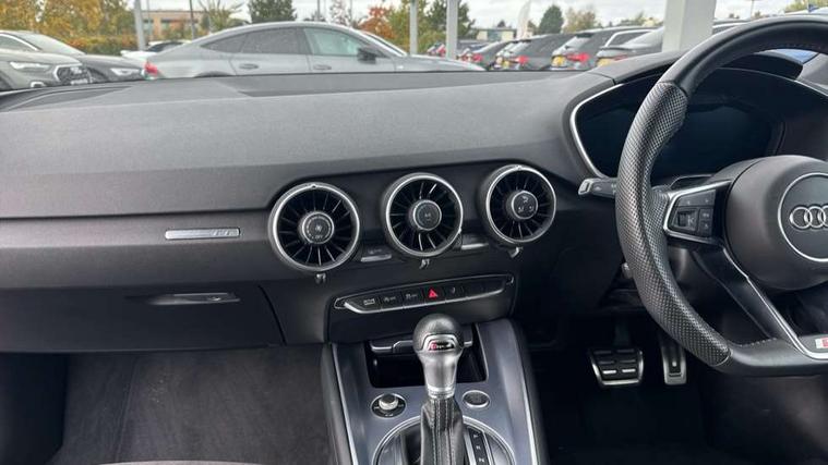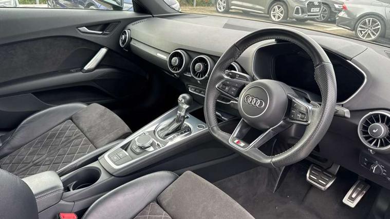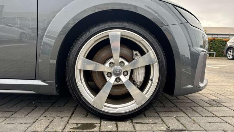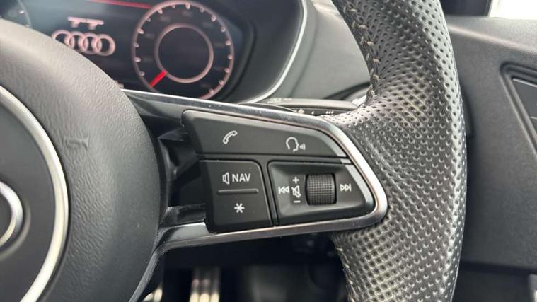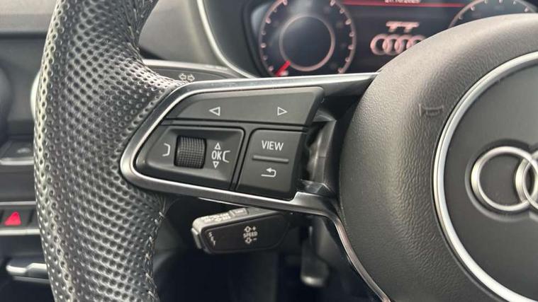 Audi active lane assist, Audi drive select with 4 Pre configured modes, Audi virtual cockpit - 12.3" high-resolution LCD display with fully customisable instrument cluster, Cruise control + speed limiter, MMI touch panel, Mobile phone preparation with bluetooth interface, Progressive power assisted steering, Rear parking sensors, Service interval indicator, Start/Stop system with energy recuperation, TP memo, 8 speakers, AM/FM radio, Audi music interface, Bluetooth audio streaming, DAB Digital radio, MMI Radio with CD player and SD/XC card slot, Auto dimming rear view mirror, Auto headlight range control, Body colour bumpers, Dynamic rear indicators, Electric front windows, Front fog lights, Green tinted heat insulating glass, Headlight wash system, High gloss black radiator grille, LED daytime running lights, Light and rain sensors, Retractable rear spoiler, S line badges on front wings, S Line body styling, S Line front and rear bumpers, S line rear diffuser with platinum grey insert, S line sill plates, Sunband for windscreen, 12V socket, 3 spoke flat bottomed high multi-function leather sport steering wheel with gearshift paddles, 4 way electric lumbar support for driver and front passenger, Black headlining, Door sill trims with S line logo, Extended aluminium look with stainless steel pedals, Front centre armrest, Front super sports seats, Heated front seats, Height adjustable driver's seat, Height adjustable front head restraints, Height/reach adjust steering wheel, ISOFIX child seat mounting for front passenger seat with airbag deactivation, Perforated leather gearknob, Rear top tether child seat ISOFIX attachment, S Line badge on steering wheel, Split folding rear seat, Tool kit, Top tether anchor plate for isofix child seat, Non smoking pack - TT/TT RS, 3 point front seat belts, ABS, ASR traction control, Brake energy regeneration, Curtain airbags, Driver and front passenger airbag with front passenger airbag deactivation, EDL traction control, Electromechanical parking brake, ESP, First aid kit, Front side airbags, Head airbags, Hill hold assist, Roll bar in glossy black, Seatbelt warning, Tyre pressure warning, Warning triangle, Anti theft alarm, Anti theft wheel bolts, Immobiliser, Keyless Go, Remote central locking, Matt brushed aluminium inlays, Tyre repair kit,