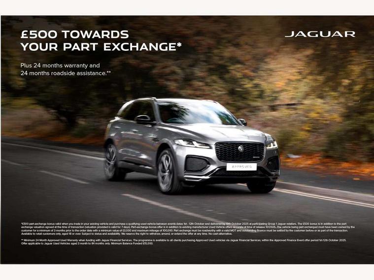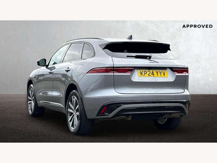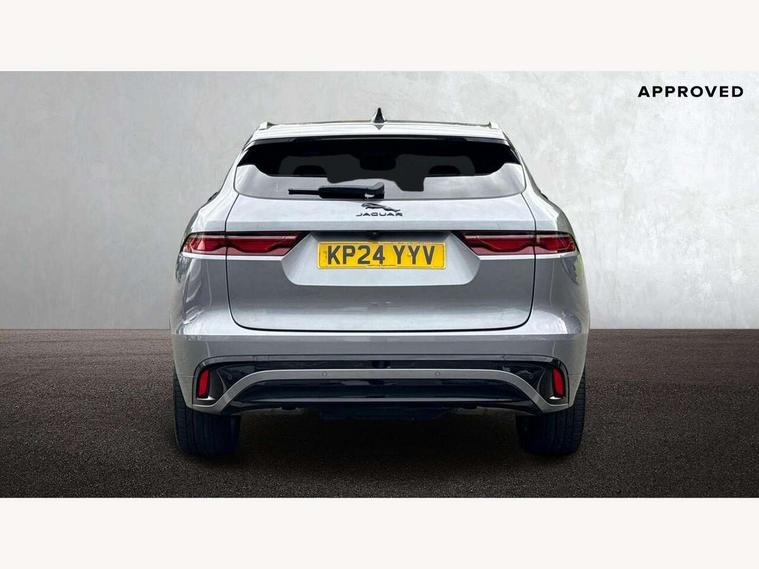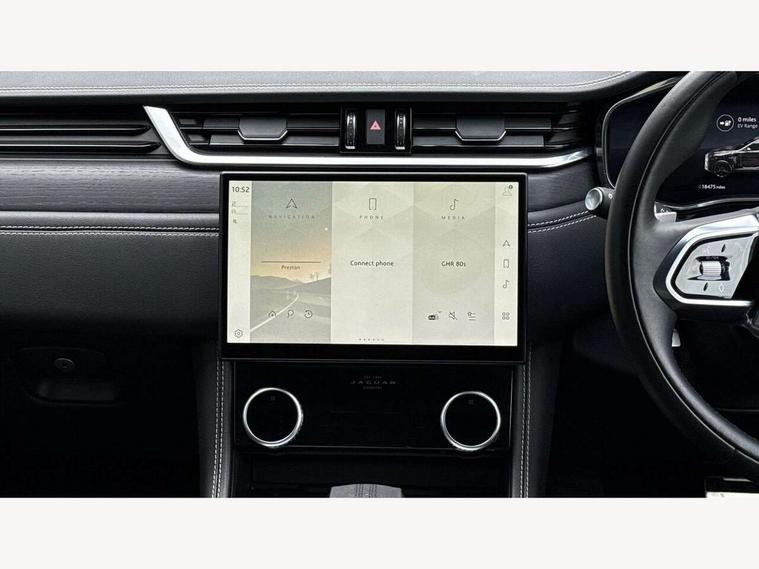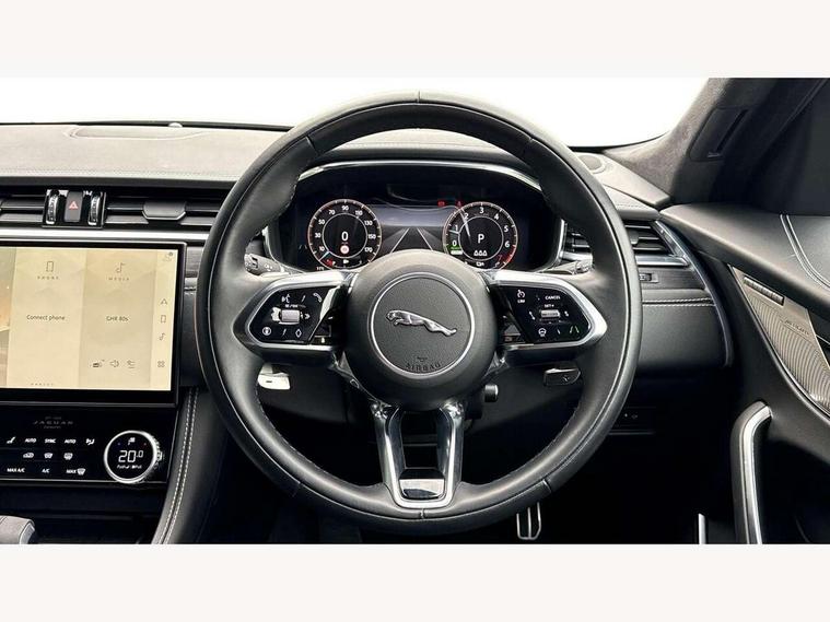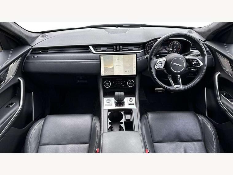 11.4" touchscreen, Adaptive cruise control with steering assist, Android Auto, Apple car play, Blind spot assist, Bluetooth connectivity, Clear exit monitor, Driver alert system, Driver condition monitor, eCall emergency call system, Eco driving style assistant, Electric power assisted steering, InControl remote, Interactive driver display digital with 12" TFT display, Jaguar Toggle shift selector, Lane departure warning system, Lane keep assist, Outside temperature gauge, Personalisation profile management, Pivi pro connected navigation system with app interface and media storage, Pro services and wifi hotspot, Push button starter, Rear collision monitor, Rear traffic monitor, Service interval indicator, Speed proportional steering, Start up sequence with movement in dials and lighting, Traffic sign recognition with adaptive speed limiter, Trip computer, Voice control system, Wireless device charging, 7 kW onboard charger, 8 speed automatic transmission, AC/DC charging, Adaptive dynamics, All terrain progress control, All Wheel Drive (AWD), Configurable dynamics, Home charging cable, Open differential with torque vectoring by braking, Public charging cable, AM/FM radio, Bluetooth streaming, DAB Radio (Digital Audio Broadcasting), Dynamic volume control, InControl apps, InControl protect, iPod integration, 3 flash lane change indicators, AHBA and animated directional indicators, Approach Illumination, Auto dimming rear view mirror, Automatic headlights, Electric heated/power fold memory door mirrors with approach lights and auto dimming driver side, Electric windows with one touch open/close and anti trap, F-Pace and R Dynamic badge, Green tinted glass, Heated front windscreen + heated washer jets, Heated rear window with timer, Illuminated metal tread plates with Jaguar script, Jaguar script and leaper, LED High level third brake light, LED tail lights, Metal load space scuff plates, Non acoustic front windscreen, P400e AWD badge, Privacy glass (rear side windows and rear screen), R Dynamic badge on side door, Rain sensor windscreen wipers, Rear fog lights, Rear metal tread plates, Rear side wing doors, Rear wiper, Trailer stability assist, Variable front intermittent wipers, 12V power point front, 3 rear headrests, 3 seat bench in 2nd row, Additional power sockets - Two additional USB sockets in rear centre console and one 12V socket in trunk, Air distribution speed, Bright metal foot pedals, Centre armrest console, Centre console with side storage, Configurable cabin lighting, Deletion loadspace storage rails, Door sill tread plates, Ebony suede cloth headlining, Electrically adjustable steering column, Fold flat front seats, Front centre armrest with storage compartment, Front door storage space, Glovebox finisher with jaguar script, Heated steering wheel, Hooks in loadspace, Illuminated glovebox, Interior front door handles with separate locking switches, ISOFIX on outer rear seats, Jaguar sense, Leather steering wheel, Luggage tie downs in loadspace, Mist sensing, Multifunction steering wheel, Overhead lighting console, Overhead stowage for sunglasses, Passive front head restraints, Premium carpet mats, Rear air vents, Rear armrest with twin cupholders, Rear centre headrest, Rear door storage space, Reversible boot floor, Satin chrome gearshift paddles, Shopping bag hook, Single front passenger seat, Sunvisors with illuminated vanity mirrors, Twin front cupholders with cover, Online Pack with data plan - F-Pace, 380mm front brakes and 325mm rear brakes, 3x3 point rear seatbelts, ABS, All surface progress control (ASPC), Brake pad warning light, DSC - Dynamic Stability Control, Electric parking brake (EPB), Emergency brake assist, Front airbags with passenger seat occupant detector, Front and rear seatbelt reminder, Front side airbags, Full length side window curtain airbag, Hill launch assist, Power operated child locks, Traction control, Tyre pressure monitoring system, Immobiliser, Keyless entry, Keyless Start, Locking wheel nuts, Perimeter alarm, Remote central locking, Valet mode,