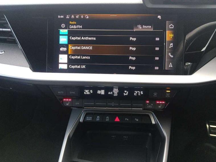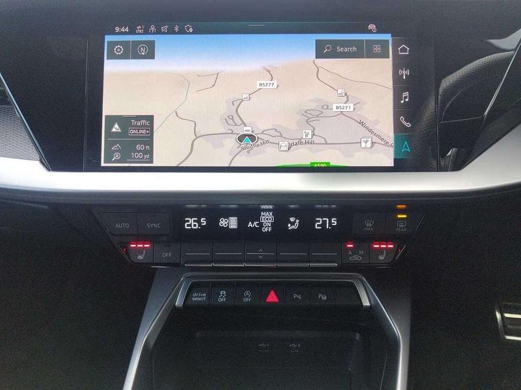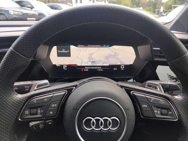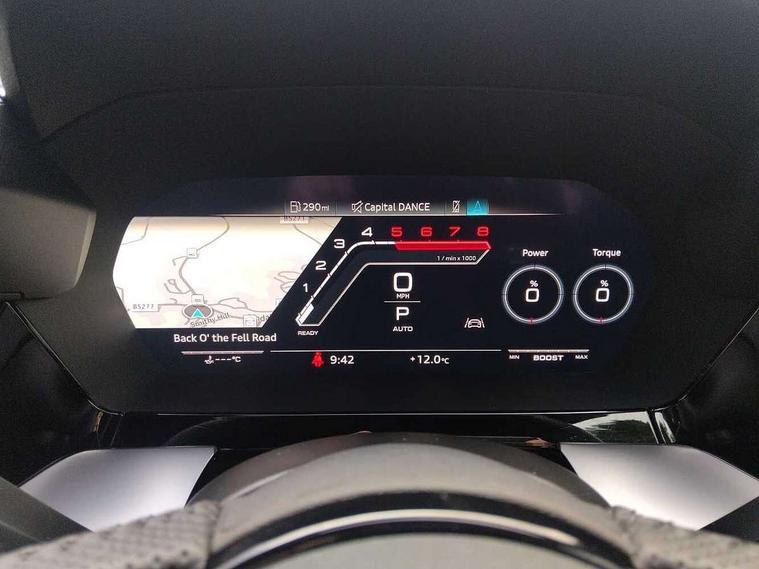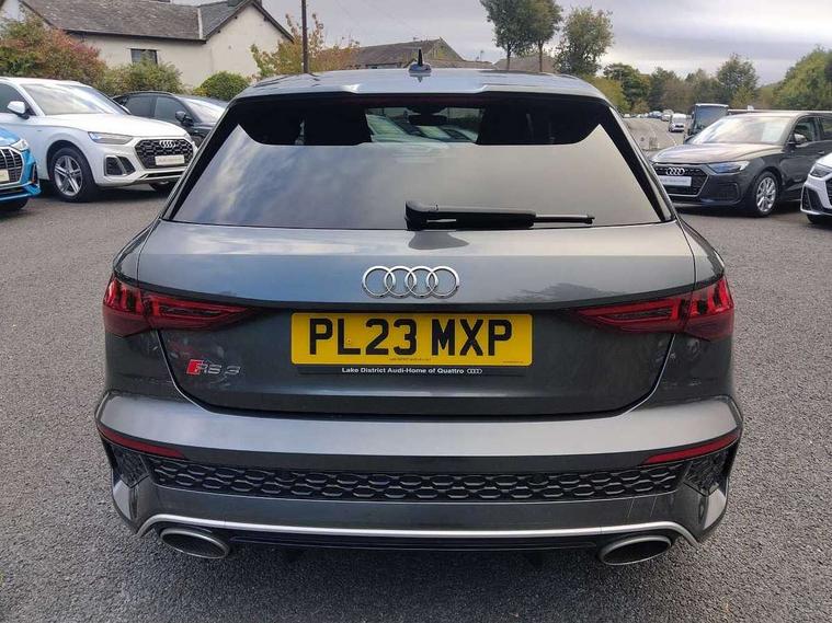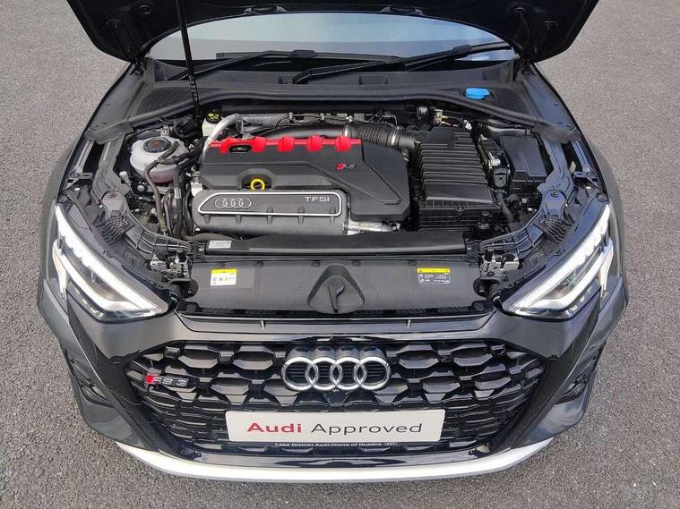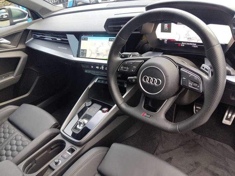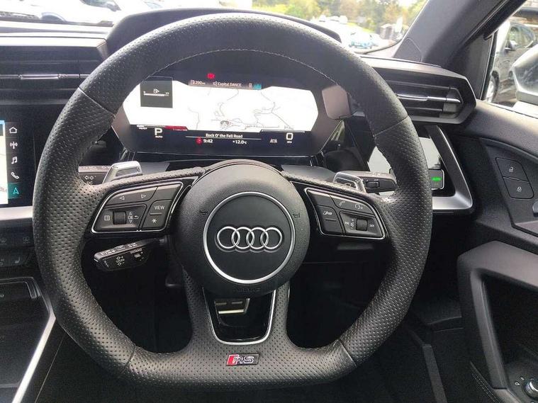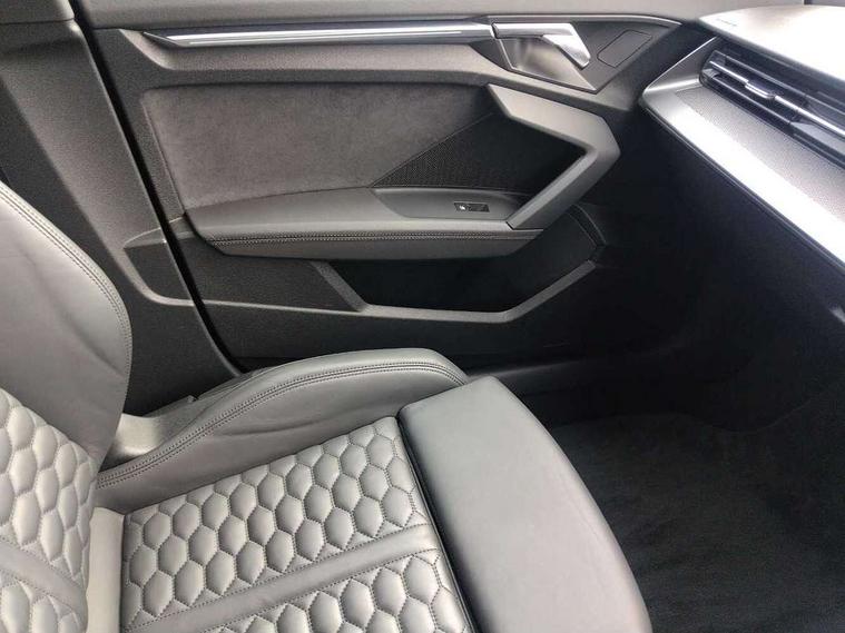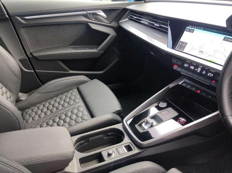 Audi smartphone interface, Audi virtual cockpit with RS specific display 12.3" full colour digital instrument cluster, Automatic start/stop system with recuperation, Bluetooth interface, Collision avoidance assistant, Emergency e-call, Lane departure warning system, Legal emergency call, Manual boot opening, Parking assist with parking system plus, Progressive power assisted steering, Quattro permanent four wheel drive, Rear suspension, Audi sound system impressive sound with 10 loudspeakers including centre speaker and subwoofer, 6-channel amplifier with a total output of 180 watts, DAB Digital radio, 3rd brake light, Acoustic glass windscreen, Audi beam uses LEDs to project the Audi sport logo onto the ground as you exit your RS 3, Auto dimming rear view mirror, Black side skirts, Body colour roof, Daytime running lights, Door mirrors - electrically adjustable, heated, folding and auto dimming on both sides, Headlight washers, LED headlights with LED rear lights + dynamic rear indicators, Light and rain sensors, Matt aluminium door mirrors, Matt aluminium window trims, Privacy glass - dark tinted rear and rear side windows from B-pillar backwards, Rear side wing doors, Rear window wiper and washer system, 3 seat bench in 2nd row, 40/20/40 split folding rear seat bench, Black cloth headlining, Dual zone electronic climate control, Front and rear headrests, Front centre armrest, Front sports seats RS embossed logo, Front/rear floor mats, Heated front seats, Honeycomb stitching and RS embossing, Illuminated door sill trims inlays in aluminium with RS 3 logo, Illuminated vanity mirror, Manually adjustable front seats, RS emblems, Single front passenger seat, Stainless steel pedals and front footrest in black, Aluminium interior elements pack - RS3, Ambient lighting pack - RS3, MMI navigation plus with MMI touch - RS3, RS bodystyling - RS3, Storage Pack - RS3, 3x3 point rear seat belts, ABS/EBD, ASR, Audi pre sense front, Driver/Front Passenger airbags, EDL, ESC - Electronic Stability Control + traction control, Front passenger airbag deactivation, Front side airbags with head airbags and interaction airbag, Hill hold assist, Seat belt reminder with passenger presence detection in rear, Tyre pressure loss indicator, Warning triangle and first aid kit, Anti theft alarm, Anti-theft wheel bolts, Electronically operated child lock, Remote control central locking, Carbon inlays, accent surfaces in the dashboard and centre console in platinum grey silk effect paint finish, 19" 10 Y spoke platinum grey, gloss turned finish alloy wheels, Tool kit, Tyre repair kit,