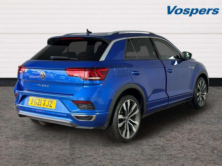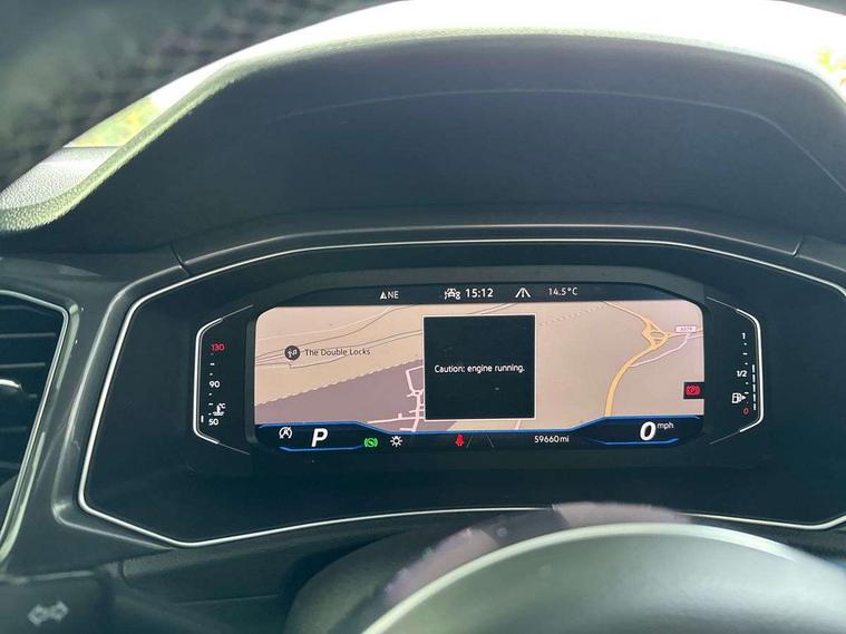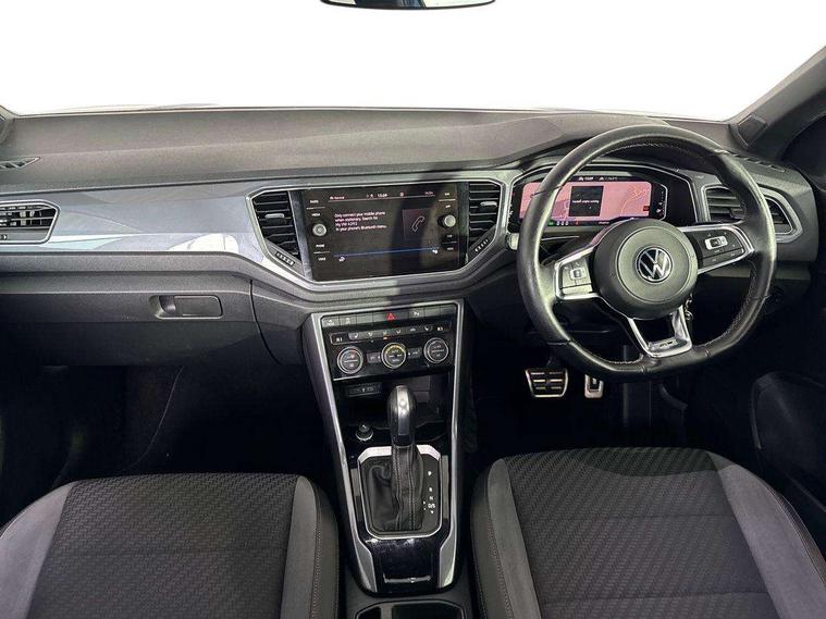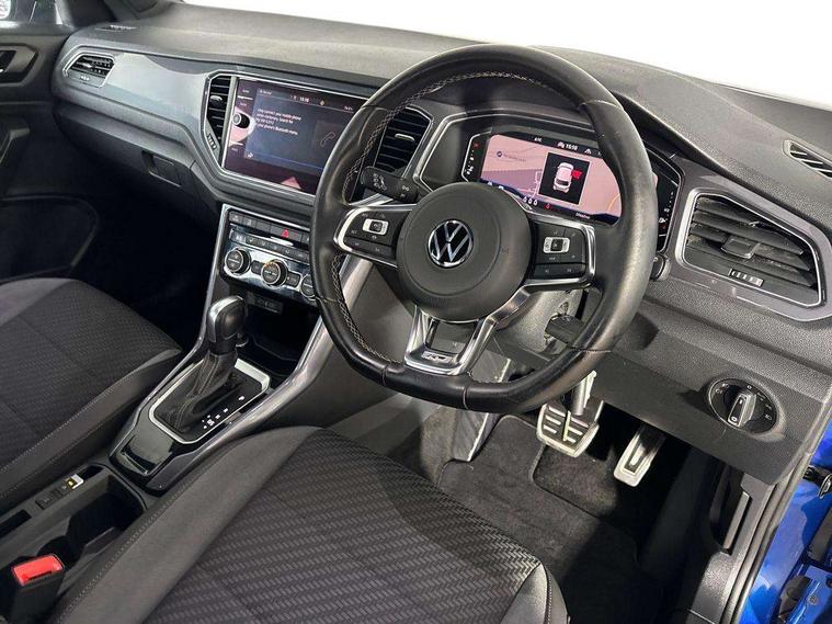 'Lights On' Reminder warning buzzer, Adaptive cruise control, Bluetooth telephone and audio connection for compatible devices, Car information display, Digital Cockpit Pro - Active info display, Driver alert system with audible and visual fatigue detection system, Driver tips and journey analysis, Emergency call service, Lane assist with warning text instrument cluster, Modified key software - reduce switch off time for key status change to Long no motion, Multifunction camera, Multifunction computer with visual gear change recommendation for fuel consumption, Navigation system discover media including streaming and internet, Service interval indicator, Think blue trainer driver tips and journey analysis, Traffic sign recognition, Voice activation, Warning sound and light for front seatbelts unfastened, Wireless app connect for apple carPlay, Battery regeneration during braking, Rear shock absorption for sports version, Start/stop function with battery regeneration, DAB Digital radio, Disk brakes in front, Diversity antenna for FM reception, Music playback - MP3, WMA and AAC files, Premium USB cable in choice of either Apple or Android smartphone compatibility, SD card slot, Simultaneous pairing of 2 compatible mobile devices, SMS functionality - read, compose and send SMS messages using touch-screen display, Storage compartment with longitudinal and height adjustable in armrest and two rear air vents, Three route options - Fast, Short, Eco, Title and cover art display, USB-C Interface and USB charging socket, Auto dimming interior rear view mirror, Automatic coming/leaving home lighting function and daytime running lights, Automatic hazard lights activation under emergency braking, Black grained lower door protectors, Body colored door lower parts, Body colour door handles, Body colour rear roof spoiler, Chrome effect left and right trapezoid exhaust tailpipe fascia surround, Chrome plated moldings, Chrome plated roof rails, Chrome trim on upper and lower radiator grille, Dusk sensor, Dynamic headlight range control with self adjusting whilst driving, Electrically foldable, adjustable and heated door mirrors with puddle lights and reverse activated kerb-view adjustment on passenger's door mirror, External USB type C socket and charging sockets, Front and rear electric windows, Front fog lights with static cornering function, Front windscreen wiper with intermittent wipe and 4 position delay, Fully galvanised body, Heated rear window, Heated windscreen washer jets, High level 3rd brake light, LED darkened rear light clusters, LED headlamps with automatic range adjustment and unique signature LED separate daytime running lights, LED rear number plate lights, LED tail lamp rear comination lamps, Privacy glass, R-Line design body coloured bumpers, Rain sensor, Rear tinted glass from B-pillar backwards approx 65% tinted, Rear wash/wipe with intermittent wipe setting, Volkswagen roundel, 12V socket in centre console storage area, 3 rear head restraints, 4 load lashing points in luggage compartment, Aluminium pedals, Black roof lining and sun visors, Branded points of interest, Carbon flag cloth upholstery, Chrome plated radiator grille inserts, air vent surrounds and light switch surrounds, Climate control - 2 zone electronic air conditioning with automatic air recirculation and allergy filter, Door and side trim panel, Door and side trim panel in foam film, insert in leatherette, Drawer under drivers seat, Front + rear carpet mats, Front centre armrest, Front cupholders x 2, Front seat back storage pockets, Front sports seats with R-Line logo on seat backrest, Glovebox, Heated front seats, Height adjustable front seats, Height/reach adjust steering wheel, Instrument lighting, white adjustable panel illumination, Interior light delay, Interior light in footwell, Isofix easy fit child seat preparation for 2 outer rear seats, Leather gearshift knob, LED interior light with switch off delay/dimmer and 2 front/rear LED reading lights, Load through provision with single cup holder when folded down, Luggage compartment cover, removable, Luggage compartment lighting, R Line badge, Scuff plates in door apertures, Split folding rear seat backrests with centre armrest, Stainless steel pedals, Storage compartment in left and right luggage area, Storage compartment in rear doors, Storage compartments in driver and front passenger doors, Sunvisors with illuminated vanity mirrors, Unique R Line door sill protectors, White ambient lighting, R line styling pack - T-Roc, Winter pack - T-Roc, 3 rear three point seatbelts, ABS, Curtain airbags, Driver and front passenger safety-optimised head restraints, Drivers and front passengers airbags with passengers deactivation switch, Drivers seatbelt reminder, Electronic parking brake with auto hold, Electronic stability control (ESC) includes ASR, EDL, EDTC and trailer stabilisation function, Front assist with city emergency braking and pedestrian monitoring, Front seat side impact airbags, Hill start assist, Predictive pedestrian protection, Rigid safety cell with front and rear crumple zones, Single tone horn, Three point height adjust front seatbelts + pretensioners, Tyre pressure loss indicator, Ventilated front and rear disc brakes, Volkswagen roadside assistance, Alarm with remote central locking and interior protection, Electronic engine immobiliser, Remote central locking with SAFELOCK, radio remote control with 2 remote control folding keys, Shadow grey decorative inserts in dash, centre console and door panel, 19" Suzuka alloy wheels with low rolling resistance tyres and anti wheel bolts,