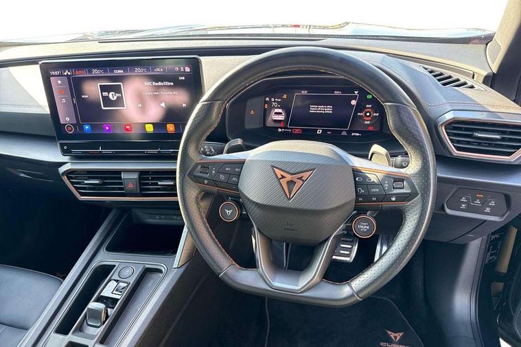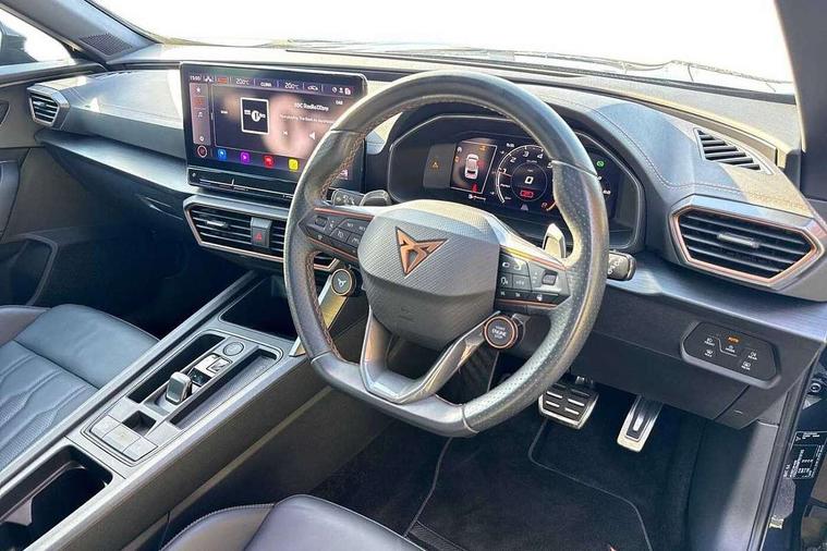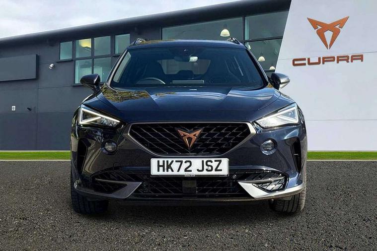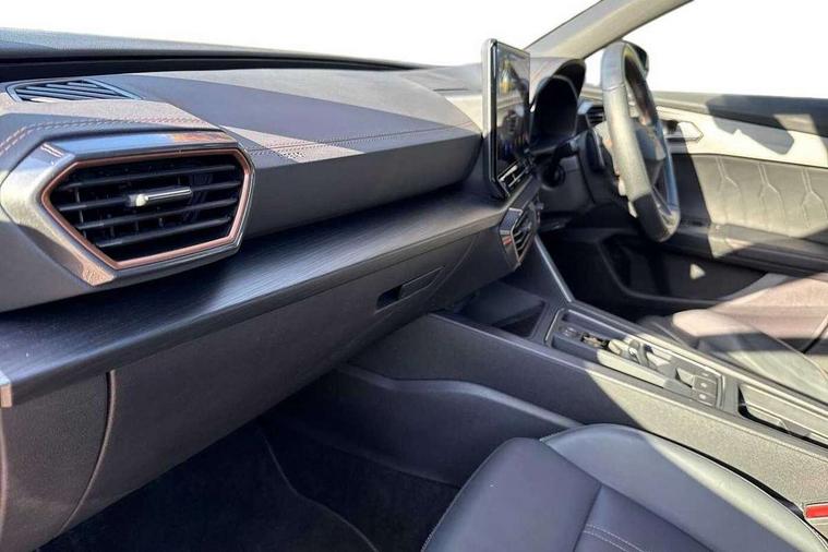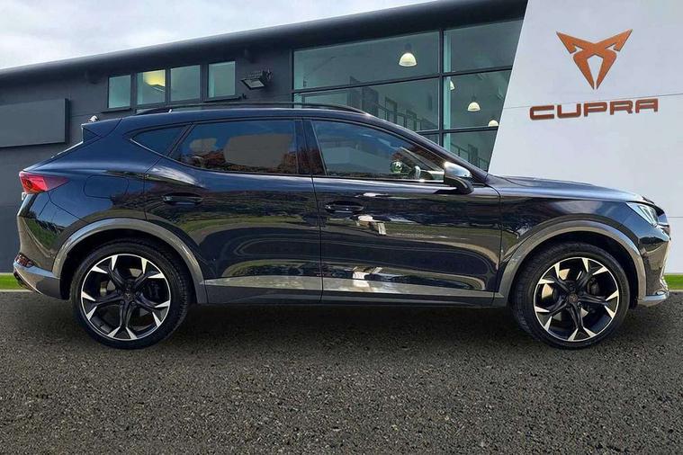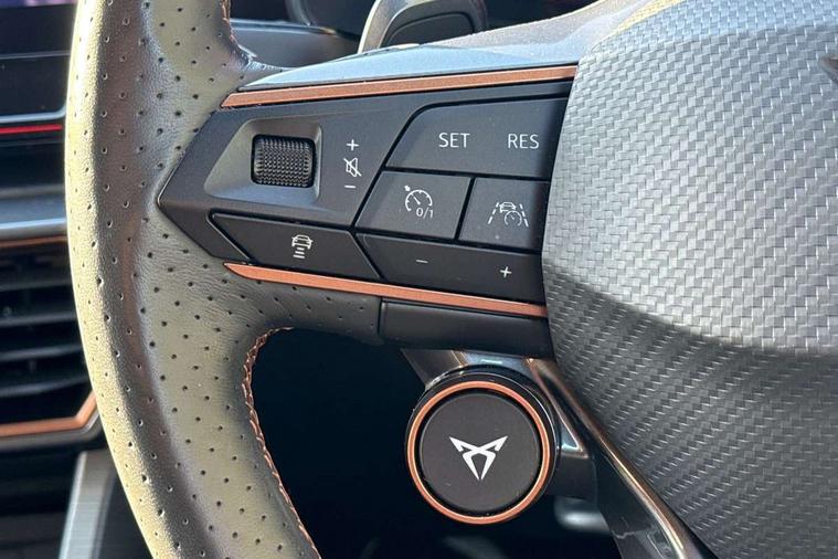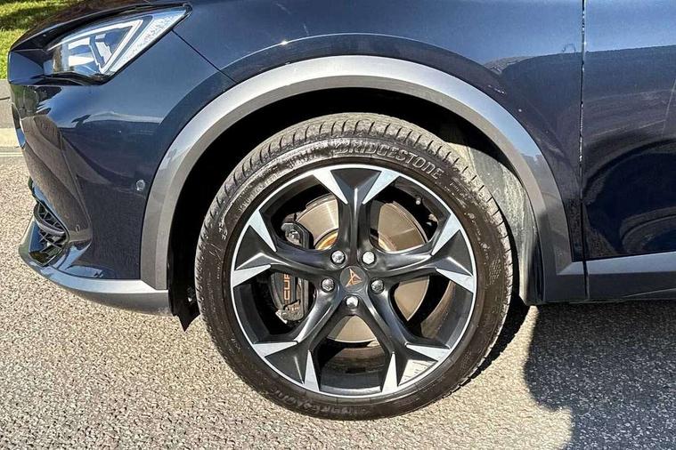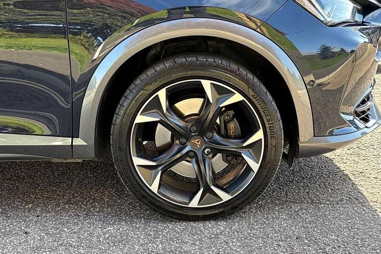 Digital cockpit and configurable dashboard, Driver alert system, Dynamic chassis control with driving profile selection (Comfort, Sport, CUPRA, Individual), Forward collision warning with automatic braking, Lane assist, Navigation system with 12'' Touchscreen Display, Park assist (inc front/rear parking sensors), Predictive adaptive cruise control with speed limiter, Rear view camera, RPM, trip computer, outside temp gauge, instrument light brightness, low fuel warning light, lights on reminder, gearshift indicator, Service interval indicator, Speed sensitive power steering, Start/stop system with regenerative braking, Virtual pedal and electric tailgate, Voice control system, Wireless apple carplay, Wireless phone charger, Electronic locking differential and dynamic traction support, Sports suspension with front shock absoption, 2 front and 2 rear USB type C sockets, Auxiliary input socket, DAB radio, Auto dimming rear view mirror, Body colour door handles, Body coloured bumpers, Dark grey wing mirror, Daytime running light with automatic headlight control and coming home feature, Dynamic headlight range control, Electric front/rear windows, Electrically adjustable heated and folding door mirrors with memory function, Front fog lamps with cornering function, Gloss black roof rails and window surrounds, LED Headlights, LED Taillights with dynamic indicator, Rain sensing wipers, Rear diffuser with twin exhaust pipe on each side, Rear side wing doors, Rear wash/wipe, Sports bumpers, Third brake light, Tinted rear windows, VZ logo rear badging, Welcome lights, 12v power supply in centre console, 12V socket, 12v socket in loadspace, 2 front and 2 rear reading lights, 230V socket, 3 seat bench in 2nd row, 60/40 split rear bench seat with armrest and mechanical seat release, Black headlining, Cupra sports pedals, Dust/pollen filter, Front and rear head restraints, Front centre armrest, Height/reach adjust steering wheel, Illuminated interior front door sills, Illuminated sunvisor with mirror, Isofix, Leather heated multi-function sports steering wheel with start stop, CUPRA mode button and gear shift paddles, Luggage tie-down hooks, Single front passenger seat, Three zone climate control with control panel in rear, Variable luggage/load compartment floor, Wraparound lighting, Genuine Nappa leather Pack - Cupra, Safety and driving pack (XL) - Formentor, 3 point seatbelts on all rear seats, ABS, Brake control system - ESC and brake booster, Child proof door locks, Driver and front passenger airbags with front passenger airbag de-activation, Electronic parking brake, Front and rear disc brakes, Front side curtain airbags, Hill hold control, Public e-call, Seat belt reminder for front and rear seats, Tyre pressure monitoring system, Anti theft alarm system, Keyless entry and start system (KESSY), Locking wheel bolts, Copper and aluminium interior detailing, 19" 'Exclusive' machined sport matte black and silver alloy wheels, Space saver spare wheel,