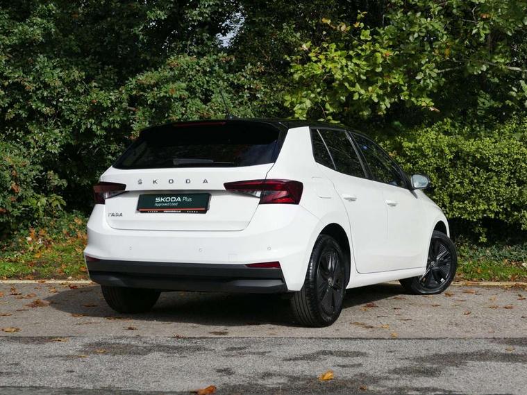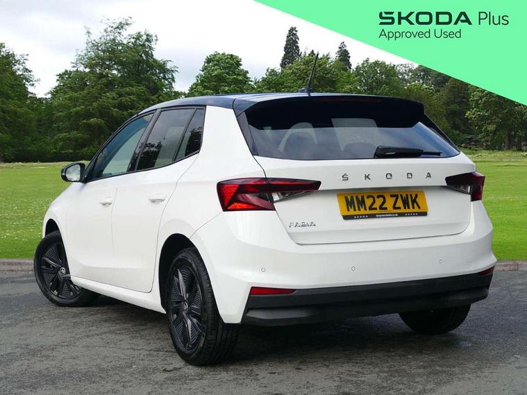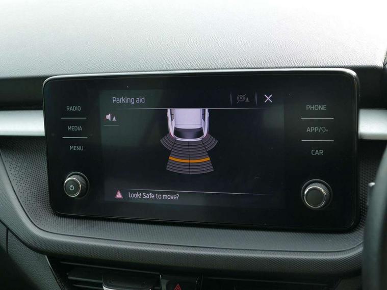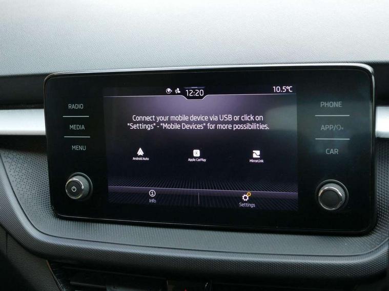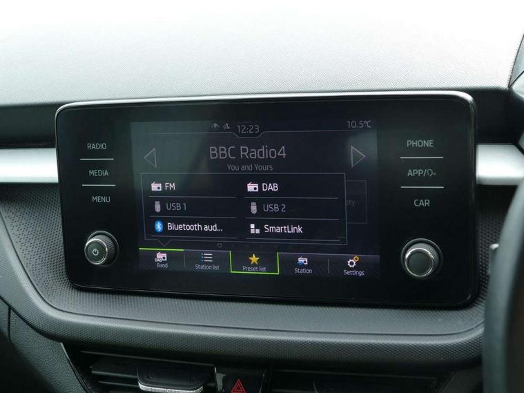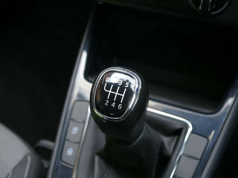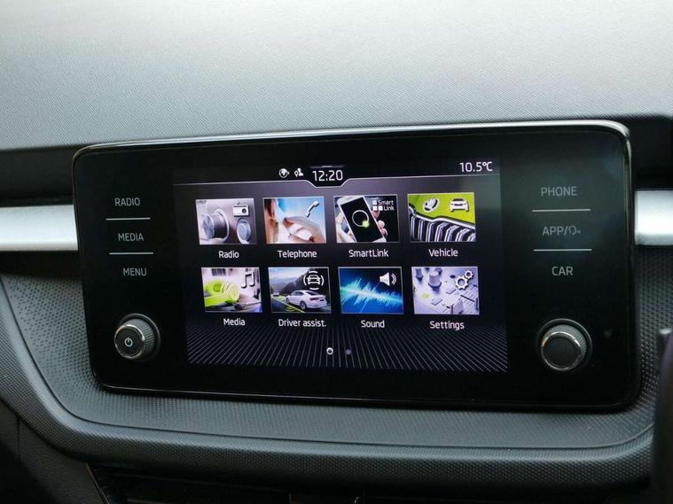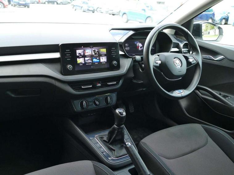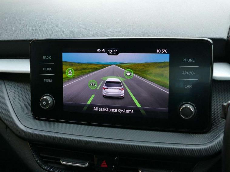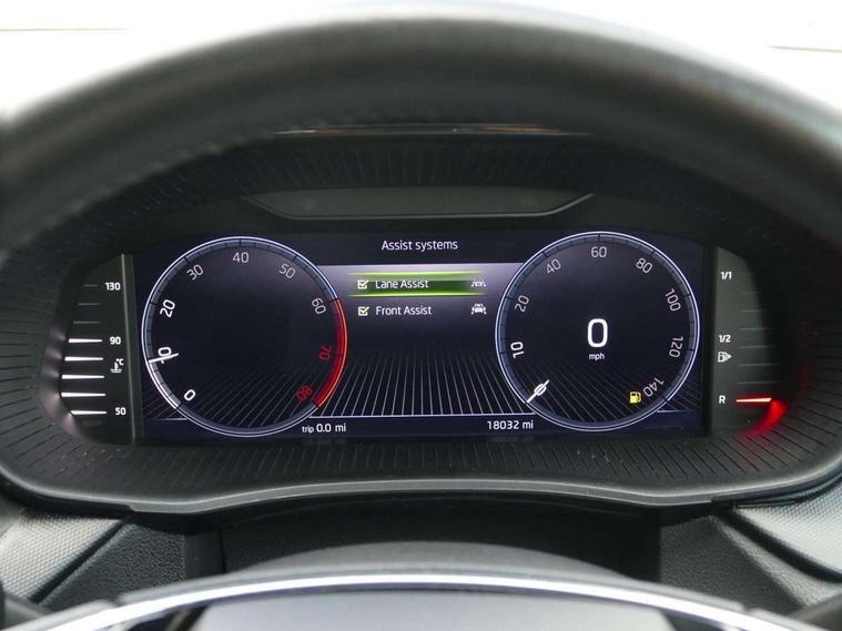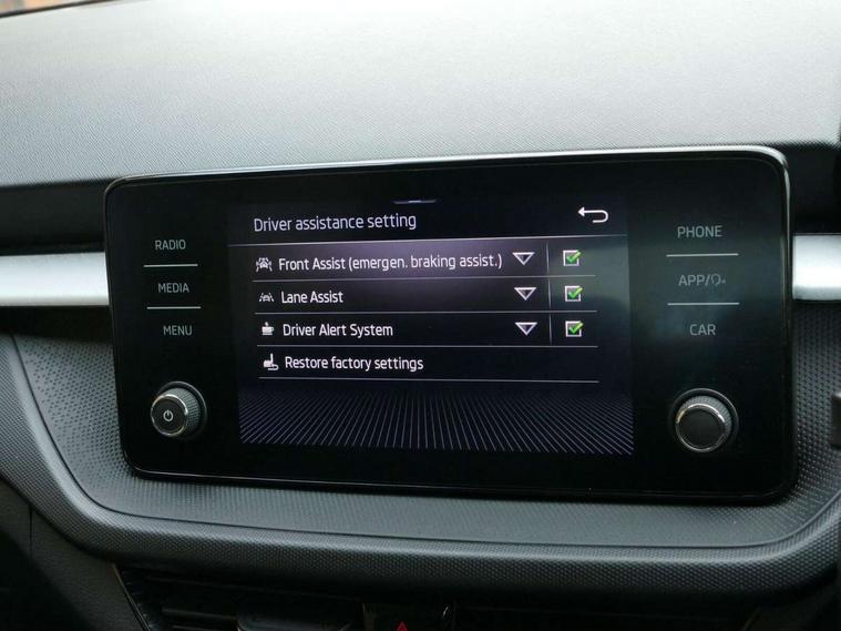 Bluetooth connection, Driver alert system - DAS, Electromechanical power steering, Exterior temperature gauge, Lane assist including road edge detection, Service interval indicator, Virtual cockpit with 10.25" colour display, 2x USB-C in the front (for data transmission and charging), 6 Speakers (4 in front and 2 in rear), Auxiliary socket for external MP3 player, Bolero radio with 8" colour display, DAB digital radio reception, Basic rear lights, Body coloured bumpers, Dimming rear view mirror with black frame, Door mirror integrated indicators, Electrically adjustable and heated door mirrors, Electrically adjustable front windows with function auto up/down, Front window wiper intermittent control, Headlight range control - Automatic, Ice scraper in fuel cap, LED daytime running lights with coming and leaving home feature, Mechanical adjustable rear windows, Privacy glass, Rear LED fog light, Rear side wing doors, Rear window wiper with washing nozzles, Roof mounted spoiler, SKODA tailgate lettering in chrome, Third brake light, 3 rear headrests, Backrest split and folding, Central console with fixed cup holder and storage box, Chrome handbrake release button, Fabric upholstery, Gearshift knob/handle in leather, Grain satin black interior door handles, Hand brake lever handle in leather, Height adjustable front headrests, Height adjustable steering wheel, ISOFIX and TopTether anchorage points to the outer rear seats, ISOFIX and TopTether on the front passenger seat, Luggage compartment lighting, Pollen filter, Rear seat bench unsplit, Single front passenger seat, Storm grey headlining, Sun visors with mirror and airbag label on passenger side, Ticket holder, Umbrella in drivers door, 3-point height adjustable front seats belts with pretensioner and force limiter, Automatic warning lights in case of crash, Driver and passengers airbag with switch off function, e-Call+, ESC including ABS, MSR, ASR, EDS, HBA and XDS, Front and rear seat belt warning, FRONT ASSIST (AEB City and AEB Inter Urban), Front side airbags, Head airbags, One tone horn, Pedestrian protection, Three rear 3-points safety seat belts with pretensioner and force limiter including stop function for outer rear seat belts, Tyre pressure monitoring system, Anti-theft alarm system including immobiliser, interior monitoring, backup horn, and towing protection, Anodized cross line upper decorative trim, Colour Edition air vents, Grain satin black central console cover, Grain satin black lower decorative trim, Satin black door and side trim panel in front, Anti-theft wheel bolts protection, Super-low rolling resistance tyres,