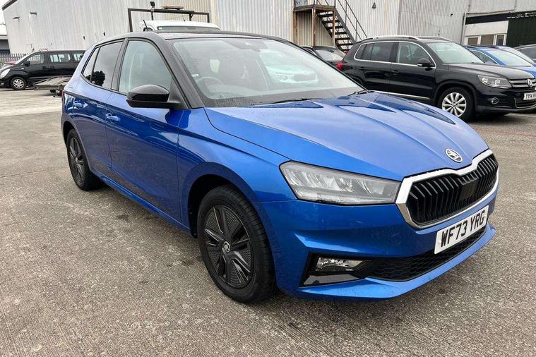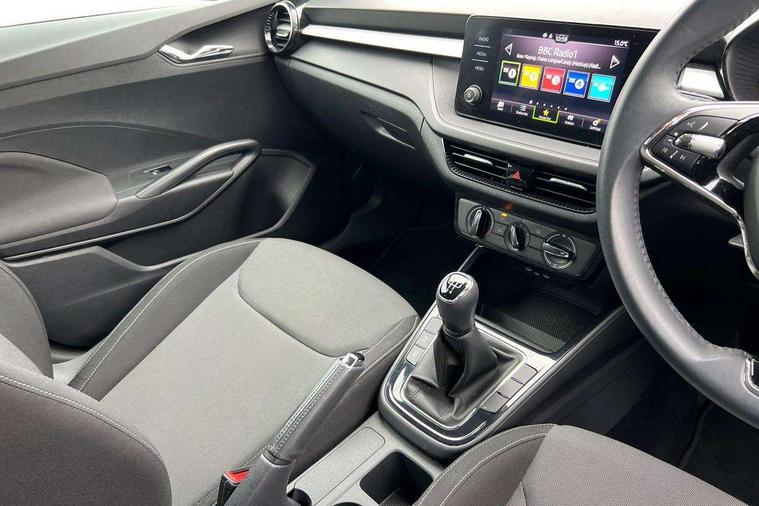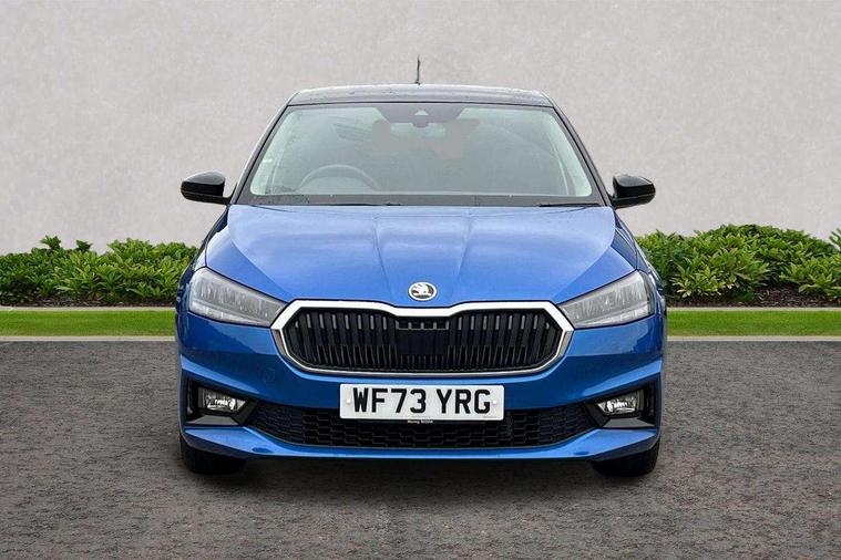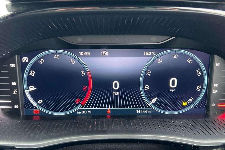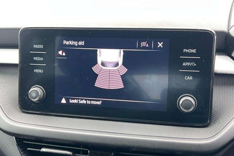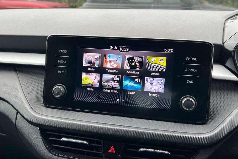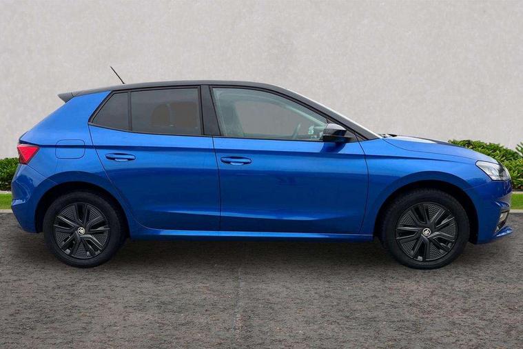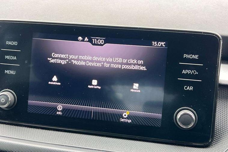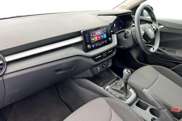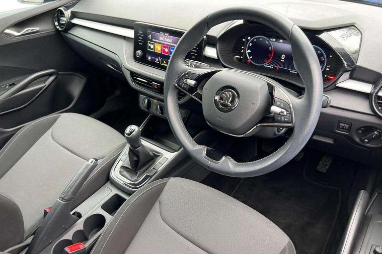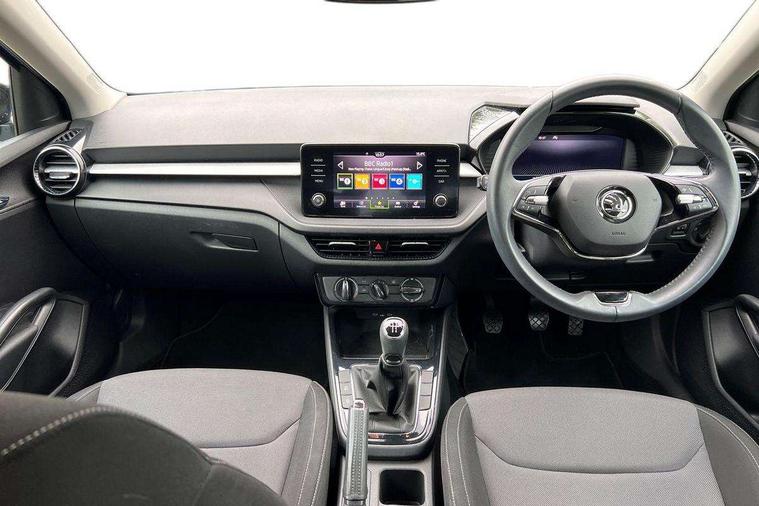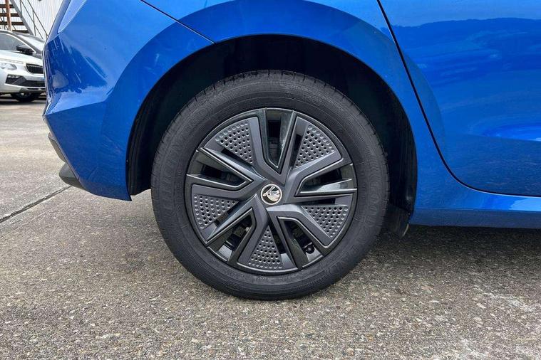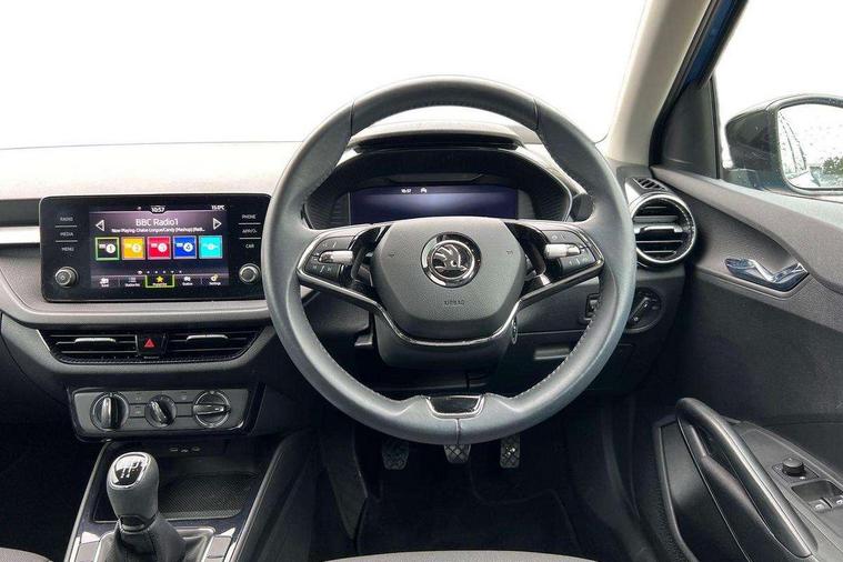 Bluetooth connection, Driver alert system - DAS, Electromechanical power steering, Exterior temperature gauge, Lane assist including road edge detection, Service interval indicator, Virtual cockpit with 10.25" colour display, 2x USB-C in the front (for data transmission and charging), 6 Speakers (4 in front and 2 in rear), Auxiliary socket for external MP3 player, Bolero radio with 8" colour display, DAB digital radio reception, Body coloured bumpers, Dimming rear view mirror with black frame, Door mirror integrated indicators, Electrically adjustable and heated door mirrors, Electrically adjustable front windows with function auto up/down, Front window wiper intermittent control, Headlight range control - Automatic, Ice scraper in fuel cap, LED daytime running lights with coming and leaving home feature, Mechanical adjustable rear windows, Privacy glass, Rear LED fog light, Rear side wing doors, Rear window wiper with washing nozzles, Roof mounted spoiler, SKODA tailgate lettering in chrome, Third brake light, 3 rear headrests, Backrest split and folding, Central console with fixed cup holder and storage box, Chrome handbrake release button, Fabric upholstery, Gearshift knob/handle in leather, Grain satin black interior door handles, Hand brake lever handle in leather, Height adjustable front headrests, Height adjustable steering wheel, ISOFIX and TopTether anchorage points to the outer rear seats, ISOFIX and TopTether on the front passenger seat, Luggage compartment lighting, Pollen filter, Rear seat bench unsplit, Single front passenger seat, Storm grey headlining, Sun visors with mirror and airbag label on passenger side, Ticket holder, Umbrella in drivers door, 3-point height adjustable front seats belts with pretensioner and force limiter, Automatic warning lights in case of crash, Driver and passengers airbag with switch off function, e-Call+, ESC including ABS, MSR, ASR, EDS, HBA and XDS, Front and rear seat belt warning, FRONT ASSIST (AEB City and AEB Inter Urban), Front side airbags, Head airbags, One tone horn, Pedestrian protection, Three rear 3-points safety seat belts with pretensioner and force limiter including stop function for outer rear seat belts, Tyre pressure monitoring system, Anti-theft alarm system including immobiliser, interior monitoring, backup horn, and towing protection, Anodized cross line upper decorative trim, Colour Edition air vents, Grain satin black central console cover, Grain satin black lower decorative trim, Satin black door and side trim panel in front, Anti-theft wheel bolts protection, Super-low rolling resistance tyres,