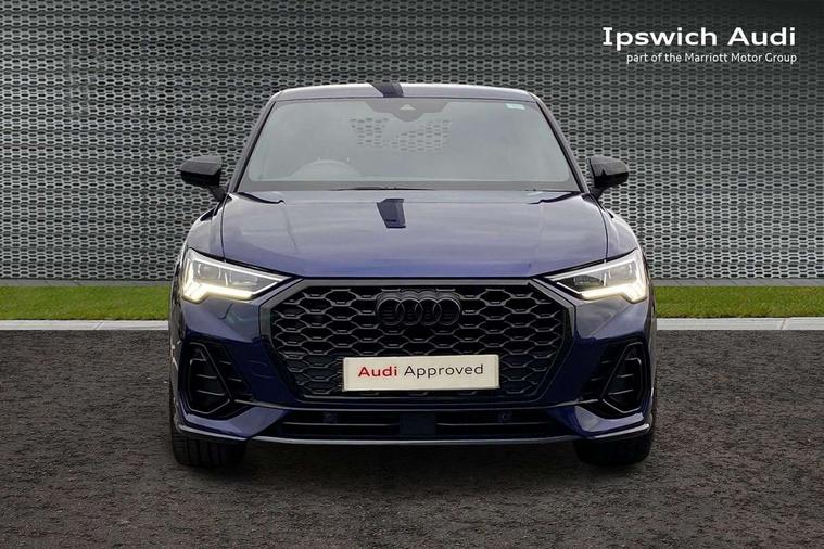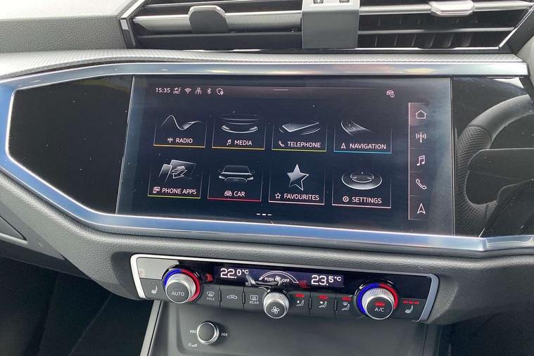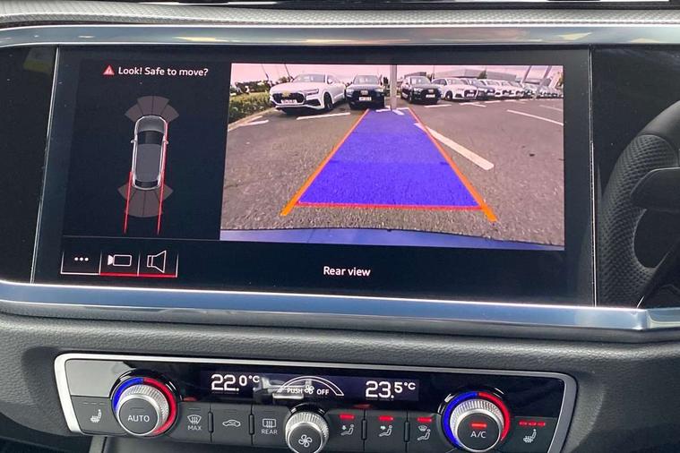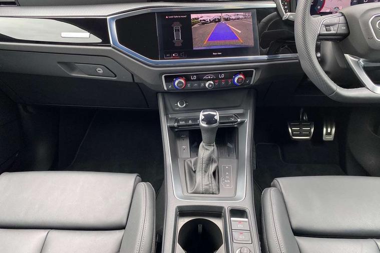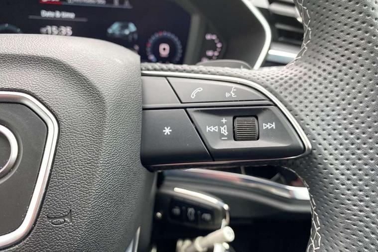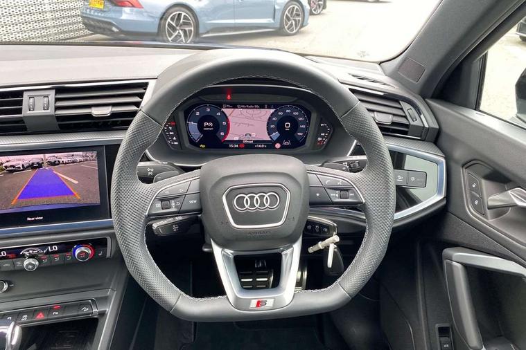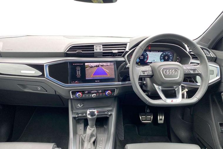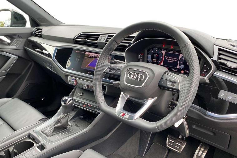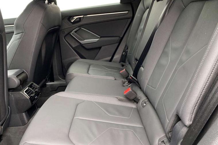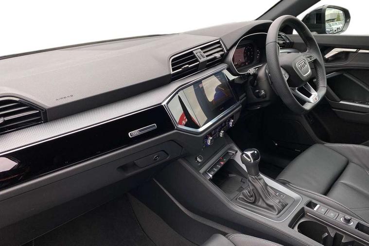 Audi connect safety and service, Audi drive select, Audi lane departure warning, Audi Virtual Cockpit - 10.25" display, Bluetooth interface, Camera based traffic sign recognition, Distraction and Fatigue warning, Legal emergency call, MMI Navigation Plus with high resolution 10.1 inch touchscreen colour display, Power operated tailgate, Progressive steering, Service interval indicator, Smartphone interface includes wireless Apple carplay/Android Auto, Start stop system with recuperation, Voice control system with natural language interaction, Diesel particulate filter, Sports suspension, 2 USB-C ports with charge and data functions, 6 passive loudspeakers, DAB digital radio module, Acoustic windscreen, Audi Beam uses LEDs to project the Audi logo onto the ground as you exit your Q3, Auto dimming door mirrors, Auto dimming frameless rear view mirror, Diffuser grille in grained matt black, Diffuser trim in selenite silver, Electrically folding, adjustable and heated door mirrors with integrated LED side indicators and kerb view function for passenger side, Front and rear electric windows, Front fog lights, Front underbody protection in manhattan grey paint finish, High gloss black finish B and C pillars, LED Dynamic rear indicators, LED headlights with LED daytime running lights, LED rear lights, LED third brake light, Privacy glass dark tinted rear and rear-side windows (from B-pillar backwards), Rain and light sensors, Rear side wing doors, Rear underbody protection in matt black, Rear wiper, S line front and rear bumpers and side skirts in contrasting Manhattan grey paint finish, Variable front intermittent wipers, 12V socket in rear centre console, 3 seat bench in 2nd row, 40:20:40 folding with manual adjustment for 60:40 forwards/backwards position and backrest angle, Adjustable rear seat bench/backrest with centre armrest and cupholder, Black cloth headlining, Dual zone electronic climate control, Electric lumbar support, Front and rear black floor mats with contrast stitching, Front and rear headrests, Front centre armrest, Height and reach adjustable steering wheel, Illuminated door sill trims with S logo, ISOFIX child seat mounting for front passenger with airbag deactivation and outer rear seat including top tether attachment point for outer rear seats, Luggage compartment sill protection in stainless steel, Manual front seats with height adjustment, Perforated leather gearknob, Single front passenger seat, Stainless steel pedals, Twin leather upholstery with front sport seats + S embossing, Black styling pack - Q3, Non smoking pack - Q3, 3x3 point rear seatbelts, 6 airbags - Driver, front passenger, curtain and side windows, Audi pre-sense front with pedestrain and cyclist recognition, Electrically operated child locks on rear doors, Electromechanical parking brake, Electronic stabilisation control including ABS, ASR and EDL, Front seatbelt reminder, Hill descent control, Hill hold assist, Pre sense basic, Seatbelt monitoring, Tyre pressure warning, Warning triangle and first aid kit, Anti theft alarm, Anti theft wheel bolts, Immobiliser, Remote central locking, Aluminium look interior elements, Detail dashboard around MMI touch colour display in glass look, black with surround in aluminium look, Leatherette door armrest, Piano black inlay,