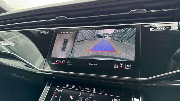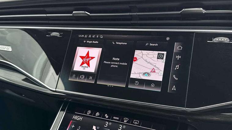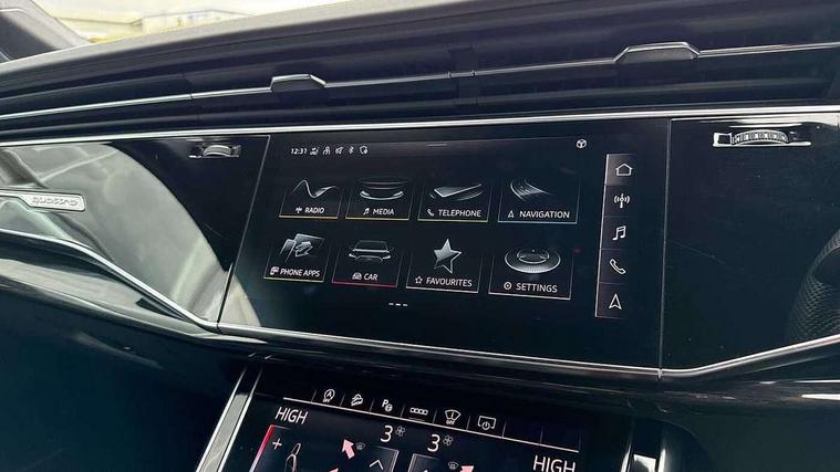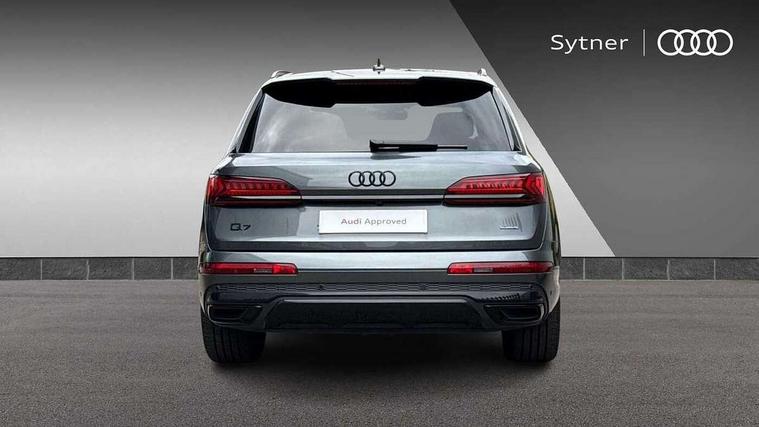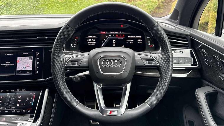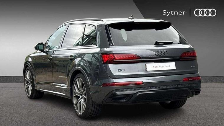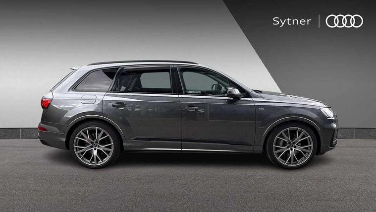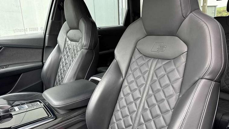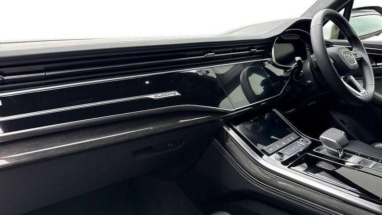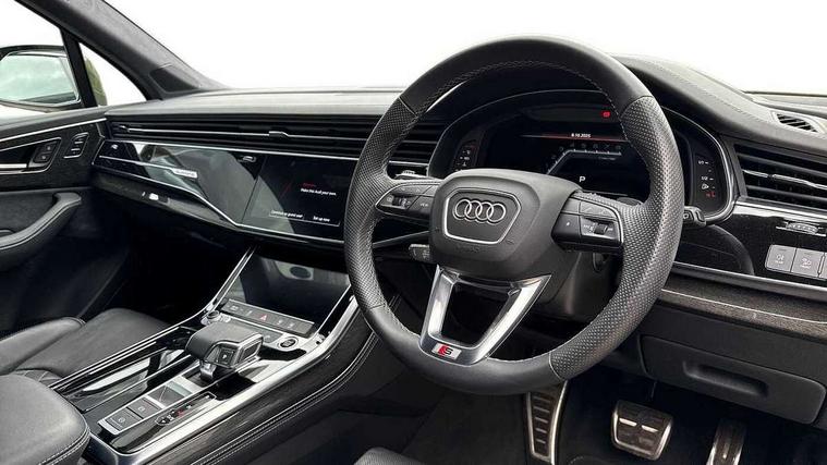 All wheel steering, Audi connect safety and service (e-call), Audi connect with Amazon Alexa Integration, Audi drive select (Auto, Comfort, Dynamic, Efficiency, Individual, Off-road and All road), Audi phone box light with wireless charging, Audi virtual cockpit plus, Bluetooth interface, Camera based traffic sign recognition, MMI navigation plus with MMI touch screens includes 10.1" and 8.6" screens with haptic feedback, Natural voice recognition, Power door closure, Power operated tailgate, Smartphone interface includes wireless Apple carplay/Android Auto, Start/stop system, 48V Mild hybrid technology, 85 litre fuel tank, Adaptive air sports suspension, Quattro all wheel drive with self locking centre differential, Audi music interface - front 2 USB-C ports with charger and data functions, DAB digital radio module, 3rd brake light, Adaptive windscreen wipers with integrated washer jets, Aluminium window trim, Audi Beam uses LEDs to project S emblem with red rhombus onto the ground when opening the side doors (front/rear), Audi HD matrix LED headlights with Audi laser light + dynamic front and rear indicators, Auto dimming frameless rear view mirror, Black roof rails, Bumpers in contrast paint scandium grey finish includes door trim and wheel arch trim strips, inlays in door strip contain quattro embossing, Electrically adj heated/folding + automatically dimming exterior mirrors with memory + automatic kerb side function for passenger side exterior mirror, Headlight washers, Heat insulating glass in windshield, Integrated LED indications in door mirrors, LED daytime running lights, LED rear tail lights, Privacy glass - dark tinted rear and rear side windows from B-pillar backwards, Rear side wing doors, Rear wiper, 2 seat bench in 3rd row, 3 seat bench in 2nd row, 3 spoke heated leather multi-function sport steering including paddle shift, 7 seat layout with ISOFIX points for the front passenger seat and rear passenger seat, Black dinamica headlining, Comfort front centre armrest, Double sun visors with illuminated vanity mirrors, Electric adjustable front seats/backrest bolsters, lumbar support, memory functionality, Electric steering wheel adjustment, Folding rear seats, Front head restraints, Front/rear floor mats, Heated front seats, Illuminated door sill trims with S logo, Luggage compartment sill protection in stainless steel, Manual sunblind for the rear side windows and manual sunblind for the rear window, Rear head restraints, Seat ventilation and massage function in the front, Single front passenger seat, Stainless steel pedals, Valcona leather upholstery with front super sport seat S embossed logo, Black styling pack plus - Q7, City assist pack - Q7, Extended leather pack - Q7, Multi-coloured extended LED Interior lighting pack - Q7, Technology Pack Pro - Q7, Tour pack with Adaptive cruise assist - Q7, 3 point seatbelts on all rear seats, Audi pre sense front, Child locks on rear doors, Driver and front passenger, front side and curtain airbags, Electromechanical parking brake, Electronic Stabilisation Control (ESC) including ABS, ASR and EDL, Extended pedestrian protection measures, Hill hold assist, Seatbelt monitoring, Tyre pressure loss indicator, Warning triangle and first aid kit, Anti theft alarm, Anti-theft wheel bolts and wheel loosening detection, Remote central locking, Polished oak trim with grey finish inlay, 22" 5-V Spoke aluminium star design audi sport matt grey with gloss turned finish alloy wheels, Tool kit, Tyre repair kit,