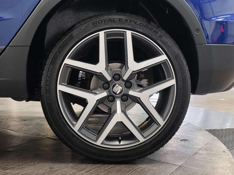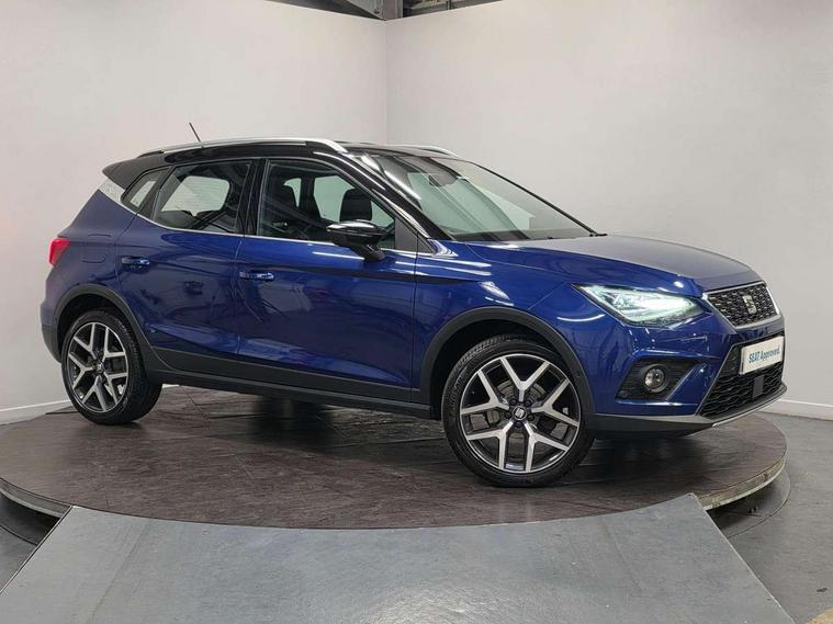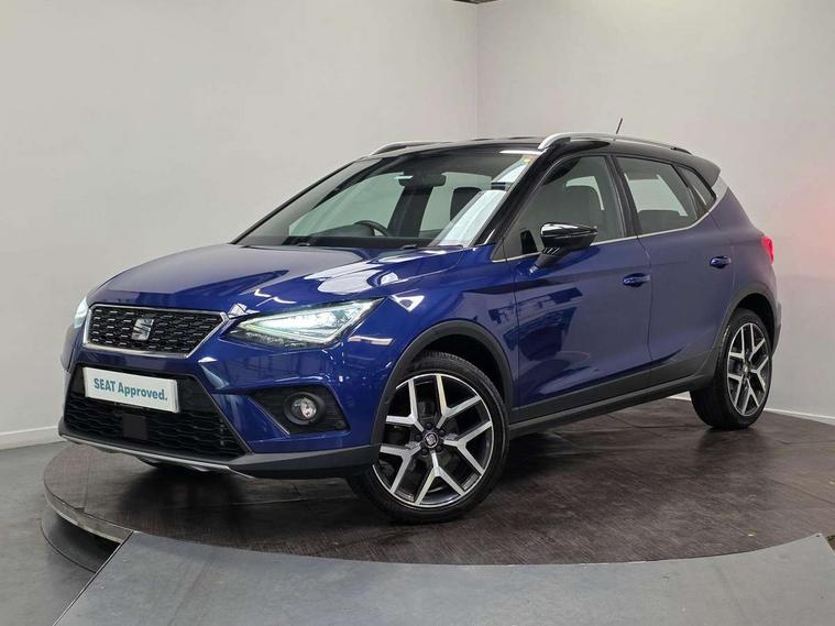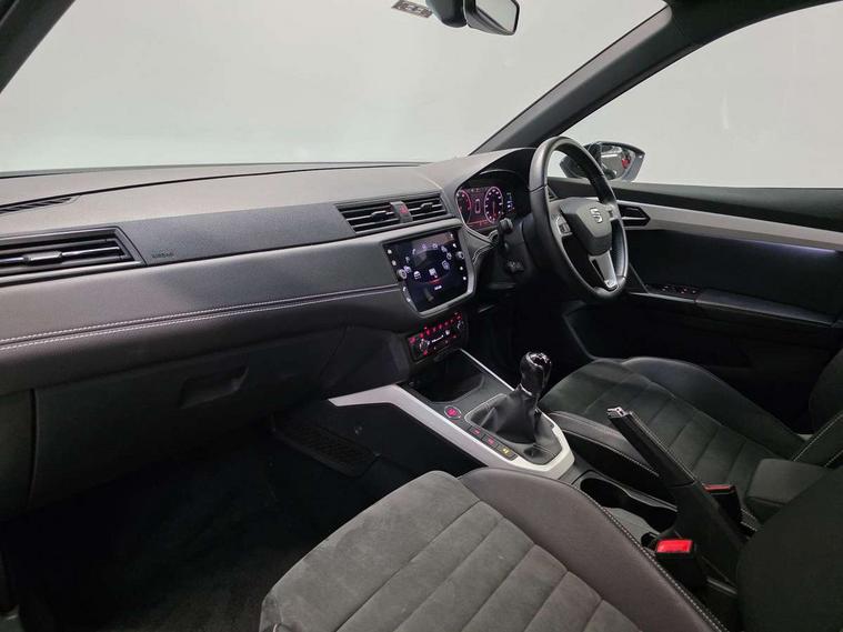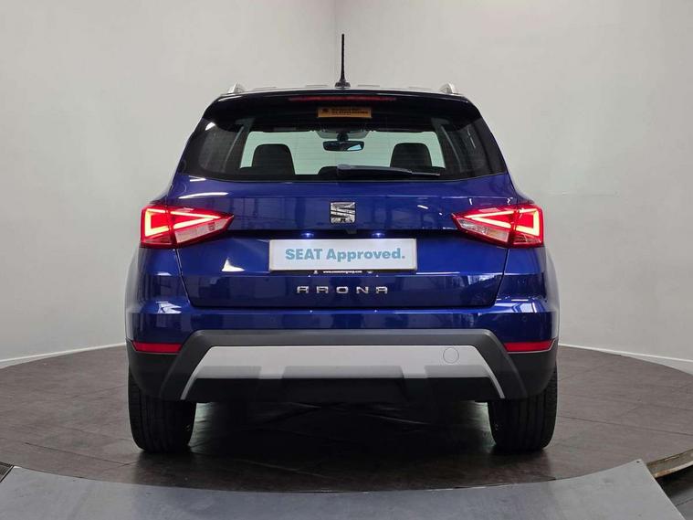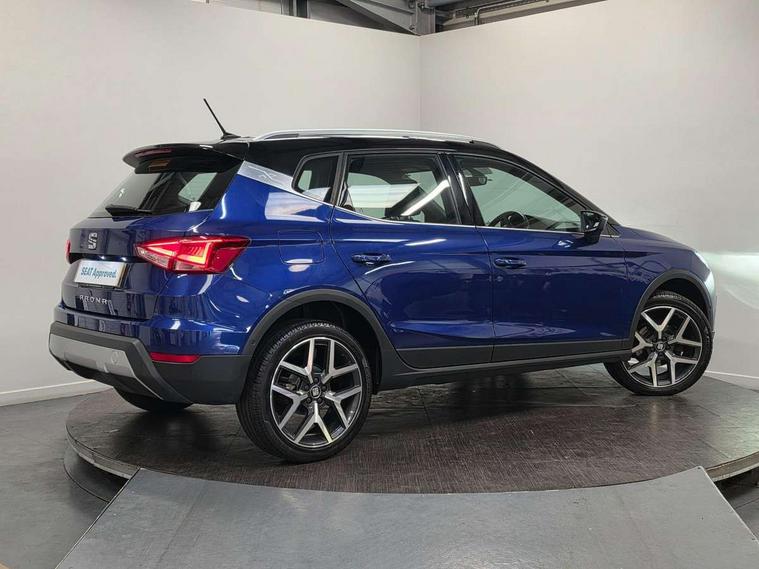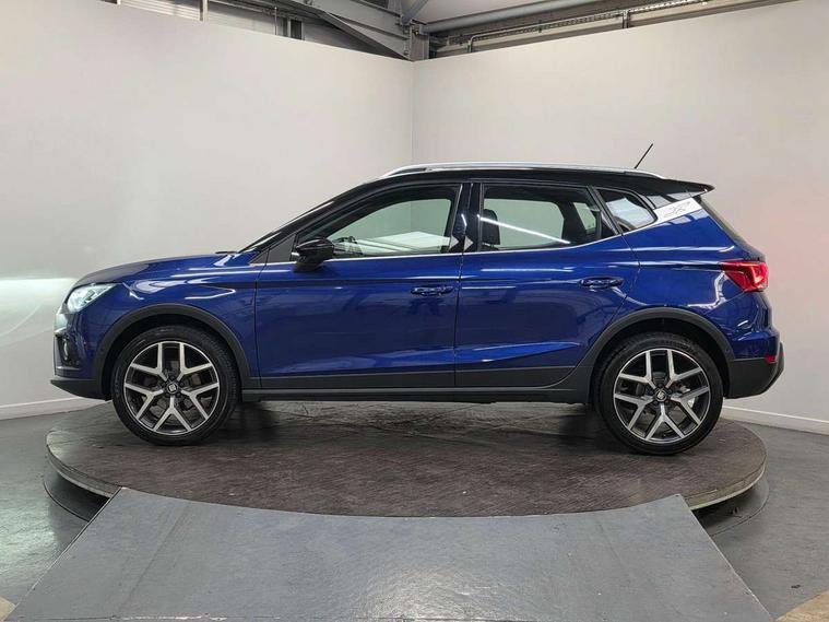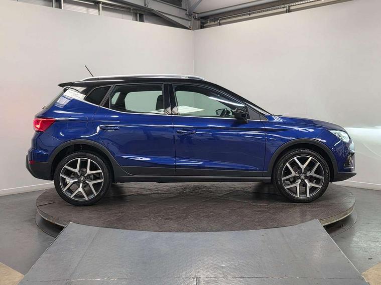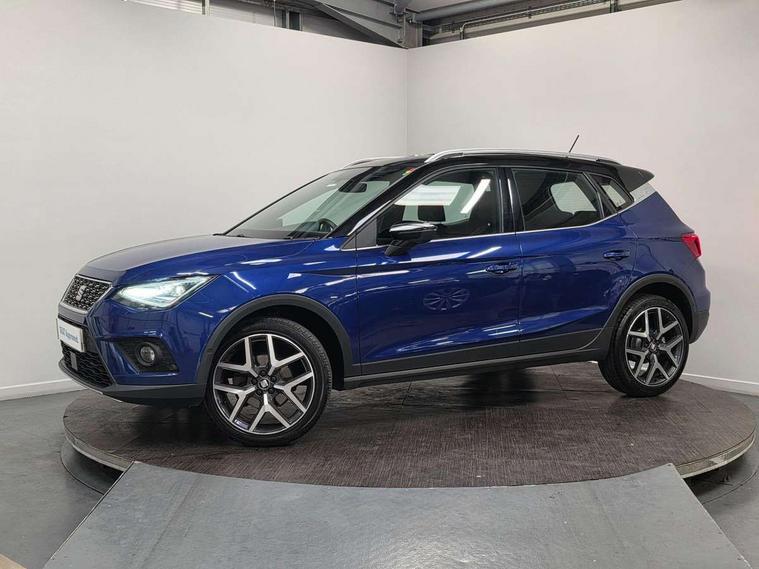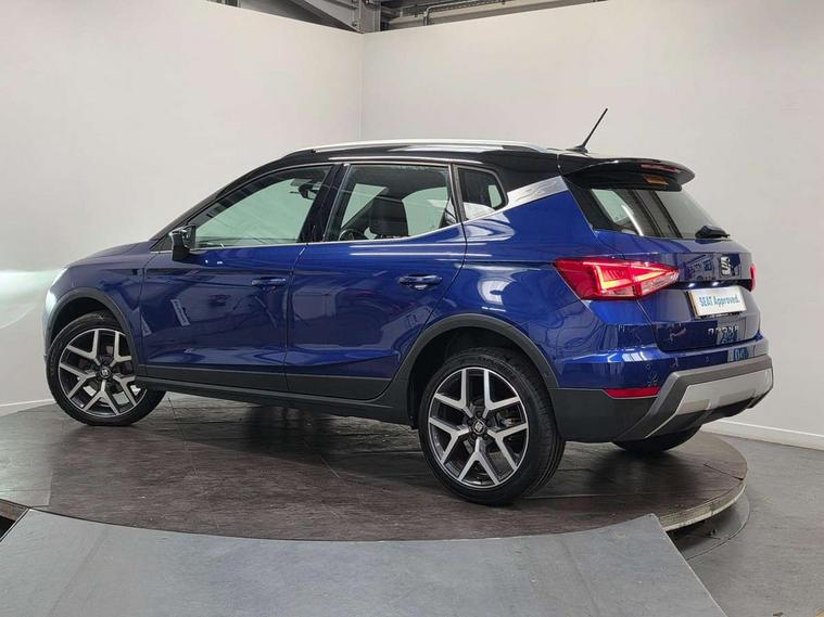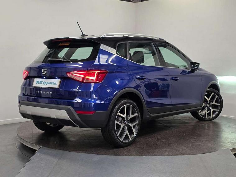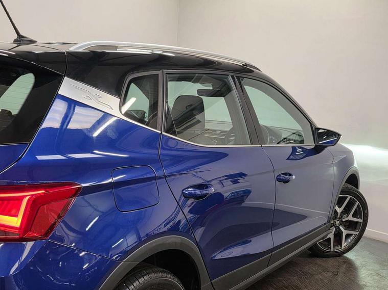 'Lights On' Reminder warning buzzer, Adaptive cruise control, Blind spot monitor, Digital clock, Digital cockpit, Electric speed sensitive power steering, Front assistant collision mitigation, Front parking sensor, Full Link Smartphone Integration with Mirror Link, Apple Car Play, Google Android Auto, Low fuel warning light, Outside temperature display, Park assist system, Rear cross traffic alert, Rear parking sensor, Rear view camera, RPM counter, SEAT Drive profile, Trip computer, Comfort suspension, 6 speakers, Bluetooth interface for hands free and audio streaming, DAB Digital radio, SEAT USB media cable, Steering wheel mounted audio controls, Anti theft roof antenna, Auto dimming interior rear view mirror, Automatic activation of hazard warning lights, Automatic headlights, Body coloured bumpers, Body coloured door handle inserts, Chrome grille bars, Chrome grille surround, Chrome roof rails, Chrome window surround, Coming/leaving home lighting function, Electric front/rear windows with one touch/auto up/down, Electrically adjustable and heated door mirrors, Electrically folding wing mirrors, Front fog lights, Full LED headlights, Hidden exhaust pipe, Ice metal door side panels, LED daytime running lights, LED licence plate lighting, LED tail lights, Rain sensor windscreen wipers, Rear fog lights, Rear window wash/wipe, Roof colour door mirrors, Visible VIN plate, Windshield wiper with intermittent control and potentiometer, 2 cupholders, 3 rear height adjustable headrests, 60/40 split folding rear seat, Active head restraints, Ambient interior lighting, Card holder, Double boot floor, Driver and passenger sunvisors, Driver/front passenger seat height adjustment, Dual zone climate control, Dust/pollen filter, Footwell ambient lighting, Front courtesy lights, Front seat and rear pockets, Gear shift indicator, Height/reach adjustable steering column, Illuminated boot, Instrument lighting with brightness control, Isofix attachments on rear seats, Leather handbrake, Leather steering wheel and gear knob, Microsuede cloth upholstery, Multi-colour ambient interior lighting, Connectivity pack plus - Arona, Storage pack - Arona, Winter pack - Arona, 3 point seatbelts on all rear seats, ABS+EBA, Child locks on rear doors, Driver/Front Passenger airbags, Electronic stability control, Front and rear seatbelt reminder, Front side/curtain airbags, Height adjustable active front headrests, Hill hold control + Tyre Pressure monitor, Multi-Collision braking, Passenger airbag deactivate switch, Tiredness recognition system, Traction control, 2 folding remote keys with window open/close function, Alarm with back-up horn, Immobiliser, Keyless entry and start, Locking wheel bolts, Remote central locking + deadlocks, Tow away protection, Interior chrome line trim, 18" Performance alloy wheels,