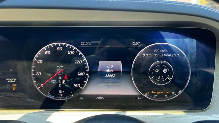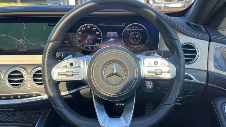 Active parking assist including parktronic and 360 degree camera, Analogue clock with Mercedes-Benz star, Attention assist, Bluetooth interface for hands free telephone, Collision prevention assist plus, Comand online HDD nav, colour display, 3d map, radio/MP3, speed limit assist, liinguatronic voice control, WLAN, SD card, 10GB music, media interface, Crosswind Assist, Digital operating instructions, Direct steering, Dual bonded 12.3" widescreen cockpit consisting of an instrument and media display, ECO start/stop function, Energizing Comfort interior theme program, Front wireless charging system for mobile devices, Mercedes me connect including emergency call system, accident recovery, breakdown and maintenance management, Near field communication, Outside temperature gauge, Rear seat belt status indicator, Remote boot lid release and closing, Service indicator (ASSYST), Smartphone integration with Apple CarPlay and Android auto, Soft closing aid for doors and boot lid, Traffic sign assist, Trip computer in multifunction displays showing current fuel consumption, Airmatic air suspension with adaptive damping system + level adjustment, Diesel particulate filter, Central controller dial to operate audio functions and telephone, DAB digital radio tuner, Two USB sockets in rear, Adaptive brake lights, AMG bodystyling front and rear aprons and side skirts, Automatically dimming rear view mirror and driver's exterior mirror, Body coloured bumpers, Electric adjustable/heated/folding door mirrors, Electric panoramic glass sunroof, Electric windows with pre-safe closing function, Grand edition badging on front wings, Green tinted glass, Headlight Assist and automatic headlight activation, Heat insulating dark-tinted glass starting from B-pillar, LED daytime running lights, LED tail lights, Magic vision control with adaptive heated windscreen wiper system, Mirror projection of brand logo, Multi beam intelligent LED headlight system with adaptive high beam assist plus and ultra range high beam, Rain sensing wipers with two stage, Rear black sill protector, Two pipe visible exhaust system with chrome tailpipe tips, 12V socket in front and rear centre console and boot, 2 cup holders in front and rear, 3 spoke multifunction sports steering wheel in black nappa leather with flattened bottom section, perforated grip area with touch control buttons, Ambient lighting with choice of 64 colour settings, AMG brushed stainless steel sports pedals with rubber studs, AMG floor mats with AMG lettering, Automatic child seat recognition sensor, Comfort ventilated front seats, Easy entry/ electrically adjustable steering column, Electrically lowering 3 rear head restraints, Front and rear illuminated vanity mirrors, Front seat backrests map pockets, Front seats full electric adjustment fore/aft/height, inclination and seat cushion adjustment, four way electric lumbar/height adjust head restraint, Front/rear centre armrests with stowage, Front/rear reading lights, Glasses stowage compartment, Heated front seats, Heated rear seats, Illuminated door sill panels, Illuminated/air conditioned lockable glove compartment, Load securing rings in boot, Parcel nets in boot and front passenger footwell, Pre-safe impulse seats, Steering wheel gearshift paddles, Thermotronic luxury automatic climate control and two zone with three climate modes, Air-balance pack - S Class, Executive equipment line - S Class, Front seat comfort pack - S Class, Front seat memory pack - S Class, Keyless Go comfort pack - S Class, Active bonnet pedestrian safety measure, Anti lock braking system (ABS) with brake assist, Brake pad wear indicator front brakes, Driver/Front Passenger airbags, Electric parking brake, Electronic stability programme with acceleration skid control, ESP curve dynamic assist, First aid kit, Front and outer rear seats seatbelt pre-tensioners with belt force limiters and automatic belt height adjustment, Front passenger seat with pre-safe positioning system, Front side airbags, Grey brake calipers with Mercedes Benz lettering, i-Size and ISOFIX Child seat fixing points in rear two outer seats, Pre-Safe anticipatory safety system, Three 3 point rear seatbelts, Tyre pressure monitoring system, Window airbags, Locking wheel bolts, Remote central locking, Thatcham category 1 alarm system with immobiliser and interior protection, Dashboard upper section in artico man-made leather, Designo trim - Open pore black ash wood trim, 20" AMG 10 spoke design alloy wheels painted in high gloss black, Tyrefit tyre sealant kit,