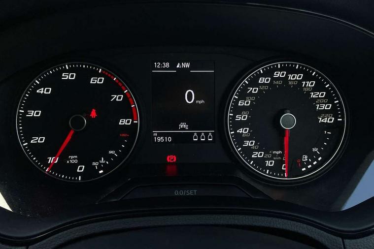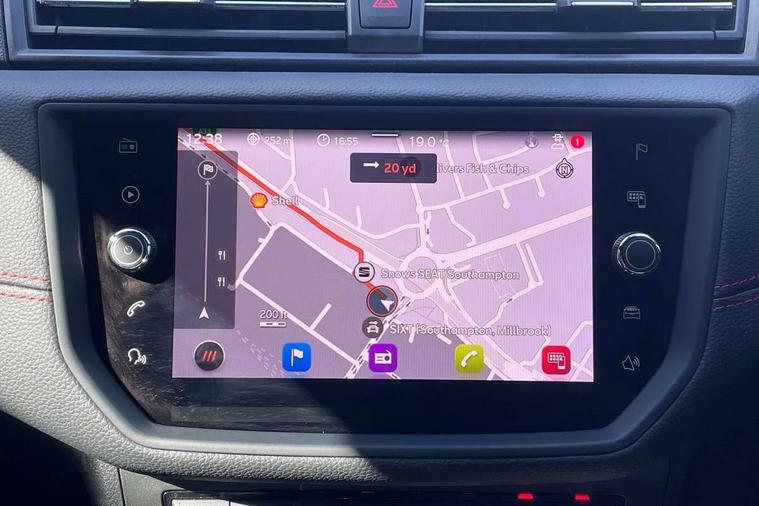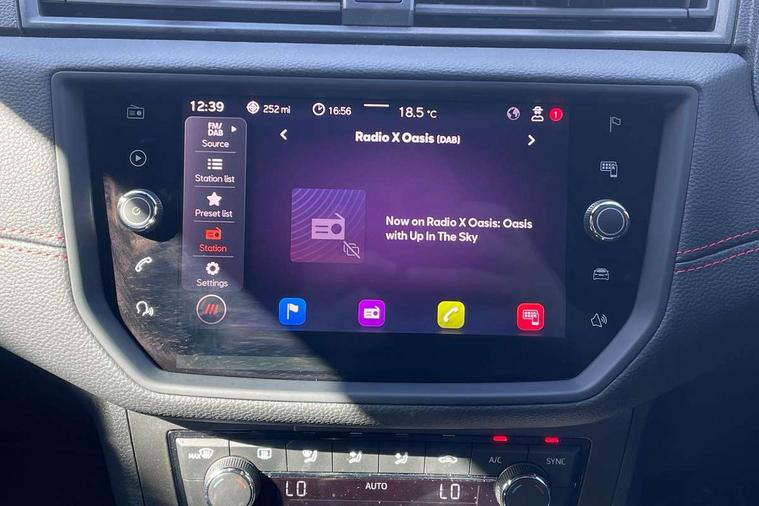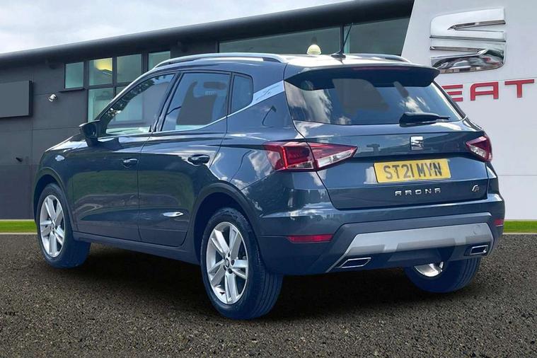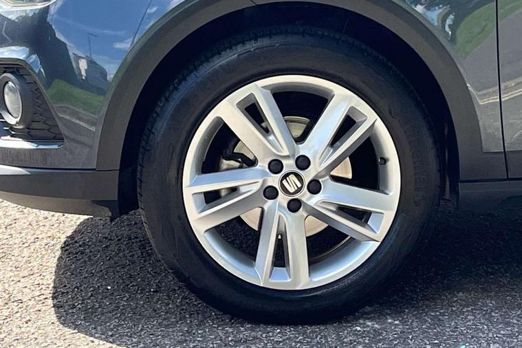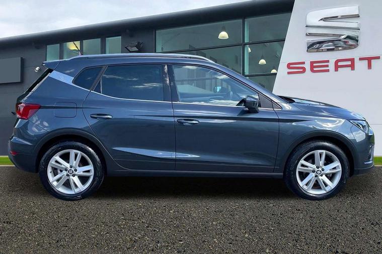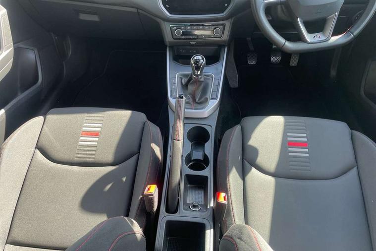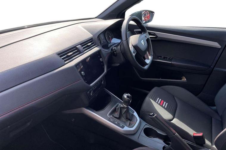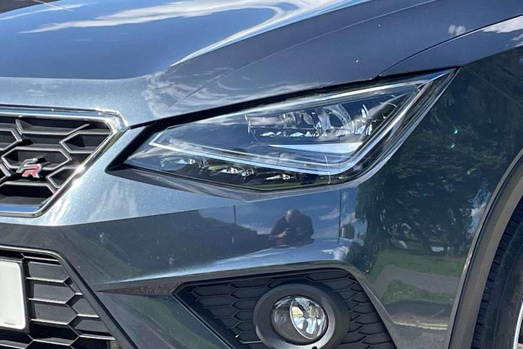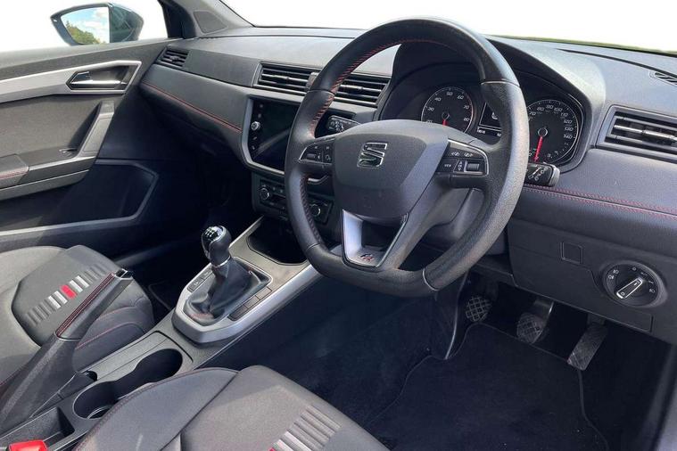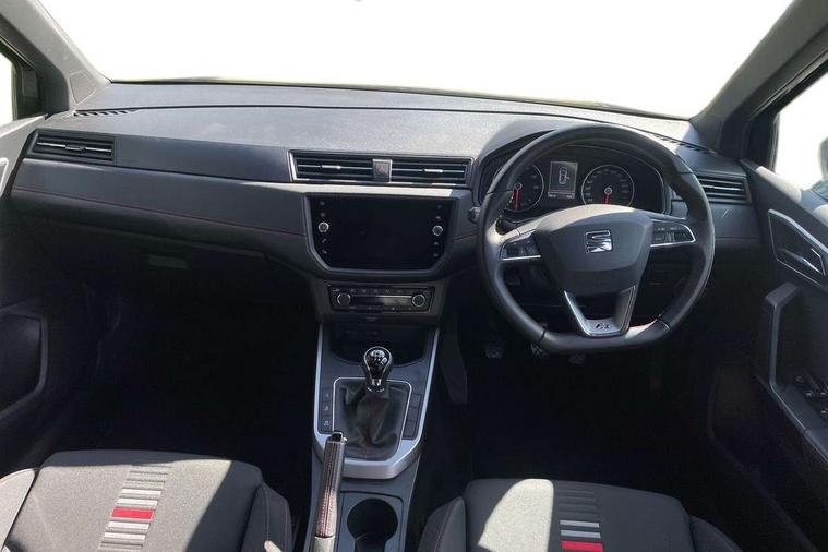'Lights On' Reminder warning buzzer, Cruise control and speed limiter, Digital clock, Electric speed sensitive power steering, Full Link Smartphone Integration with Mirror Link, Apple Car Play, Google Android Auto with USB Type C cable for Apple and Android compatibility, Low fuel warning light, Outside temperature display, Rear parking sensor, RPM counter, Seat connect with safety, service, remote and online, SEAT Drive profile - Four different models normal-sport-eco-individual, steering response, throttle response, Trip computer, Sports suspension, Bluetooth interface for hands free and audio streaming, DAB digital radio and AM/FM radio, Steering wheel mounted audio controls, Anti theft roof antenna, Auto dimming interior rear view mirror, Automatic activation of hazard warning lights, Automatic headlights, Body coloured bumpers, Body coloured door handle inserts, Chrome front grille frame, Chrome roof rails, Chrome window trim, Coming/leaving home lighting function, Dark tinted rear windows, Electric front/rear windows with one touch/auto up/down, Electrically adjustable, heated and folding door mirrors, Full LED headlights dipped and mainbeam + front and rear fog lights, LED daytime running lights, LED rear tail lights and licence plate lights, Protective side mouldings, Rain sensing wipers, Rear window wash/wipe, Roof colour door mirrors, Twin exhaust pipe styling hidden exhaust pipe, Visible VIN plate, Windshield wiper with intermittent control and potentiometer, 2 cupholders, 60/40 split folding rear seat, Aircare filter, Black interior roof, Double boot floor, Driver sunvisor with covered mirror + card holder, Dual zone climate control, Front courtesy light with front reading lights, Front sport seats, Gear shift indicator, Height adjustable front seats, Height/reach adjustable steering column, Illuminated boot, Instrument lighting with brightness control, Interior light in footwell, central console and door panel, ISOFIX points in outer rear seats with top tether anchorage points, Multi-colour ambient interior lighting, Nora cloth upholstery, Passenger sunvisor with vanity mirror, Perforated flat bottomed leather steering wheel/gear knob/handbrake with red stitching and FR logo, Two front and three rear height adjustable headrests, Connectivity pack plus - Arona, Interior chrome pack - Arona, 3 point seatbelts on all rear seats, ABS, Active front headrests, Child locks on rear doors, Driver and front passenger airbags with front passenger airbag de activation, front side and curtain airbags, Electronic stability control, Emergency Brake Assist (EBA) and front assist, Front and rear seatbelt reminder, Hill hold control, Multi-Collision braking, Tiredness recognition system, Traction control, Tyre pressure monitoring system, 2 folding remote keys with window open/close function, Alarm with back-up horn, Electronic engine immobiliser, Locking wheel bolts, Remote central locking + deadlocks, Tow away protection, Interior chrome line trim, Leatherette dashboard, 17" Dynamic alloy wheels,