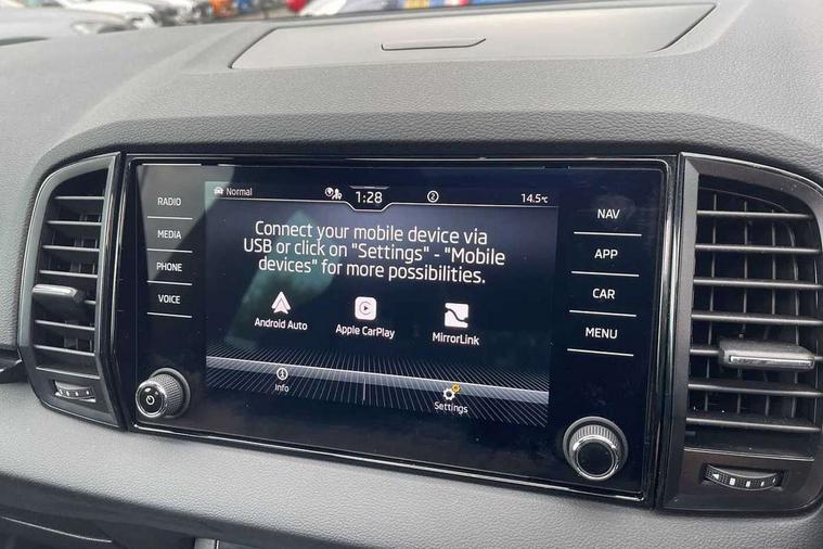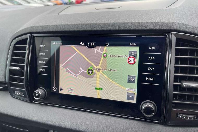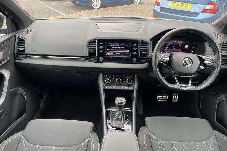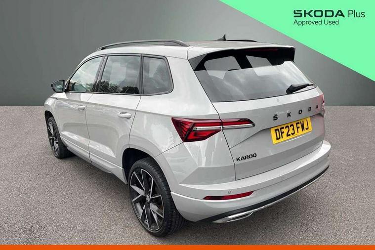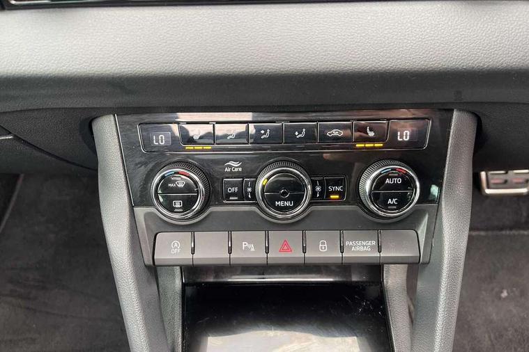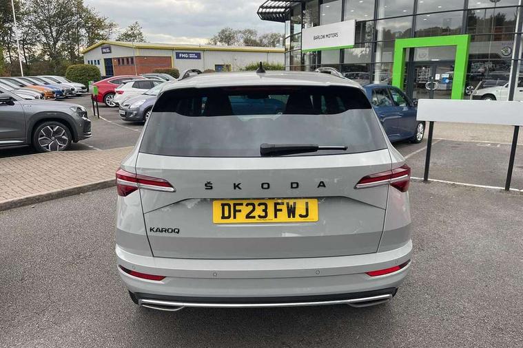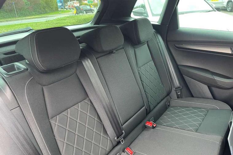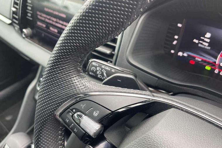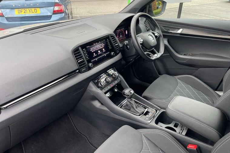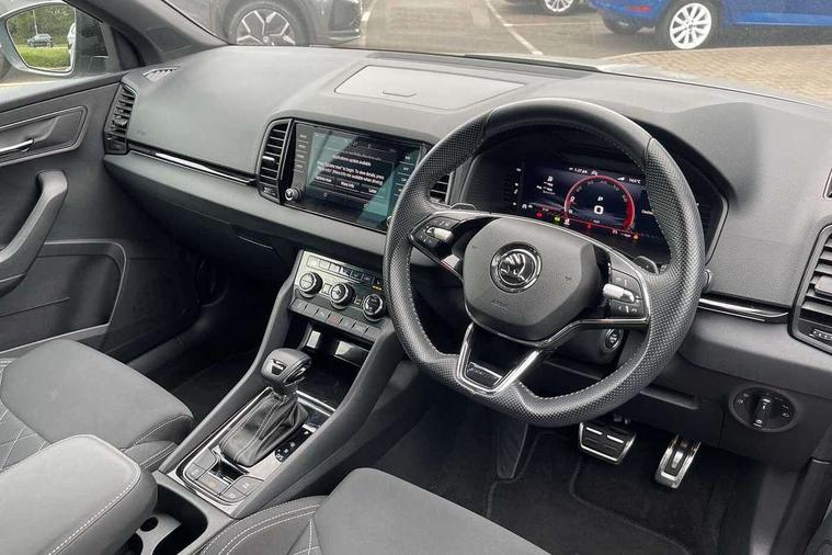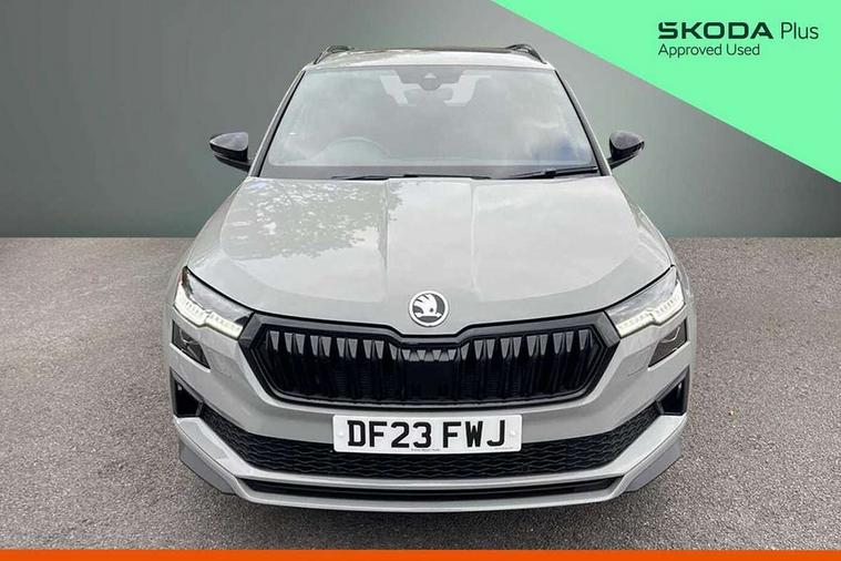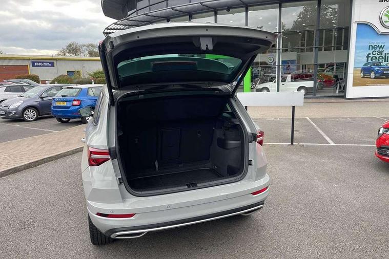 8" Digital display, Care connect, Driver fatigue sensor, Emergency services call system, Outside temperature gauge, Service interval indicator, SmartLink wireless for Apple and wired for Android, Start/stop system with regenerative braking, USB C Port x 2 in front centre console, Virtual cockpit, Virtual pedal with electrically operated boot door, 8 Speakers, DAB radio with Bluetooth, USB connection, Wireless charging without wireless aerial connection, Acoustic glass, Aero front windscreen wipers with intermittent function, Auto dimming rear view mirror with light and rain sensors, Black door mirrors, Black electric window control buttons, Black radiator grille, Black roof rails, Body colour door handles, Dynamic headlight range control with cornering light function, Electric front and rear windows with child proof lock, Front door steps with SportLine logo, Heated rear windscreen, LED daytime running lights, LED rear lights with high functionality welcome effect and dynamic indicators, Light assistant (coming/leaving home/tunnel light), Panoramic sliding sunroof, Plastic scuff plates, Privacy glass, Protective door side sills in body colour, Rear diffuser, Rear side wing doors, Rear spoiler, Rear window wiper with washer system and intermittent control, Safety reflectors on front doors, Skoda lettering on tailgate in black, Sportline badge on front fender, Sportline decorative inserts with badging, Sports front and rear bumpers, 1.5 litre bottle holders in driver and front passenger door panels, 12V socket in boot, 12v socket in front centre armrest with storage compartment and rear air vents, 3 rear height adjustable headrests, 3 seat bench in 2nd row, 3 spoke leather sports multifunction steering wheel and silver stitching with gear shift paddles, 4 foldable roof handles with rear coat hooks, Black floor carpet, Black roof headlining, Chrome inner door handles, Double sided boot floor, Foldable hooks in the boot, Front head restraints, Height adjustable front three point seats belts with tensioners, Height/reach adjust steering wheel, Ice scraper, Illuminated glovebox, Illuminated luggage compartment, Isofix child seat preparation outer rear, Manual lumbar support for front seats, Pen holder, Pollen filter, Rear boot cover, Rear reading lights, Rear seats fixed folding and divided 60:40, Rubbish bin door, Safety vest holder, Single front passenger seat, Storage box in upper central dashboard closed, Sunvisors with illuminated vanity mirrors, Textile floor mats, Ticket holder, Titan black interior ceiling, Welcome animation with sportline logo, Boot pack - Karoq, Light Pack - Karoq, Parking pack - Karoq, Automatic door unlocking in case of crash, Automatic fuel cut off in case of crash, Child locks on rear doors, Driver airbag, Electronic parking brake with auto hold function, Emergency rear braking signal, ESC including ABS, MSR, ASR, EDS, HBA, DSR, RBS, MKB and traction control, Front side airbags, Hill hold control, Knee airbags, Passenger airbag with switch-off function, Pedestrian monitor, Seatbelt reminder signalisation and pretensioner for all seats, Three point seatbelts rear, Two tone horn, Tyre pressure display, Tyre pressure monitor, Alarm with interior monitoring, back up horn and tilt sensor with safe function, Electronic engine immobiliser, Keyless entry and start/stop, Remote central locking with 2 remote folding keys, Black air vent surround, Black centre console, Satin black dashboard, Satin black door trim, 19" Vega black polished alloy wheels, Anti-theft wheel bolts protection, Matt black aero hub caps, Storage on wheel cover, Tool kit,