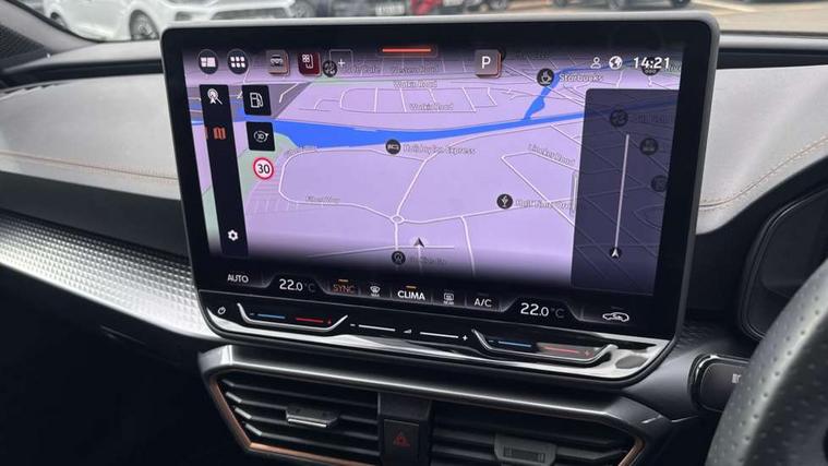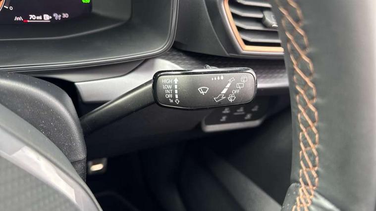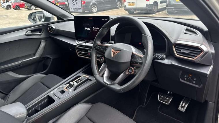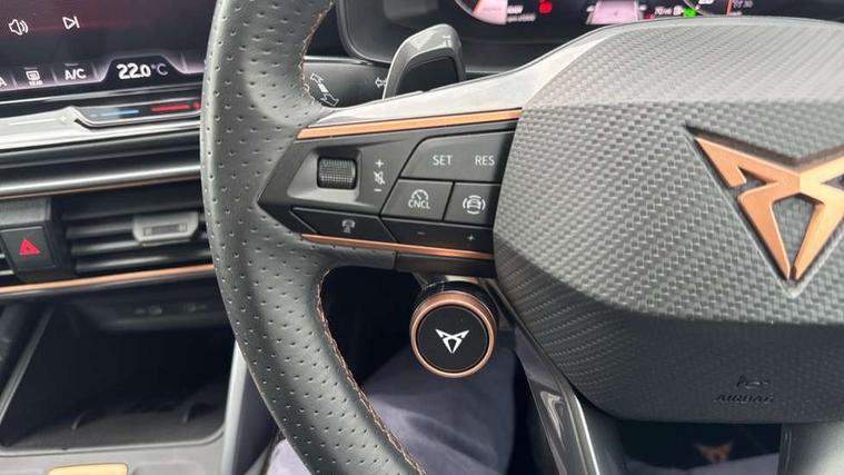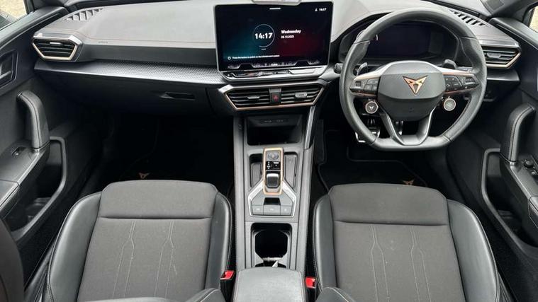 Adaptive cruise control with follow-to-stop and speed limiter, CUPRA drive profile selection with (Comfort/Sport/Individual), throttle response and gearshift mode, Digital cockpit, Dynamic road sign display, E-call, Four x USB Type C ports (2 in front and 2 in rear), Front and rear parking sensors, Front assist with forward collision warning braking reaction to vehicles, pedestrians and cyclists, Full link smartphone integration with Mirror Link, wireless Apple CarPlay and wired Google Android Auto, Lane assist, Lockable tailgate, PAS, RPM, trip computer, outside temp gauge, instrument light brightness, low fuel warning light, lights on reminder, gearshift indicator, Service interval indicator, Start/stop system with regenerative braking, Wireless phone charger, 7 speakers, Auxiliary input socket, Auto dimming rear view mirror, Body colour door handles, Body coloured bumpers, Cupra sports bumpers, Dark tinted rear windows, Electric front/rear windows, Electrically adjustable, heated and folding door mirrors, High beam assist, LED front fog lamps with cornering function, LED headlights with dynamic turn signals, tail lights, rear fog lights with rear coast to coast lighting, LED rear fog lamp, Rain sensing wipers, Rear side wing doors, Rear wash/wipe, Separate daytime running light with automatic headlight control and coming home feature, Third brake light, Welcome light with logo projector in door mirrors, 12v power supply in centre console, 3 seat bench in 2nd row, 5 headrests, 60/40 split rear bench seat with armrest, Ambient lighting with glovebox, footwell and single monocolour, Black headlining, Cloth/PVC upholstery, Cupra sports pedals, CUPRA Supersports, heated steering wheel with satellite buttons, Driver and passenger seat with manual height and lumbar adjustment, Folding boot cover, Front and rear reading lights X 4, Front centre armrest, Height/reach adjust steering wheel, Illuminated interior front door sills, ISOFIX points in outer rear seats with top tether anchorage points, Single front passenger seat, Storage pockets on rear of front seats, Sunvisors with illuminated mirror, Three zone climate control, Media system plus with 12.9" display + navigation pack - Leon Cupra, 3 point seatbelts on all rear seats, ABS, Brake control system - ESC and brake booster, Child proof door locks, Cupra black brake calipers, Driver and front passenger airbags with front passenger airbag de-activation, front side and curtain airbags, Electronic parking brake, Hill hold control, Rear disc brakes, Seat belt reminder for front and rear seats, Tiredness recognition system, Tyre pressure monitoring system, Anti theft alarm system with interior monitoring in cab, backup horn and towing protection, Central locking system Keyless Go, Locking wheel bolts, Chrome and copper interior detailing, 18" Windstorm machined sport black matt and silver alloy wheel with 92Y XL tyres, Tool kit,