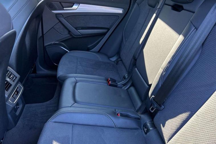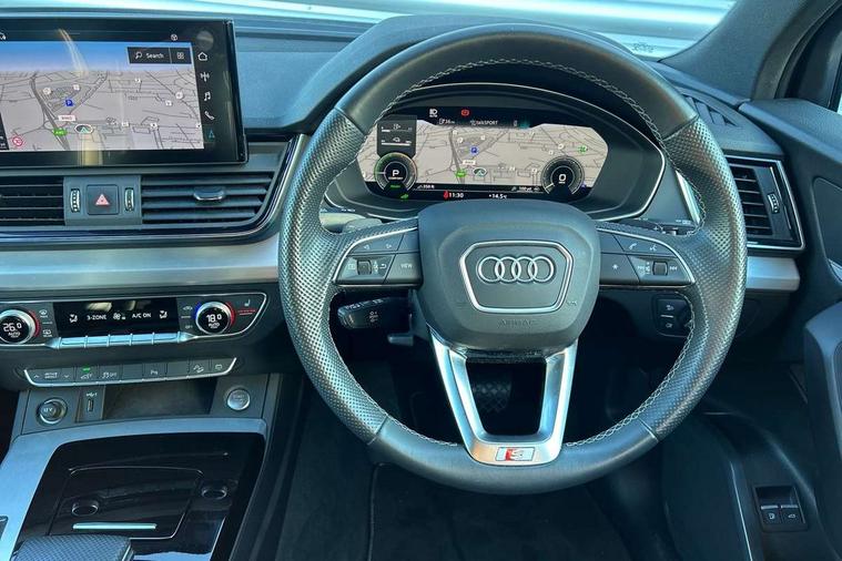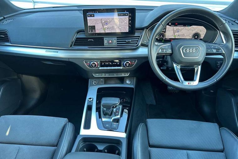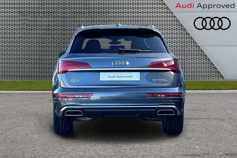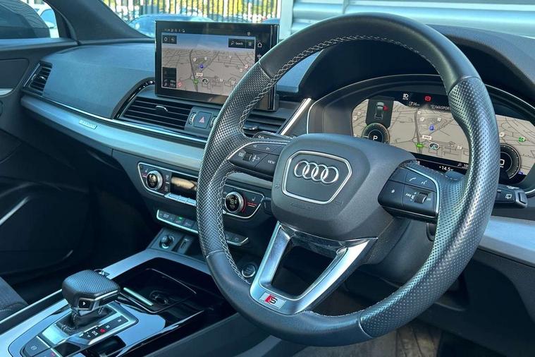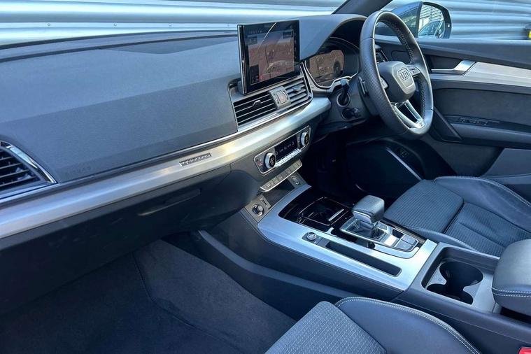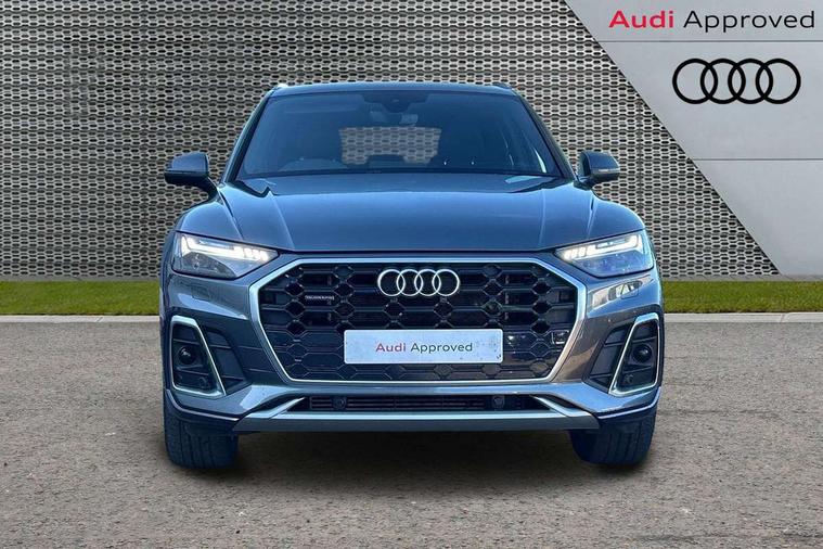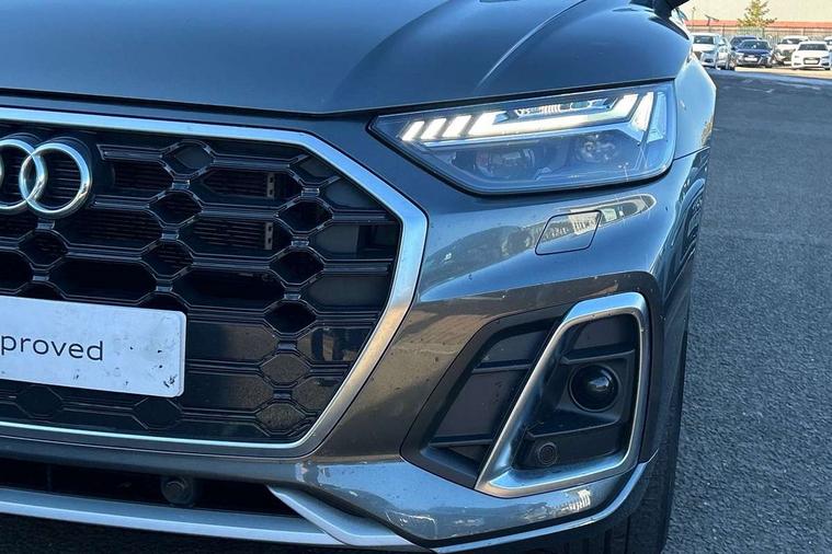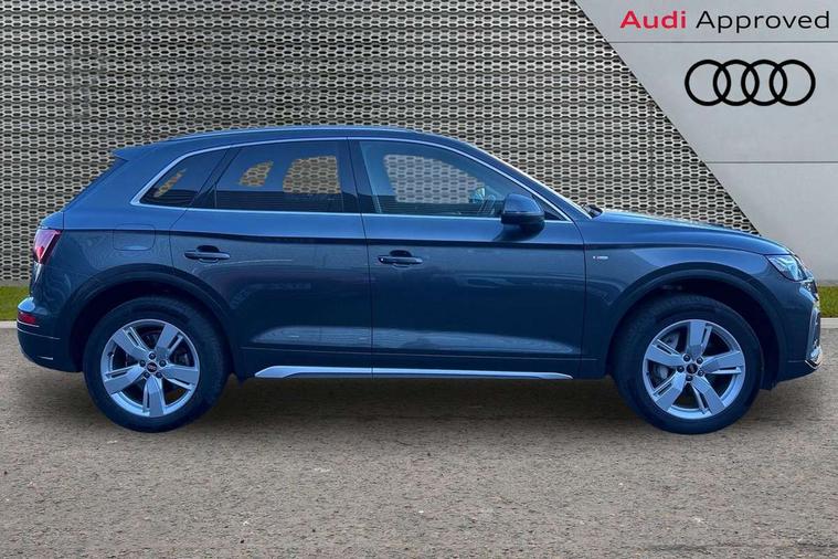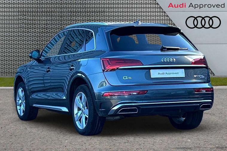 Audi connect safety and service (e-call), Audi connect with Amazon Alexa Integration, Audi drive select, Audi virtual cockpit plus with 12.3" screen and three different layout designs, Audi wireless smartphone interface, Automatic start-stop system with coasting functionality and efficiency programme, Bluetooth interface, Electro - mechanical power assisted steering, MMI navigation plus with 10.1" touch screen, Power tailgate, Reversing camera, Service interval indicator, Voice control system with Audi hotword activation "Hey Audi", 3 pin 10 amp domestic charging cable, 7.4 kW onboard charger, Dynamic suspension, Quattro on demand, Type 2 mode 3 22kW 32 amp charging cable, Type 2 socket for AC charging, 2 x USB charging port with aux input socket, DAB Digital radio, 3rd brake light, Acoustic windscreen, Aluminium roof rails, Audi matrix LED headlights with dynamic front and rear indicators, Auto dimming rear view mirror, Automatic headlights and windscreen wipers, Body colour bumpers, Body colour door mirrors, Body colour rear diffuser with matt aluminium silver surrounds, Body colour underbody protection, Chrome plated exhaust trims, Daytime running lights, Door sills in Selenite silver, Electric adjustable/heated/folding door mirrors, Front air inlet surrounds in aluminium, Front and rear electric windows, Front radiator grille in honeycomb design, Headlight washers, Lower bumpers painted in contrast Manhattan grey, Rear chrome trim strip below lights, Rear privacy glass and rear side windows, Rear side wing doors, Rear spoiler, Rear wiper, Roof bars, S Line badges on the front wings, S Line front and rear bumpers, S Line side skirts, 3 rear headrests, 40:20:40 split folding 3 rear bench seat in 2nd row with rear centre armrest, Black cloth headlining, Comfort front centre armrest, Contrast stitching on seats, steering wheel and gear lever gaiter, Deluxe 3 zone electronic climate control, Front/rear floor mats, Gear lever in black leather, Heated front seats, Height adjustable front head restraints, Height/reach adjustable steering column, Illuminated door sill trims with S logo, ISOFIX child seat mounting and top tether, Manual seat adjustment with 4-way electric lumbar support, Rear seat bench plus, Single front passenger seat, Sunvisors with vanity mirrors, Trunk roller cover, High gloss pack - Q5, LED interior light pack - Q5, 3 point seatbelts on all seats, 6 airbags - Driver, front passenger, curtain and side airbags, Electrically operated child locks on rear doors, Electromechanical parking brake, Electronic stabilisation control including ABS, ASR and EDL, Front passenger airbag deactivation, Hill descent control, Hill hold assist, Multi collision brake assist, Pop-up bonnet for pedestrian protection, Pre sense city, Seat belt force limiter, Seatbelt monitoring, Tyre pressure warning, Warning triangle and first aid kit, Anti theft alarm, Anti-theft wheel bolts, Keyless Go access/ignition system, Matt brushed aluminium inlays, Tool kit, Tyre repair kit,