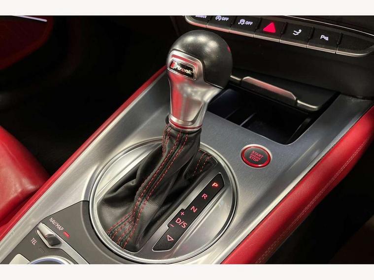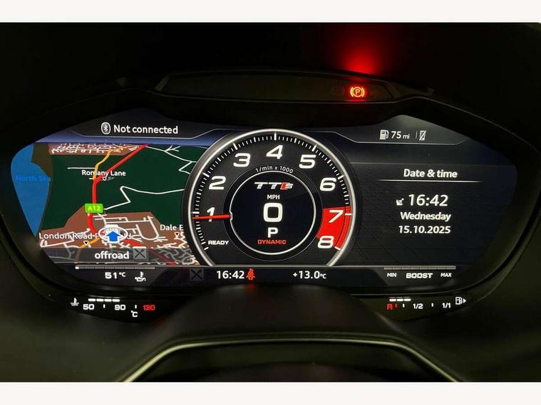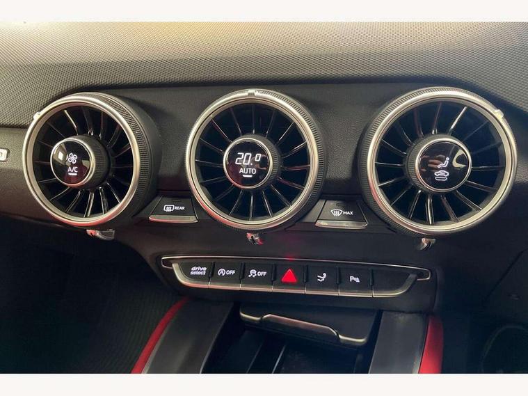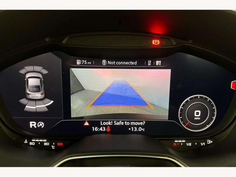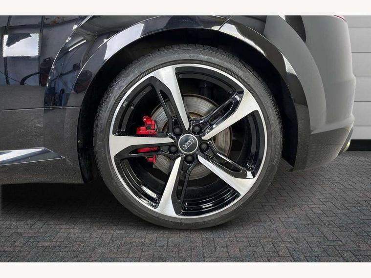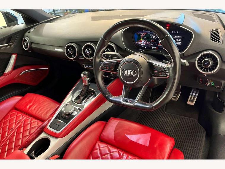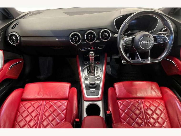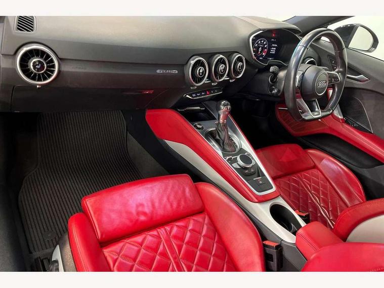 Audi active lane assist, Audi drive select, Audi virtual cockpit - 12.3" high-resolution LCD display with fully customisable instrument cluster, Cruise control + speed limiter, MMI touch panel, Mobile phone preparation with bluetooth interface, Progressive power assisted steering, Service interval indicator, Audi magnetic ride, Audi music interface, Auxiliary input socket, Bang + Olufsen advanced sound system, Bluetooth audio streaming, DAB Digital radio, MMI Radio with CD player and SD/XC card slot, Audi Beam uses LEDs to project the Audi Sport logo, Auto headlight range control, Black door mirrors, Body colour bumpers, Electric front windows, Green tinted heat insulating glass, LED daytime running lights, LED rear lights, Matt black radiator grille and number plate holder, Privacy glass, Rear diffuser, Retractable rear boot spoiler, S body styling, Sunband for windscreen, 3 spoke leather multi-function sport steering wheel including paddle shift, Aluminium door sill trims, Black headlining, Electric lumbar support, Extended aluminium look with stainless steel pedals, Front centre armrest, Front head restraints, Front passenger seat isofix location point, Heated front seats, Height/reach adjust steering wheel, ISOFIX on outer rear seats, Split folding rear seat, Top tether anchor plate for isofix child seat, Auto dimming rear view mirror with light and rain sensors pack - TT, LED interior light pack - TT/TT RS, Non smoking pack - TT/TT RS, 3 point front seat belts, ABS, ASR traction control, Curtain airbags, Driver/Front Passenger airbags, EDL traction control, Electromechanical parking brake, ESP, First aid kit, Front passenger airbag deactivation, Front side airbags, Head airbags, Seatbelt warning, Tyre pressure warning, Warning triangle, Anti theft alarm, Immobiliser, Keyless Start, Locking wheel bolts, Remote central locking, Matt brushed aluminium inlays, Tyre repair kit,
