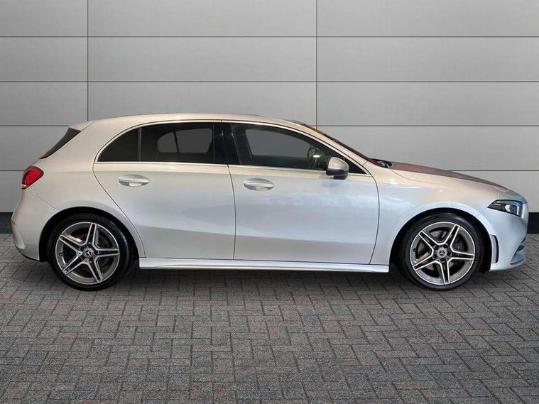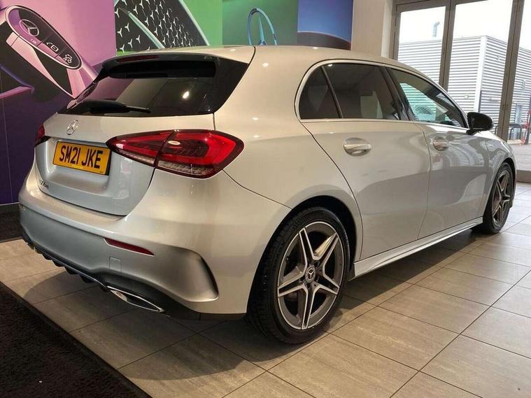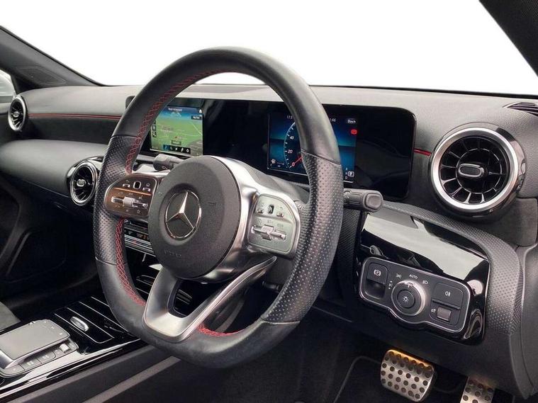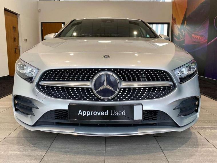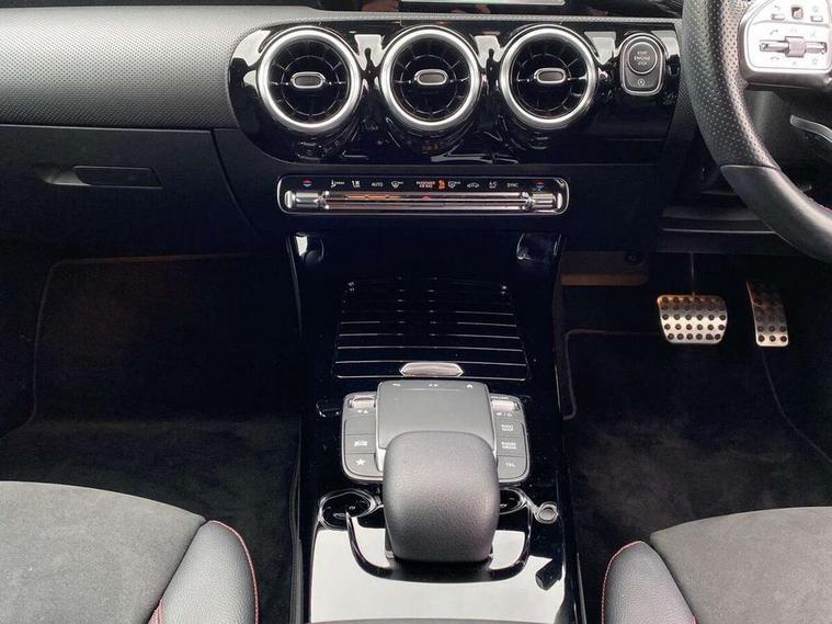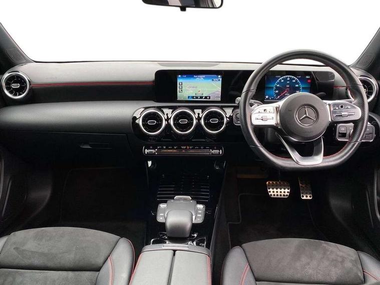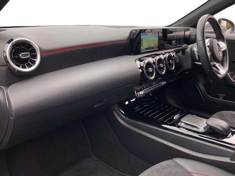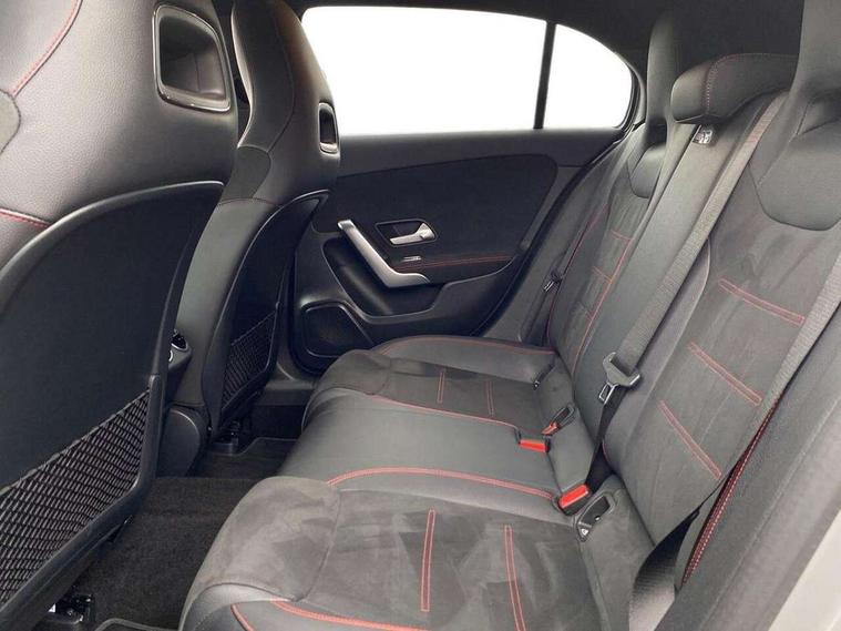 180 degree rear view camera with parking guidelines, 7" colour screen in instrument panel, 7" touchscreen media display, Attention assist, Brake pad wear indicator warning light, Car wash mode, Cruise control + speed limiter, Direct steering, Dual bluetooth interfaces, DYNAMIC SELECT with a choice of driving modes (ECO, Comfort, Sport and Individual), ECO start/stop function, Fluid level warning indicator for fuel, oil, coolant and washer fluid, Hard-disk navigation, Hey Mercedes Voice activation, Lamp failure indicator, Mercedes me connect including emergency call system, accident recovery, breakdown and maintenance management, Mercedes me remote services, Outside temperature gauge, Owners manual in English, Pre-installation for private car sharing, Preinstallation for Mercedes Benz link, Service indicator (ASSYST), Speed sensitive power steering, Trip computer, Lowered comfort suspension, Rear axle multi-link, 2 USB ports (type C) in rear stowage compartment and one in front of center console, 6 speakers, DAB Digital radio, MBUX multimedia system with DAB digital radio and touchpad including satellite navigation, Mercedes-Benz sound system - 100W, 4 Electric Front and Rear windows, Adaptive brake lights, AMG bodystyling - Front apron with splitter in chrome, rear apron with chrome trim and chrome visible trim elements in tailpipe, Black weather strip, Body colour bumpers, Body colour door handles, Body colour side skirt, Body coloured door mirrors, Chrome beltline trim, Diamond radiator grille with chrome pins and silver louvre + chrome insert, Electric adjustable and heated door mirrors with integrated LED side indicators, Exhaust system - Twin visible tailpipes in polished stainless steel, Headlamp assist automatic headlamp activation, Heated glass rear windscreen + timer control, LED high performance headlamps with integrated LED daytime running lights, LED tail lamp, LED third brake light, Privacy glass, Radio aerial, Rain sensing windscreen wipers with two sensitivity settings, Rear fog lights, Rear wiper, Window line trim strip in chrome, 3 Spoke flat bottom leather multi function steering wheel with perforated leather in grip area, 40:20:40 split folding rear seats, Artico man-made leather/Microfibre Dinamica upholstery with red contrast stitching, Auto Mercedes-Benz child seat recognition sensor, Black air vents with surround in silver chrome, Black roof lining, Brushed stainless steel sports pedals with rubber studs, Controller on centre console with chrome surround, Floor mats with stitched edging and AMG lettering, Front centre armrest with storage compartment, Front door sills with Mercedes Benz lettering, Front seat backs luggage nets, Front seat cushion length adjustment, Galvanished gear shift paddles on steering wheel, Heated front seats, Height/reach adjustable steering column, Interior mirror with reading lamps in black and frameless, Manual height adjustable front seats, Rear head restraints, Seat occupancy sensor for front passenger seat, Sports seats with integrated headrests, Stowage compartment in centre console with retractable cover, Sunvisors with illuminated vanity mirrors, Touchpad on center console, Twin front cupholders, Two zone thermotronic luxury automatic climate control, Light and sight pack - A Class, Seat comfort pack - A Class, 3 rear 3 point seatbelts, ABS with Brake Assist, Active bonnet, Active brake assist includes forward collision warning system with autonomous braking, Adaptive brake assist with hold function and hill start assist, Black seatbelts, Childproof locks manually operated for rear doors and electrically operated for rear power windows, Crash responsive emergency lighting, Driver and passenger head and side airbags, Drivers knee airbag, Dual stage driver/passenger airbags, Electronic parking brake, ESP curve dynamic assist, ESP with ASR, Front and rear seatbelt reminder, Front brake callipers with Mercedes Benz lettering, ISOFIX and top tether child seat fixing points in two outer rear seats, Tyre pressure monitoring system, Warning triangle and first aid kit, Window airbags, Alarm system/interior protection/immobiliser, Keyless Go, Remote central locking and crash sensor with emergency opening function, Urban guard vehicle protection system with immobiliser and interior protection, Dinamica microfibre trim in black, 18" AMG 5 twin spoke light alloy wheels in titanium grey with highsheen finish, Summer tyres, Tirefit sealant kit,