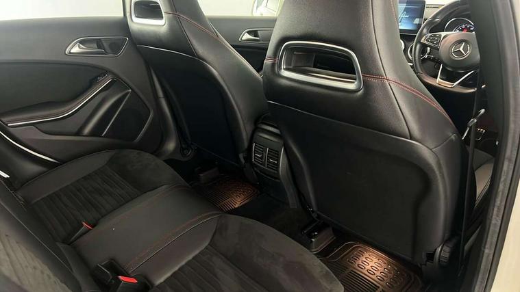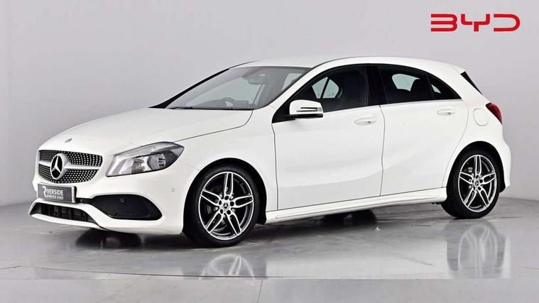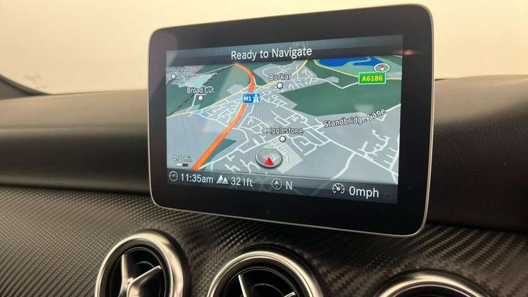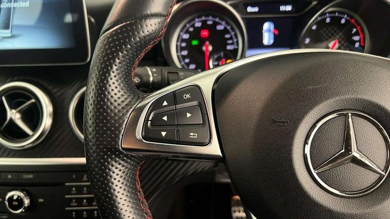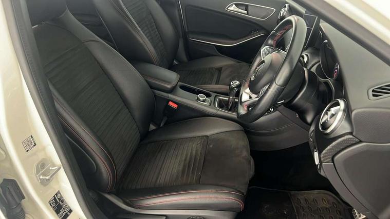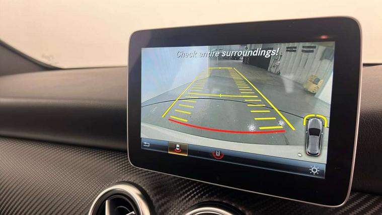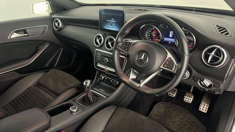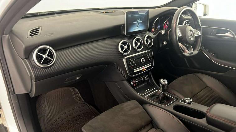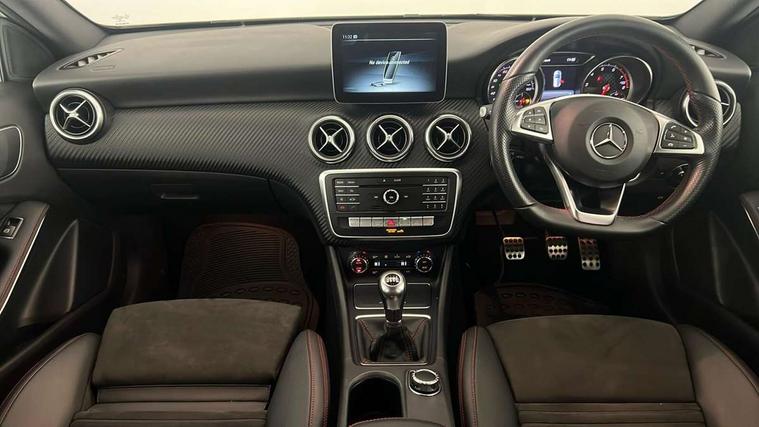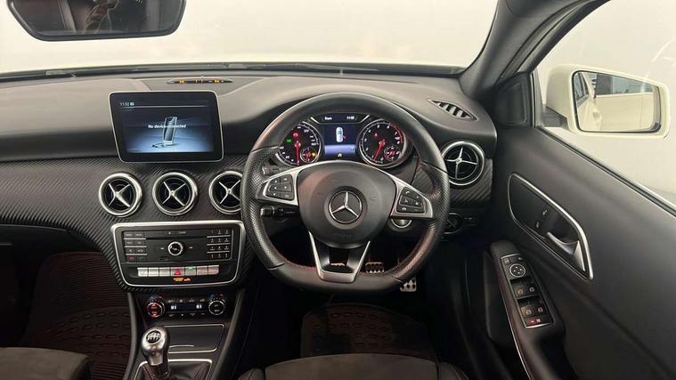 8" colour display screen, Attention assist, Bluetooth interface for hands free telephone, Bulb failure indicator, Collision prevention assist plus, DYNAMIC SELECT with a choice of driving modes (ECO, Comfort, Sport, Sport+ and Individual), External temperature gauge, Low fluid warning light, Park assist pilot with front and rear park assist, Reversing camera, Service indicator (ASSYST PLUS), Speed dependent sports steering system, Speedtronic cruise control, Trip computer, Voice control system, Lowered suspension, USB port, Adaptive brake lights, AMG body styling, Body colour bumpers, Body colour door handles, Body colour side skirt, Daytime running lights, Diamond radiator grille with chrome pins and silver louvre + chrome insert, Electric adjustable heated door mirrors, Electric front windows, Electric rear windows, Headlamp assist, Heated rear window with timer, LED tail lights, Rain sensor windscreen wipers, Rear wiper, Twin Trapezoidal tailpipes, 1/3 to 2/3 split folding rear seats, 12V socket, 3 Spoke sports multifunction flat bottomed leather steering wheel, Ambient lighting, Auto Mercedes-Benz child seat recognition sensor, Black headlining, Brushed stainless steel sports pedals, Dual zone automatic climate control, Footwell lights, Front and rear reading lights, Front centre armrest with storage compartment, Front head restraints, Front sport seats, Heated front seats, Height adjustable front seats, Height/reach adjustable steering column, Illuminated door sills, Illuminated glovebox, Illuminated storage compartment, Isofix rear child seat preparation, Leather gearshift, Load securing rings in luggage compartment, Luggage compartment cover, Rear head restraints, Storage compartment under load area floor, Sunvisors with illuminated vanity mirrors, Twin front cupholders, Seat comfort pack - A Class, 3 rear 3 point seatbelts, ABS with Brake Assist, Active bonnet, Adaptive brake system, Brake calipers with Mercedes-Benz lettering + perforated brake discs, Child proof door locks, Crash responsive emergency lighting, Drivers knee airbag, Dual stage driver/passenger airbags, Electronic parking brake, ESP with ASR, Front and rear seatbelt reminder, Front head airbags, Front passenger seat occupancy sensor, Front side airbags, Hill start assist, Tyre pressure monitoring system, Warning triangle and first aid kit, Window airbags, Alarm system/interior protection/immobiliser, Keyless ignition, Remote central locking, Carbon effect trim, Chrome air vent surrounds, Tirefit sealant with electric air pump,