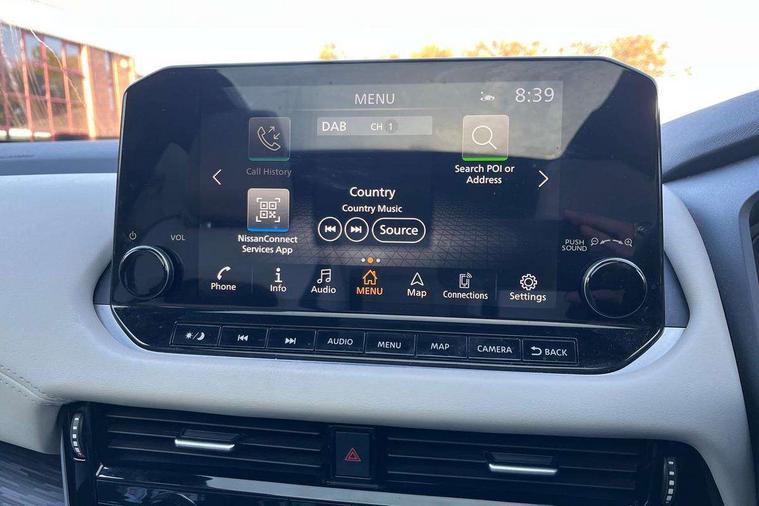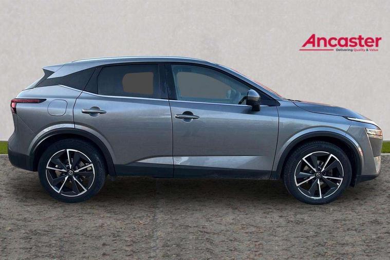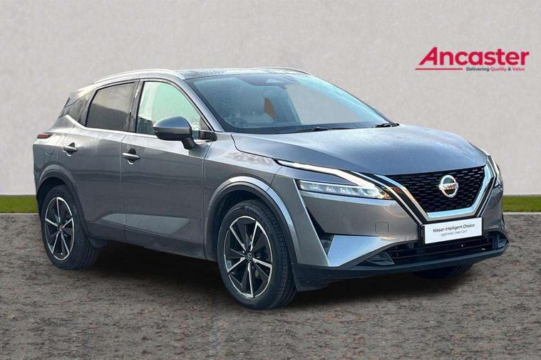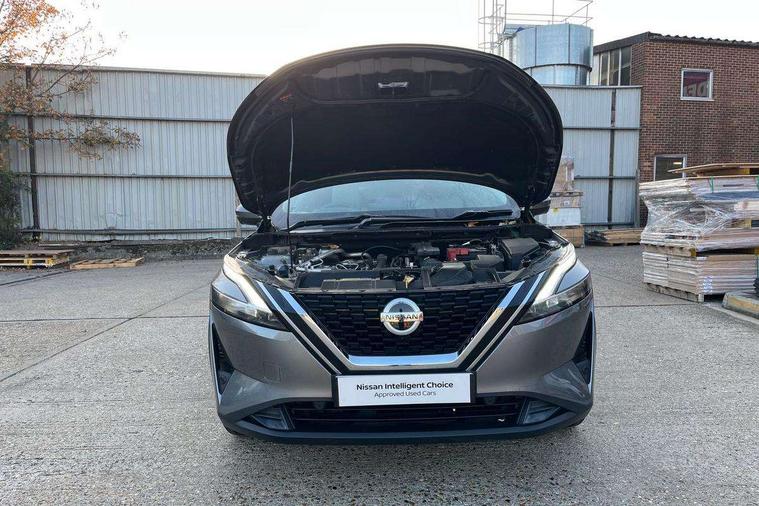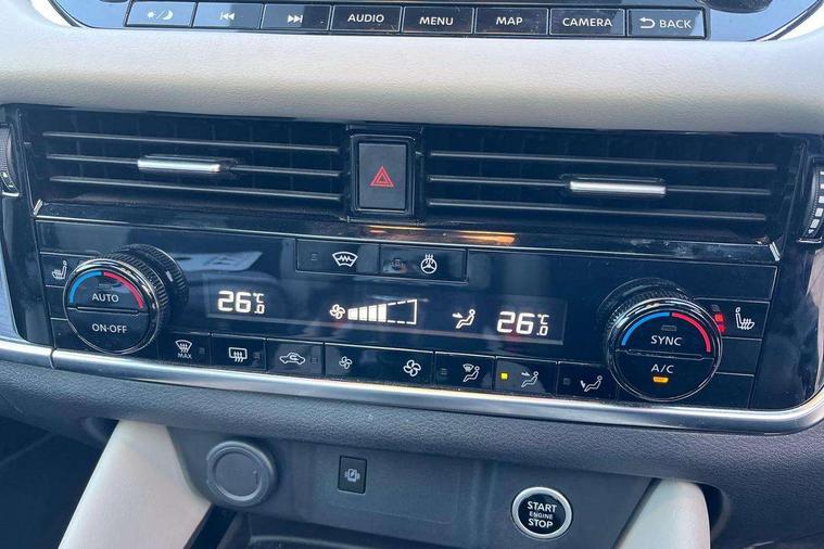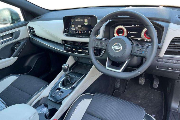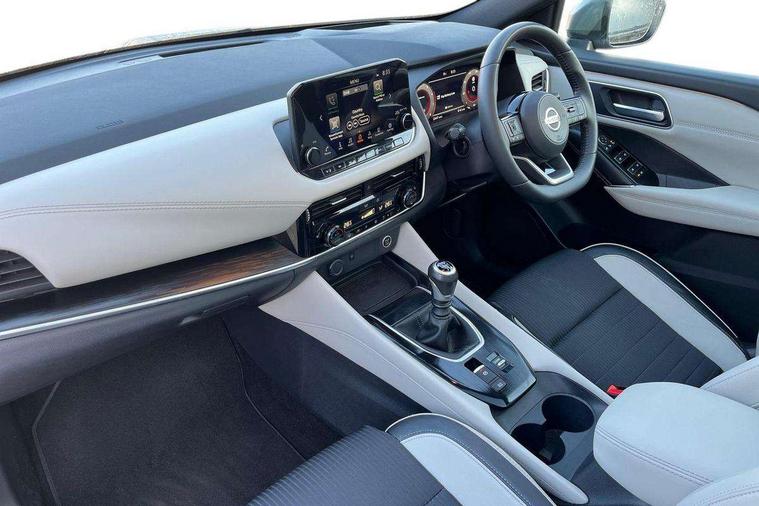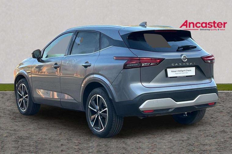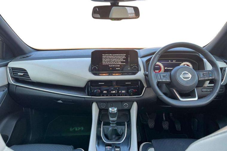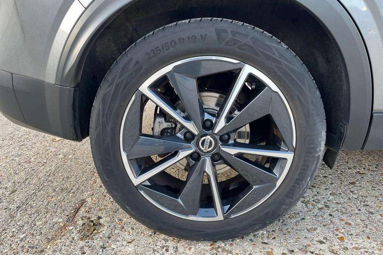 Blind spot warning, Drive modes (sport, normal, eco), Electric speed sensitive power steering, Emergency and breakdown call, Front and rear parking sensors, Full Digital 12.3" TFT Digital Combimeter, Hands free power tailgate, Idle stop/start system, Intelligent Cruise control (ICC), Intelligent driver alert system, Intelligent forward collision warning, Intelligent lane intervention, Lane departure prevention, Lane departure warning system, Moving object detection, Push button starter, Rear cross traffic alert, Traffic sign recognition with legal speed adjustment, Trip computer, 6 speakers, AM/FM audio system with DAB, Bluetooth audio streaming, Front USB connections (Type-A and Type-C), Rear USB charging only ports (Type-A and Type-C), Auto dimming rear view mirror, Auto rear wiper when reversing, Body colour mirror caps, Body coloured door handles, Bodyside mouldings, Chrome side window finisher, Electric auto folding door mirrors, Electrically adjustable and heated door mirrors with LED turn indicator, Fixed panoramic glass roof with electric sunshade, Follow me home headlights, Intelligent auto headlights, LED daytime running lights, LED signature rear lights, One touch front and rear electric windows with remote opening and closing, Partially body coloured bumpers, Privacy glass, Rear roof spoiler, Rear styling plate, Roof rails, Shark fin antenna, Splash free rain sensing wipers, Super UV and infrared cut glass, Three blink turn signal, 12v power socket in dashboard and luggage, 2 way electrical driver lumbar adjustment, 2x Rear coat hooks, 3 rear headrests, 4 grab handles, 6 Luggage hooks - 4 on floor, 2 on side, 60/40 split folding rear seat, 8 way electric adjustable drivers seat, Ambient lighting around centre console, Ambient lighting in front doors, Centre console storage tray, Chrome interior door handles, Cloth/syntech leather monoform upholstery, Dark headlining, Driver and front passenger sunvisors with illuminated vanity mirrors, Driver seat back pocket, Dual zone automatic climate control with pollen filter, Front centre console and armrest, Front cupholder, Front door with bottle holders, Glovebox with light, Hard trunk cover, Height adjustable front headrests, Leather shift knob, Leather steering wheel, Luggage board system, Luggage space lighting, Manual lumbar support on passenger seat, Manually adjustable passenger (slide recline + lifter), Multifunction steering wheel, Passenger seat back pocket, Rear armrest with 2 cupholders, Rear door bottle holders, Soft PVC kneepad, Steering wheel switches, Tilt/telescopic adjustable steering wheel, Two rear isofix child seat anchorage points with top tether, Welcome light and doors with console tray ambient lighting, Drive assist pack - Qashqai, Heat pack - Qashqai, Tech Pack (Drive Assist + HUD), 3x3 point rear seatbelt pretensioners + load limiters, ABS, ESP, EBD and brake assist, Active brake limited slip, Auto hold function, Child locks on rear doors, Curtain and front side, far side airbags, Driver and passenger airbags, Driver, passenger and 2nd row rear seat belt reminder, Electronic parking brake, Front seatbelt pretensioners + load limiters, Height adjustable front seatbelts, Hill start assist, Intelligent blind spot intervention, Intelligent front emergency braking with pedestrian, cyclist recognition and junction assist, Intelligent rear automatic braking, Tyre pressure monitoring system, Vehicle dynamic control, Capless fuel filler, Engine immobiliser, Nissan i-key, Remote central door locking with deadlocking, Thatcham Cat.1 alarm, 19" Alloy wheels,