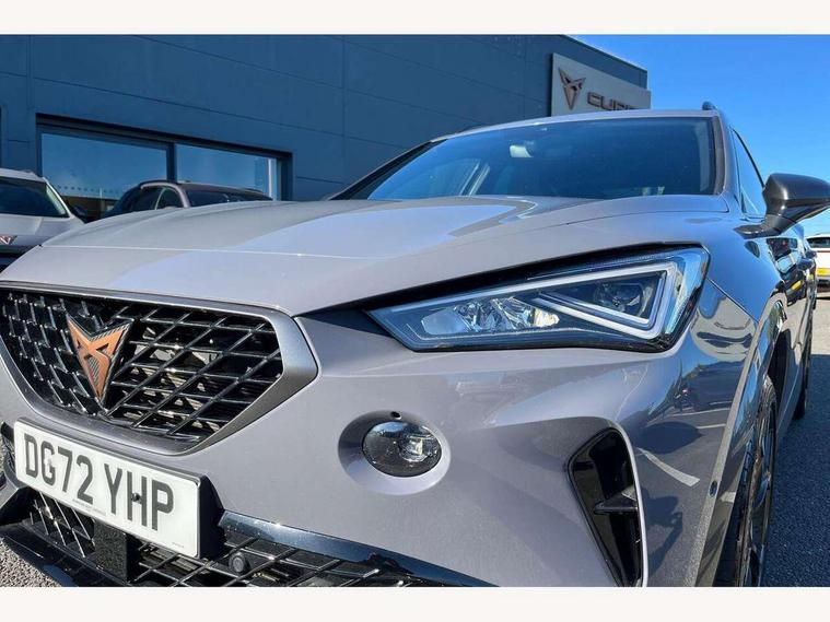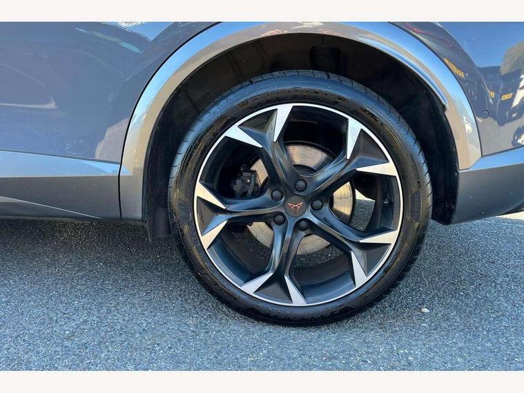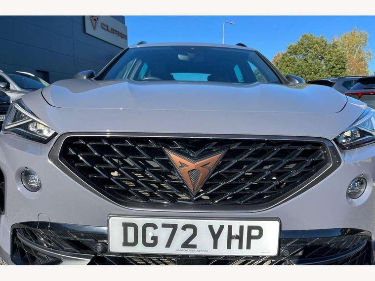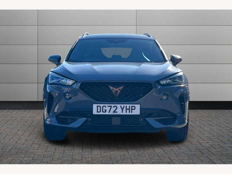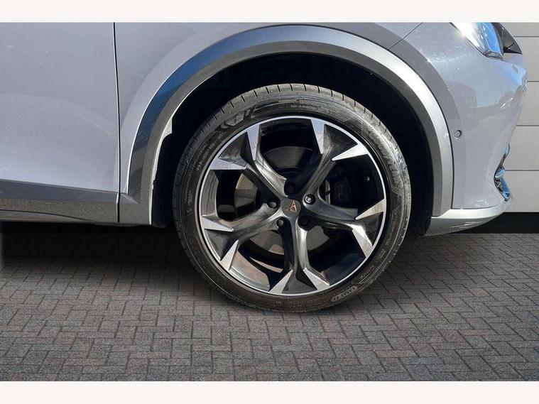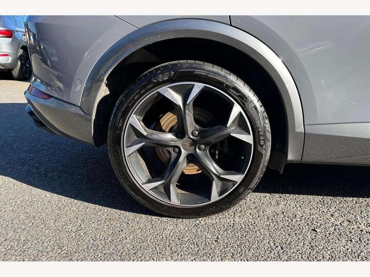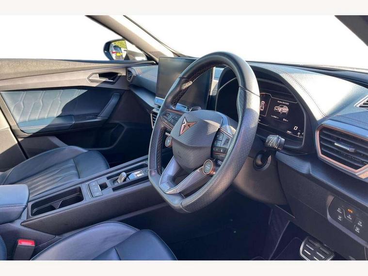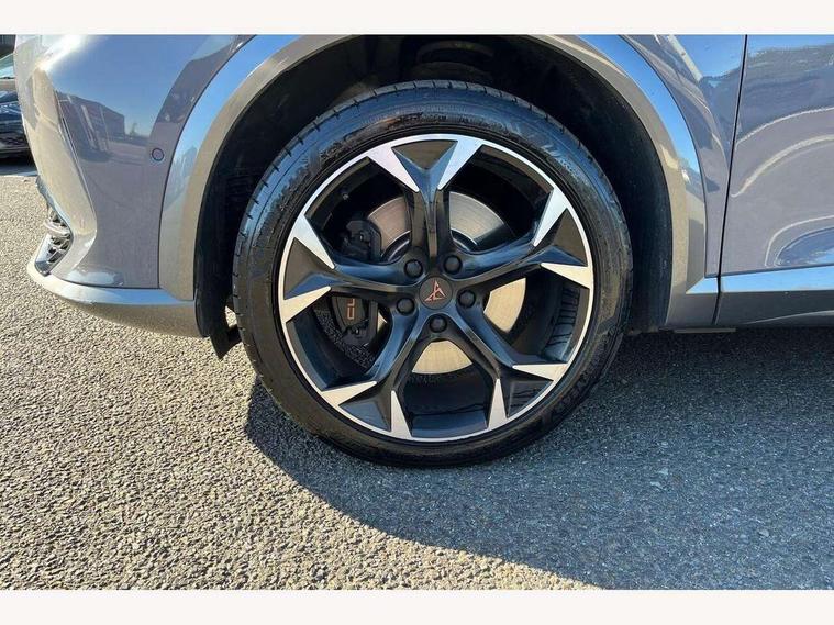 Digital cockpit and configurable dashboard, Driver alert system, Dynamic chassis control with driving profile selection (Comfort, Sport, CUPRA, Individual), E-call, Forward collision warning with automatic braking, Lane assist, Navigation system with 12'' Touchscreen Display, Park assist (inc front/rear parking sensors), Predictive adaptive cruise control with speed limiter, Rear view camera, RPM, trip computer, outside temp gauge, instrument light brightness, low fuel warning light, lights on reminder, gearshift indicator, Service interval indicator, Speed sensitive power steering, Start/stop system with regenerative braking, Virtual pedal and electric tailgate, Voice control system, Wireless apple carplay, Wireless phone charger, Electronic locking differential and dynamic traction support, Sports suspension with front shock absoption, 2 front and 2 rear USB type C sockets, Auxiliary input socket, DAB radio, Auto dimming rear view mirror, Body colour door handles, Body coloured bumpers, Dark grey wing mirror, Daytime running light with automatic headlight control and coming home feature, Dynamic headlight range control, Electric front/rear windows, Electrically adjustable heated and folding door mirrors with memory function, Front fog lamps with cornering function, Gloss black roof rails and window surrounds, LED Headlights, LED Taillights with dynamic indicator, Rain sensing wipers, Rear diffuser with twin exhaust pipe on each side, Rear side wing doors, Rear wash/wipe, Sports bumpers, Third brake light, Tinted rear windows, VZ logo rear badging, Welcome lights, 12v power supply in centre console, 12V socket, 12v socket in loadspace, 2 front and 2 rear reading lights, 230V socket, 3 seat bench in 2nd row, 60/40 split rear bench seat with armrest and mechanical seat release, Black headlining, Cupra sports pedals, Dust/pollen filter, Front and rear head restraints, Front centre armrest, Height/reach adjust steering wheel, Illuminated interior front door sills, Illuminated sunvisor with mirror, Isofix, Leather heated multi-function sports steering wheel with start stop, CUPRA mode button and gear shift paddles, Luggage tie-down hooks, Single front passenger seat, Three zone climate control with control panel in rear, Variable luggage/load compartment floor, Wraparound lighting, Genuine Nappa leather Pack - Cupra, Safety and driving pack (XL) - Formentor, 3 point seatbelts on all rear seats, ABS, Brake control system - ESC and brake booster, Child proof door locks, Driver and front passenger airbags with front passenger airbag de-activation, Electronic parking brake, Front and rear disc brakes, Front side curtain airbags, Hill hold control, Seat belt reminder for front and rear seats, Tyre pressure monitoring system, Anti theft alarm system, Keyless entry and start system (KESSY), Locking wheel bolts, Copper and aluminium interior detailing, 19" 'Exclusive' machined sport matte black and silver alloy wheels, Space saver spare wheel,