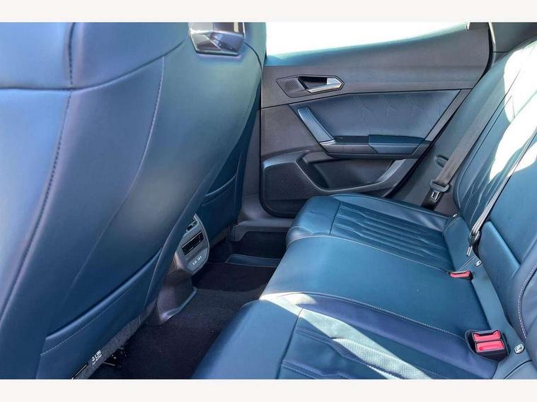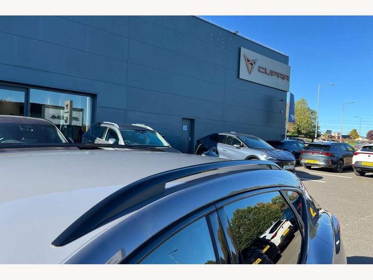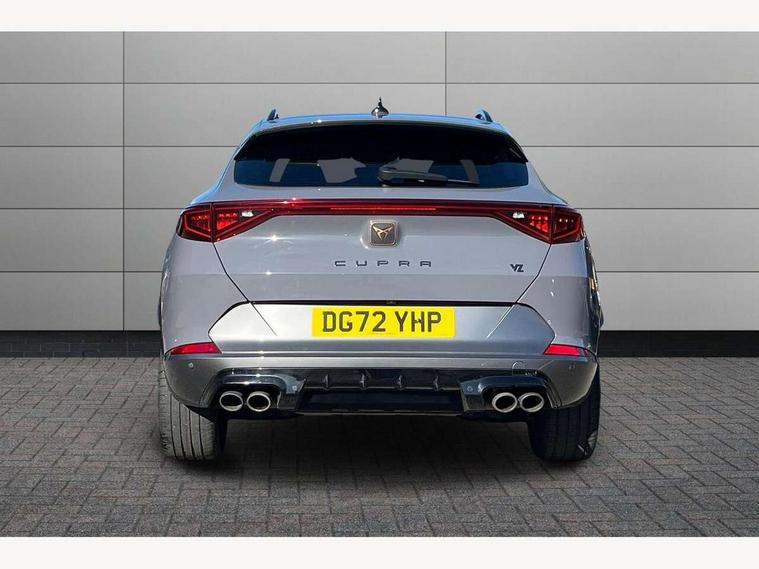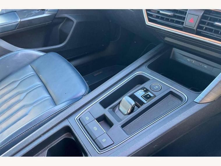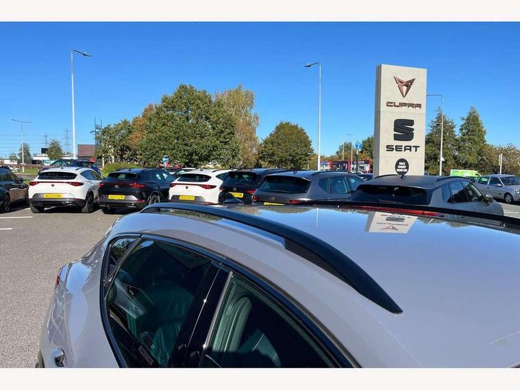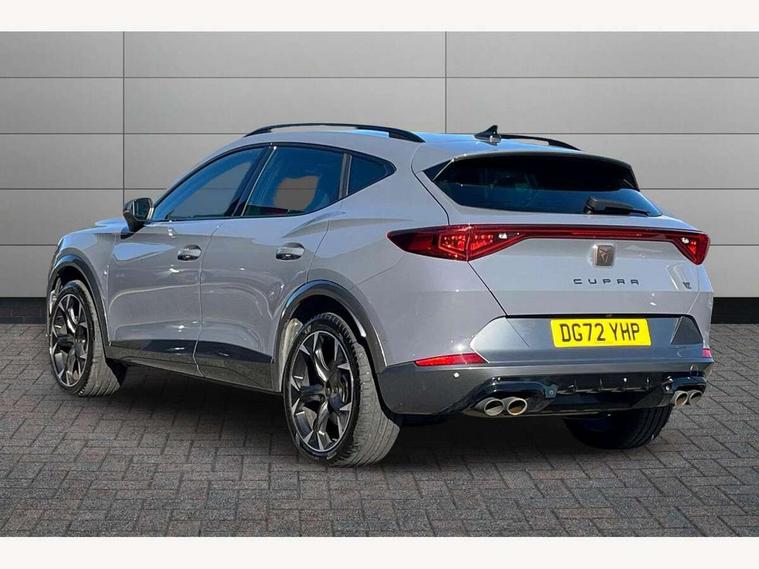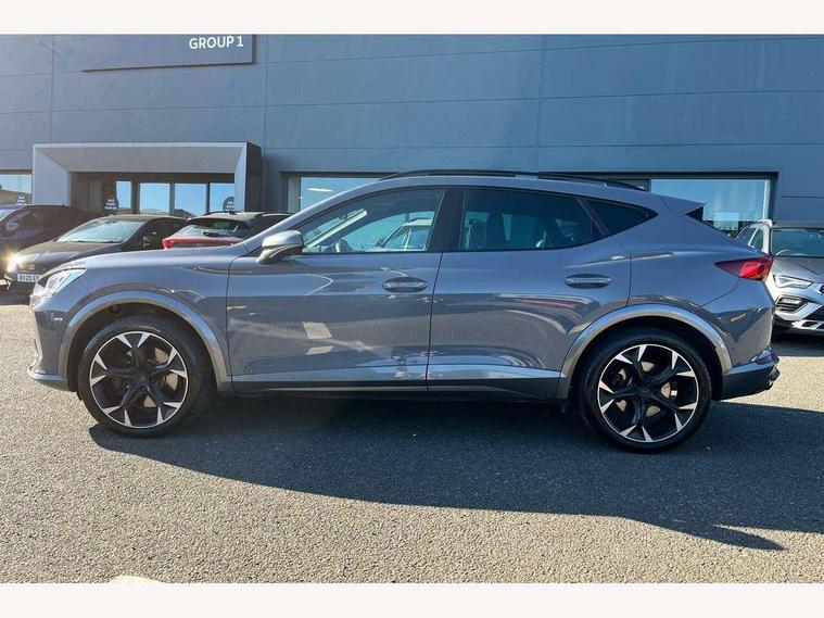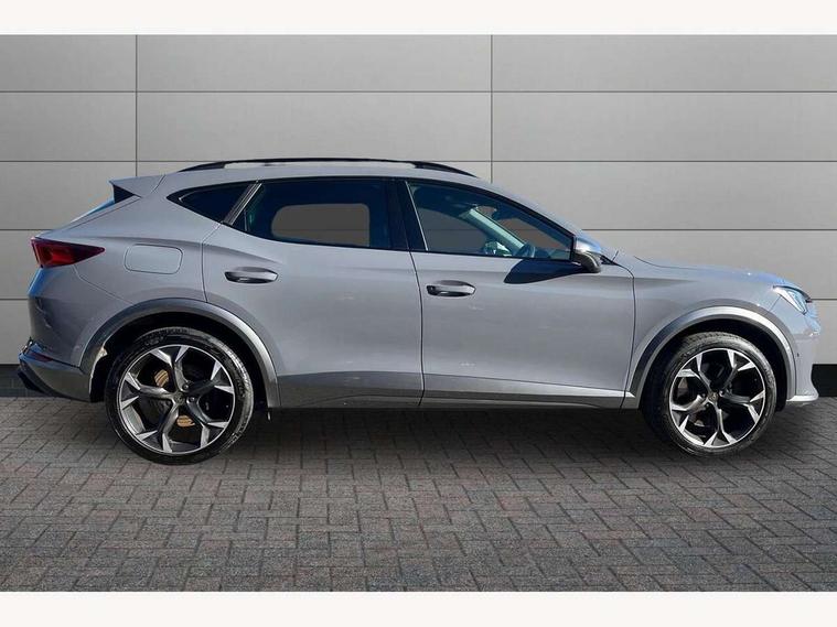 Digital cockpit and configurable dashboard, Driver alert system, Dynamic chassis control with driving profile selection (Comfort, Sport, CUPRA, Individual), E-call, Forward collision warning with automatic braking, Lane assist, Navigation system with 12'' Touchscreen Display, Park assist (inc front/rear parking sensors), Predictive adaptive cruise control with speed limiter, Rear view camera, RPM, trip computer, outside temp gauge, instrument light brightness, low fuel warning light, lights on reminder, gearshift indicator, Service interval indicator, Speed sensitive power steering, Start/stop system with regenerative braking, Virtual pedal and electric tailgate, Voice control system, Wireless apple carplay, Wireless phone charger, Electronic locking differential and dynamic traction support, Sports suspension with front shock absoption, 2 front and 2 rear USB type C sockets, Auxiliary input socket, DAB radio, Auto dimming rear view mirror, Body colour door handles, Body coloured bumpers, Dark grey wing mirror, Daytime running light with automatic headlight control and coming home feature, Dynamic headlight range control, Electric front/rear windows, Electrically adjustable heated and folding door mirrors with memory function, Front fog lamps with cornering function, Gloss black roof rails and window surrounds, LED Headlights, LED Taillights with dynamic indicator, Rain sensing wipers, Rear diffuser with twin exhaust pipe on each side, Rear side wing doors, Rear wash/wipe, Sports bumpers, Third brake light, Tinted rear windows, VZ logo rear badging, Welcome lights, 12v power supply in centre console, 12V socket, 12v socket in loadspace, 2 front and 2 rear reading lights, 230V socket, 3 seat bench in 2nd row, 60/40 split rear bench seat with armrest and mechanical seat release, Black headlining, Cupra sports pedals, Dust/pollen filter, Front and rear head restraints, Front centre armrest, Height/reach adjust steering wheel, Illuminated interior front door sills, Illuminated sunvisor with mirror, Isofix, Leather heated multi-function sports steering wheel with start stop, CUPRA mode button and gear shift paddles, Luggage tie-down hooks, Single front passenger seat, Three zone climate control with control panel in rear, Variable luggage/load compartment floor, Wraparound lighting, Genuine Nappa leather Pack - Cupra, Safety and driving pack (XL) - Formentor, 3 point seatbelts on all rear seats, ABS, Brake control system - ESC and brake booster, Child proof door locks, Driver and front passenger airbags with front passenger airbag de-activation, Electronic parking brake, Front and rear disc brakes, Front side curtain airbags, Hill hold control, Seat belt reminder for front and rear seats, Tyre pressure monitoring system, Anti theft alarm system, Keyless entry and start system (KESSY), Locking wheel bolts, Copper and aluminium interior detailing, 19" 'Exclusive' machined sport matte black and silver alloy wheels, Space saver spare wheel,