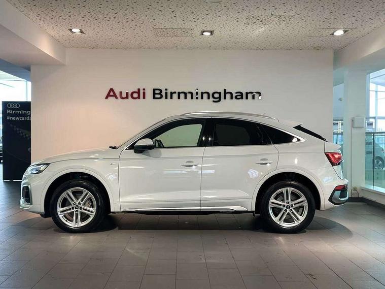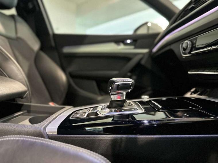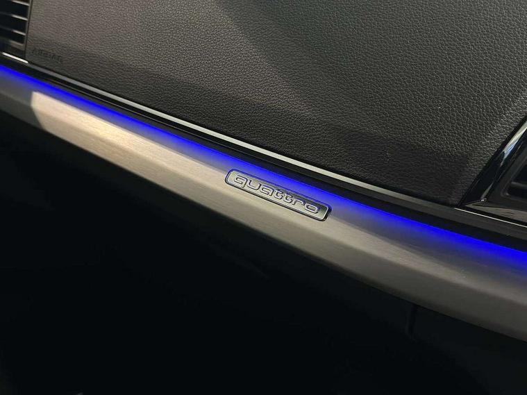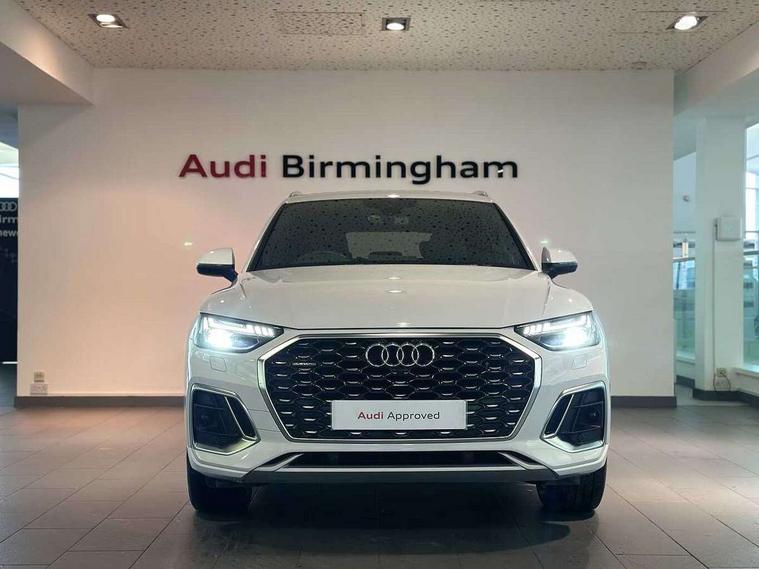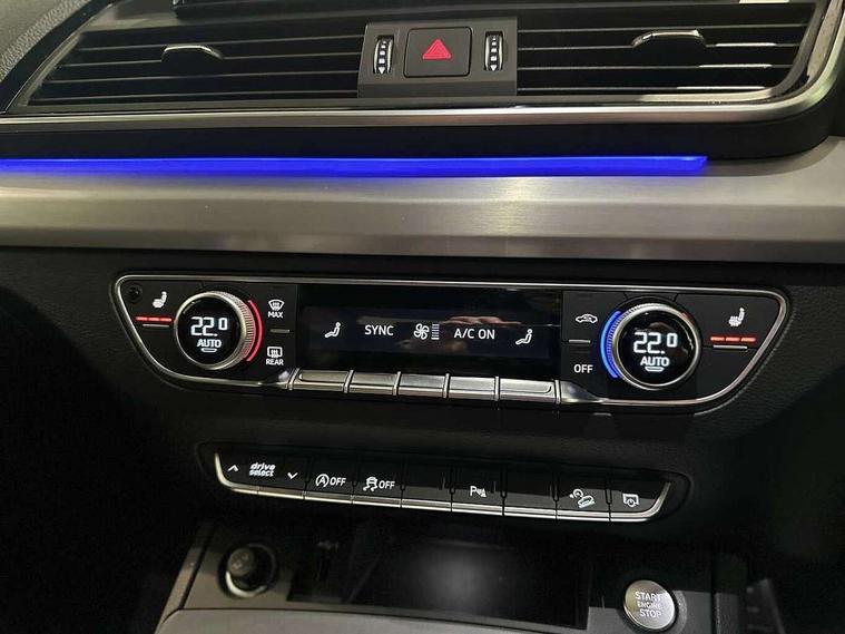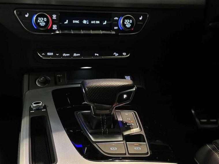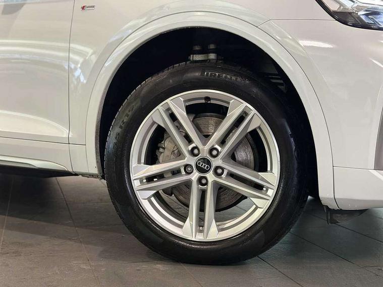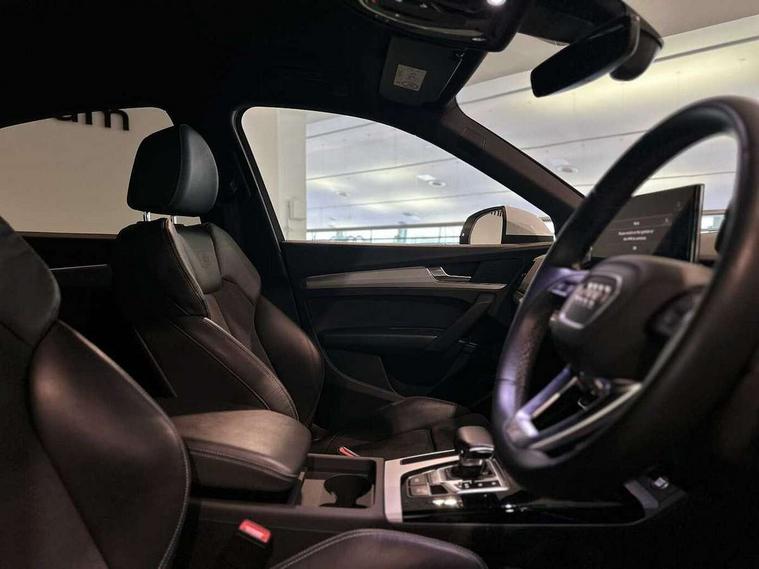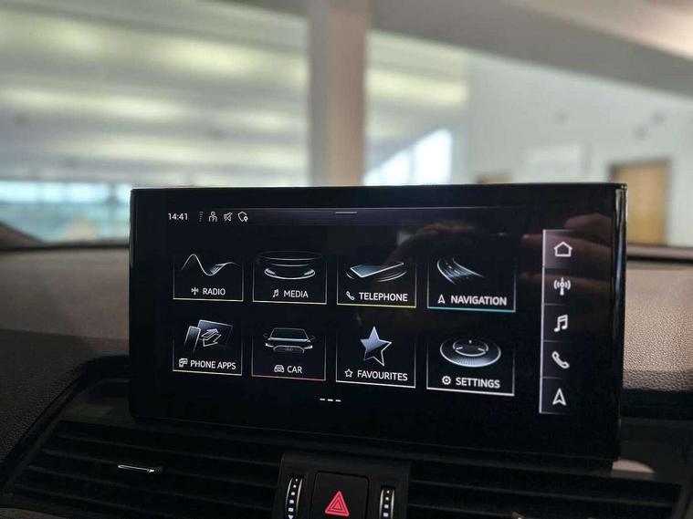 Acoustic front and rear parking sensor, Audi connect safety and service (e-call), Audi connect with Amazon Alexa Integration, Audi drive select, Audi virtual cockpit plus with 12.3" screen and three different layout designs, Audi wireless smartphone interface, Automatic start-stop system with coasting functionality and efficiency programme, Bluetooth interface, Electro - mechanical power assisted steering, MMI navigation plus with 10.1" touch screen, Power tailgate, Reversing camera, Service interval indicator, Voice control system with Audi hotword activation "Hey Audi", Diesel particulate filter, Quattro on demand, S line sports suspension, 8 loudspeakers, DAB Digital radio, 3rd brake light, Acoustic windscreen, Aluminium roof rails, Auto dimming door mirrors, Auto dimming frameless rear view mirror, Automatic headlight adjustment, Automatic headlights and windscreen wipers, Body colour bumpers, Body colour door mirrors, Body colour rear diffuser with matt aluminium silver surrounds, Body colour underbody protection, Chrome plated exhaust trims, Daytime running lights, Door sills in Selenite silver, Electric adjustable/heated/folding door mirrors, Front air inlet surrounds in aluminium, Front and rear electric windows, Front radiator grille in honeycomb design, LED headlights and LED tail lights, Lower bumpers painted in contrast Manhattan grey, Rear chrome trim strip below lights, Rear privacy glass and rear side windows, Rear side wing doors, Rear wiper, Roof bars, S Line badges on the front wing panels, S Line front and rear bumpers, S Line rear spoiler, S Line side skirts, 2 x USB charging port with aux input socket, 3 rear headrests, 3 spoke leather multifunction steering wheel with S badging perforated leather grips, Black cloth headlining, Comfort front centre armrest, Contrast stitching on seats, steering wheel and gear lever gaiter, Deluxe 3 zone electronic climate control, Front head restraints, Front sport seats with S embossed logo, Front/rear floor mats, Gear lever in black leather, Heated front seats, Height/reach adjustable steering column, Illuminated door sill trims with S logo, Loading edge protection in stainless steel, Luggage compartment cover, Manual seat adjustment with 4-way electric lumbar support, Single front passenger seat, Stainless steel pedals, Sunvisors with vanity mirrors, Tool kit, High gloss pack - Q5, LED interior light pack - Q5, 3 point seatbelts on all seats, 6 airbags - Driver, front passenger, curtain and side airbags, Electrically operated child locks on rear doors, Electromechanical parking brake, Electronic stabilisation control including ABS, ASR and EDL, First aid kit with warning triangle and vests, Front passenger airbag deactivation, Hill descent control, Hill hold assist, ISOFIX child seat mounting for front passenger seat and ISOFIX child seat mounting with Top Tether for outer rear seats, Multi collision brake assist, Pop-up bonnet for pedestrian protection, Pre sense city, Seatbelt monitoring, Tyre pressure warning, Anti theft alarm, Anti-theft wheel bolts, Remote central locking, Remote control key with SAFELOCK and keyless go, Air vents inserts and centre console in gloss black, Matt brushed aluminium inlays, Tyre repair kit,