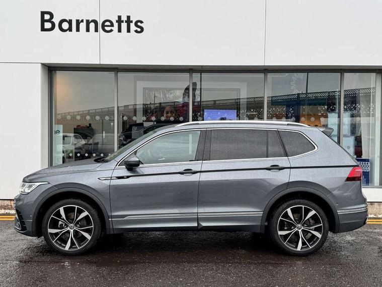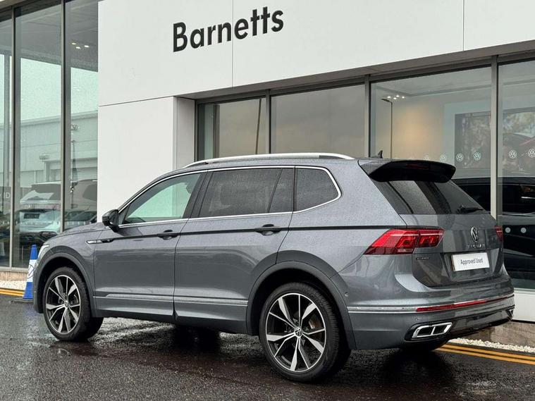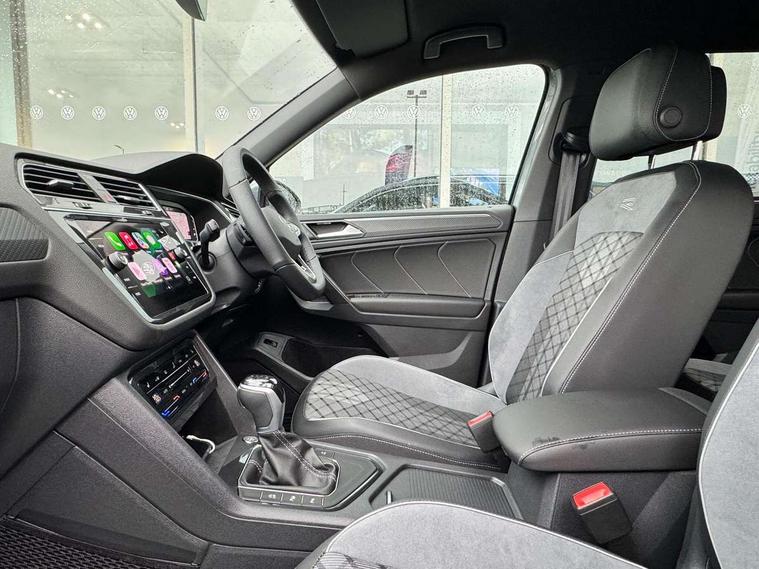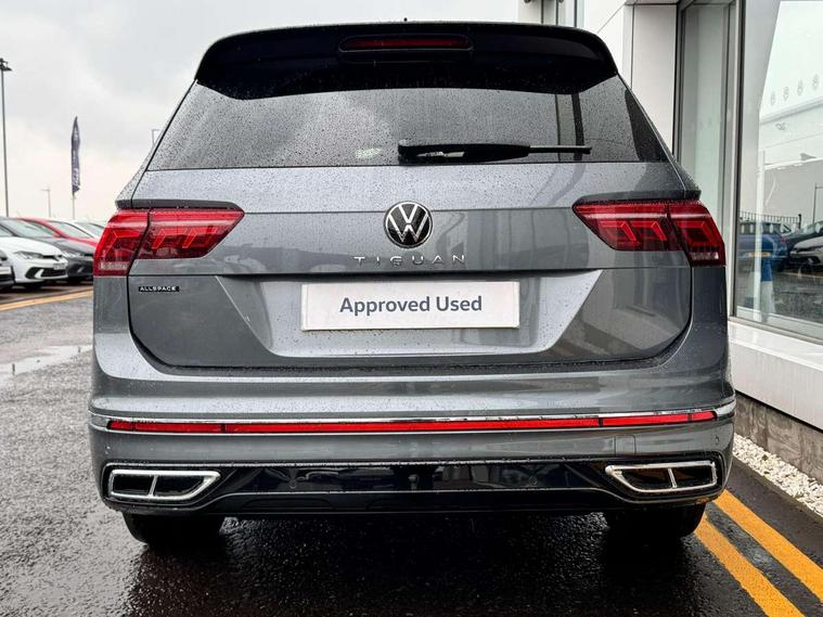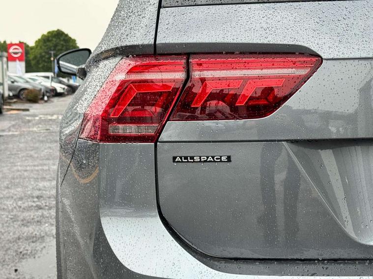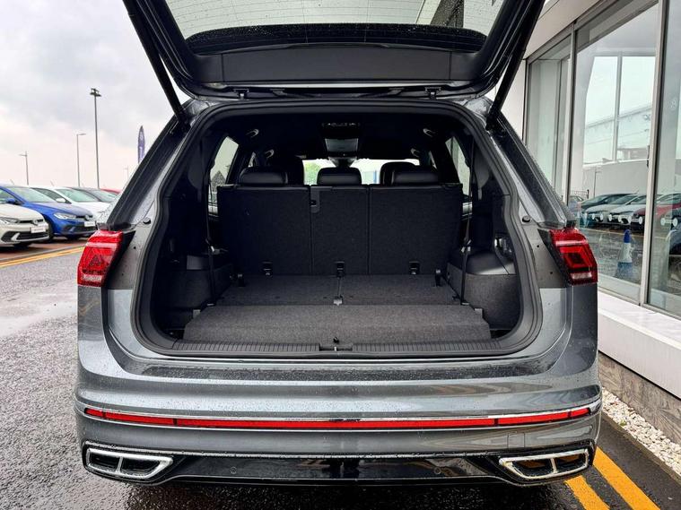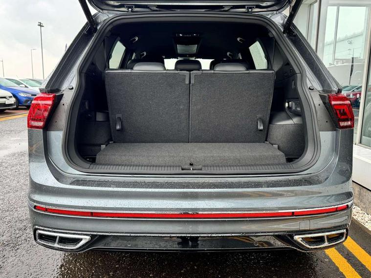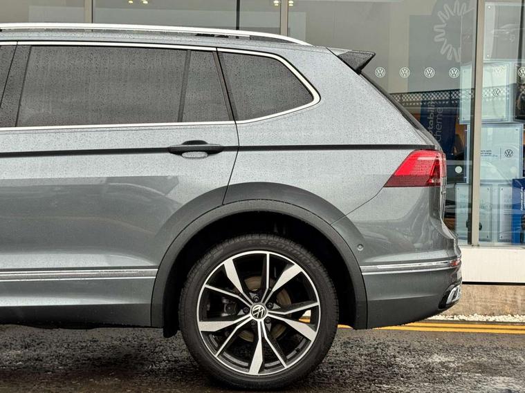 Adaptive cruise control, App-Connect, Digital cockpit pro, Driver alert system, Dynamic road sign display, eCall emergency call service, Electric boot lid, Lane change system side assist and rear traffic alert, Lane keeping system Lane Assist, Mobile phone interface comfort with inductive charging feature, Multifunction front facing camera, Progressive steering, Speedo and rev counter, electronic odometer, trip, service interval display and exterior temperature gauge, Start-stop system with battery regeneration (recuperation - energy recovery during braking), 2 USB-C ports in the front, 1 USB-C charging socket on the center console in the rear, 8 Speakers, DAB Digital radio, Diversity antenna for FM reception, Radio, Auto dimming interior rear view mirror, Automatic headlight control system, Chrome mouldings on side window, Coming/leaving home lighting function, Dark red rear combination lamps in LED technology, Exterior badge deletion, Exterior mirror housings painted in silver, Headlight range control, Heated windscreen washer jets, LED headlamps with LED separate signature running light and dynamic cornering light, Poor weather light and cornering light, Rain sensor, Rear fog light, Rear side wing doors, Rear spoiler in R style, Rear wiper, Silver roof rails, Third brake light, 12-volt outlet in centre console rear and luggage compartment, 12V socket in centre console, 3 head restraints in rear, 3 individual folding 2nd row seats, 3rd row 2 individual seats, Air Care Climatronic 3 zone automatic climate control with enhanced air filter and controls in the rear, Black roof lining, Door and side trim panel with leatherette insert, Drawers under front seats, Driver and front passenger seat height adjustment, Foldable front passenger seat backrest, Front + rear carpet mats, Front centre armrest, Front footwell illumination, Heated front seats, Heated leather wrapped multifunction sports steering wheel with touch control and shift paddles, Illuminated scuff plates, ISOFIX anchorage points for mounting 2 child seats on rear seats and i-Size child seats, Leather gearshift handle, LED interior light with switch off delay/dimmer and 2 front/rear LED reading lights, Stainless steel pedals, Sun visors with illuminated vanity mirrors, Ambience pack - Tiguan Allspace R Line, Driver assistance plus package - Tiguan Allspace, 3 point seat belt for centre rear seat, 3 rear three point seatbelts, ABS+EBD+Brake assist, Driver and front passenger safety-optimised head restraints, Driver's and front passenger's airbag with front passenger's airbag deactivation switch, Electronic parking brake, Electronic Stability Control (ESC) inc EDL (Electronic Differential Lock) and ASR (Traction Control), Height adjustable front 3 point seatbelts + pretensioners, Manual rear child locks, Pedestrian monitoring, PreCrash preventive occupant protection Front and rear, Rear disc brakes, Side airbag in front and rear with curtain airbag, Two tone horn, Warning buzzer for seatbelts if unfastened, Anti theft alarm system with interior monitoring, backup horn and towing protection, Anti-theft wheel bolts, Electronic steering lock, Remote central locking with 2 remote folding keys,