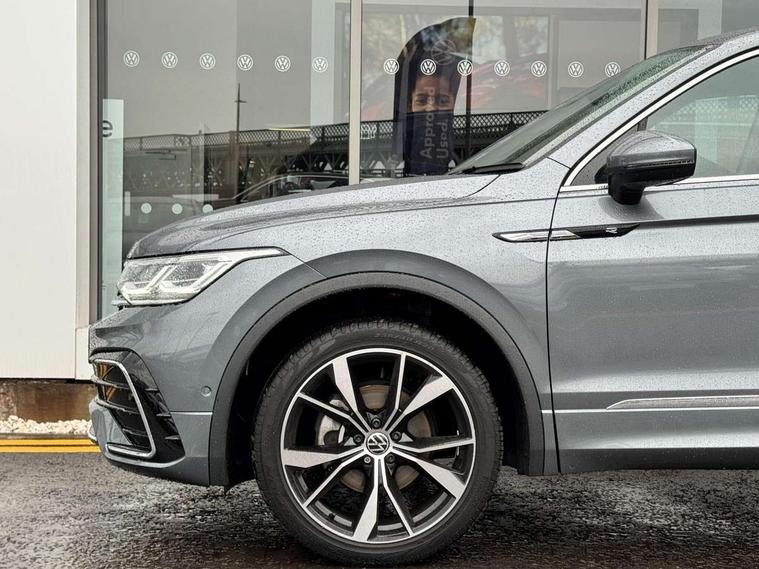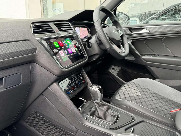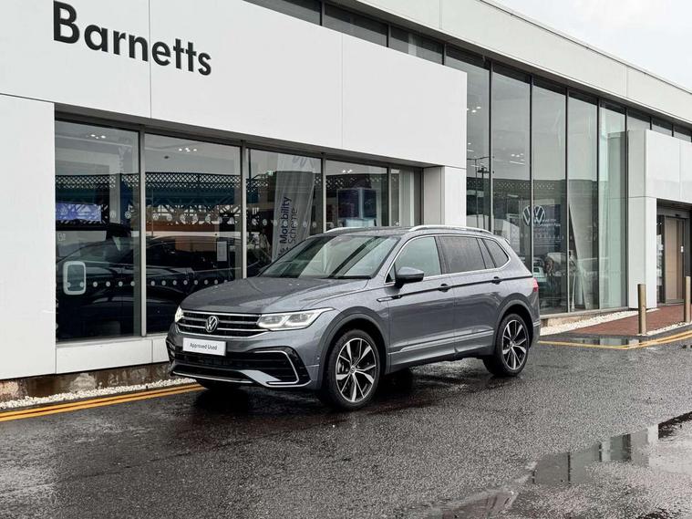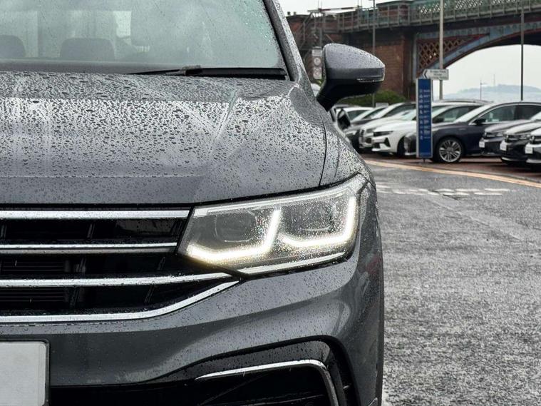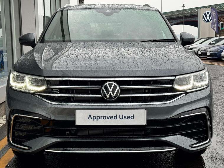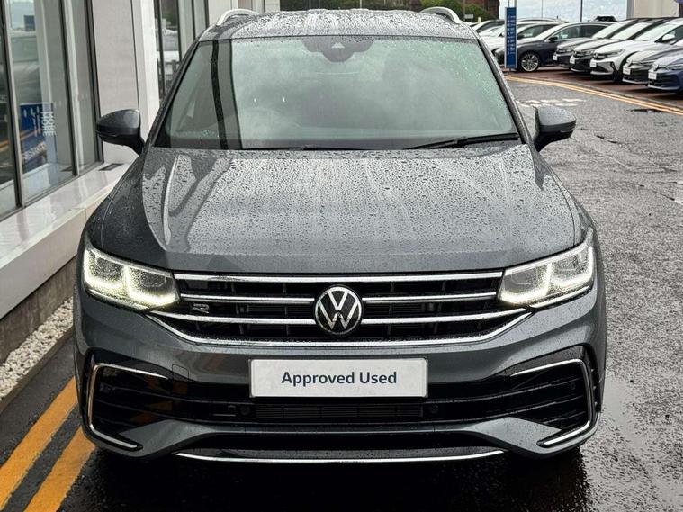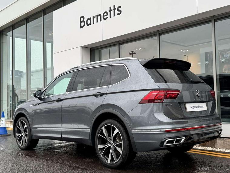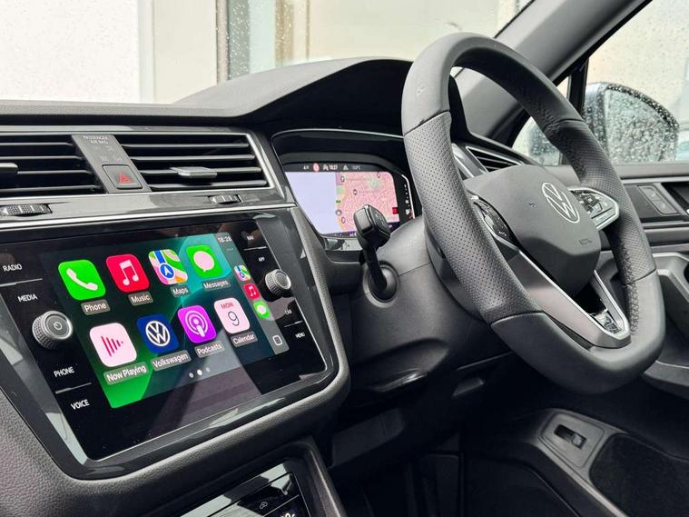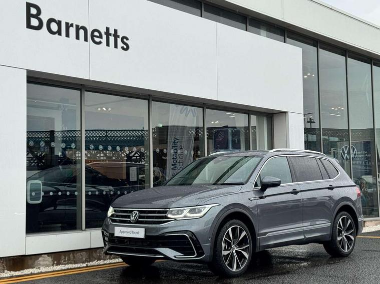 Adaptive cruise control, App-Connect, Digital cockpit pro, Driver alert system, Dynamic road sign display, eCall emergency call service, Electric boot lid, Lane change system side assist and rear traffic alert, Lane keeping system Lane Assist, Mobile phone interface comfort with inductive charging feature, Multifunction front facing camera, Progressive steering, Speedo and rev counter, electronic odometer, trip, service interval display and exterior temperature gauge, Start-stop system with battery regeneration (recuperation - energy recovery during braking), 2 USB-C ports in the front, 1 USB-C charging socket on the center console in the rear, 8 Speakers, DAB Digital radio, Diversity antenna for FM reception, Radio, Auto dimming interior rear view mirror, Automatic headlight control system, Chrome mouldings on side window, Coming/leaving home lighting function, Dark red rear combination lamps in LED technology, Exterior badge deletion, Exterior mirror housings painted in silver, Headlight range control, Heated windscreen washer jets, LED headlamps with LED separate signature running light and dynamic cornering light, Poor weather light and cornering light, Rain sensor, Rear fog light, Rear side wing doors, Rear spoiler in R style, Rear wiper, Silver roof rails, Third brake light, 12-volt outlet in centre console rear and luggage compartment, 12V socket in centre console, 3 head restraints in rear, 3 individual folding 2nd row seats, 3rd row 2 individual seats, Air Care Climatronic 3 zone automatic climate control with enhanced air filter and controls in the rear, Black roof lining, Door and side trim panel with leatherette insert, Drawers under front seats, Driver and front passenger seat height adjustment, Foldable front passenger seat backrest, Front + rear carpet mats, Front centre armrest, Front footwell illumination, Heated front seats, Heated leather wrapped multifunction sports steering wheel with touch control and shift paddles, Illuminated scuff plates, ISOFIX anchorage points for mounting 2 child seats on rear seats and i-Size child seats, Leather gearshift handle, LED interior light with switch off delay/dimmer and 2 front/rear LED reading lights, Stainless steel pedals, Sun visors with illuminated vanity mirrors, Ambience pack - Tiguan Allspace R Line, Driver assistance plus package - Tiguan Allspace, 3 point seat belt for centre rear seat, 3 rear three point seatbelts, ABS+EBD+Brake assist, Driver and front passenger safety-optimised head restraints, Driver's and front passenger's airbag with front passenger's airbag deactivation switch, Electronic parking brake, Electronic Stability Control (ESC) inc EDL (Electronic Differential Lock) and ASR (Traction Control), Height adjustable front 3 point seatbelts + pretensioners, Manual rear child locks, Pedestrian monitoring, PreCrash preventive occupant protection Front and rear, Rear disc brakes, Side airbag in front and rear with curtain airbag, Two tone horn, Warning buzzer for seatbelts if unfastened, Anti theft alarm system with interior monitoring, backup horn and towing protection, Anti-theft wheel bolts, Electronic steering lock, Remote central locking with 2 remote folding keys,