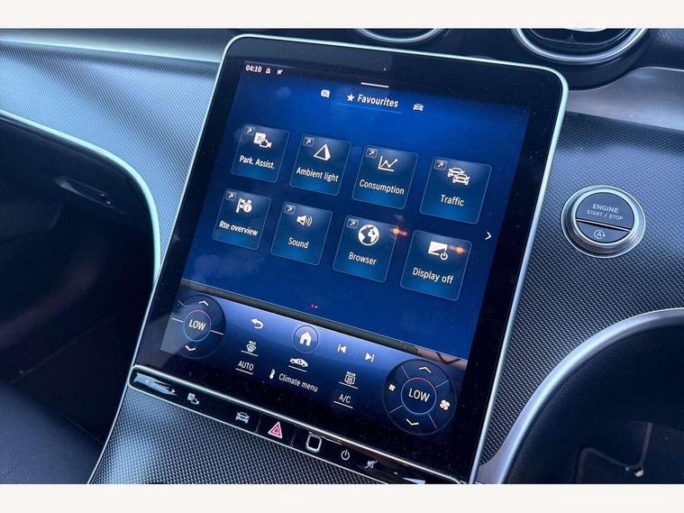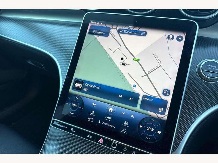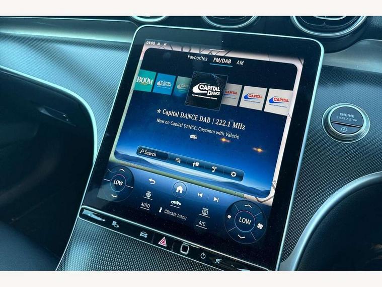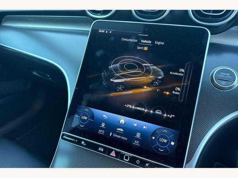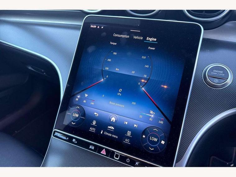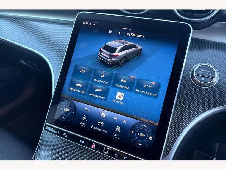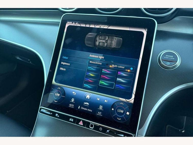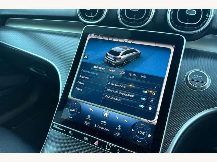 11.9" high resolution multimedia colour display, 12.3" digital instrument cluster display, Active blind spot assist, Active brake assist plus, Active lane keeping assist, Attention assist, Cruise control with speedtronic variable speed limiter, Direct steer speed sensitive steering, DYNAMIC SELECT with a choice of driving modes (ECO, Comfort, Sport, Sport+ and Individual), E-call, Easy pack automatic powered tailgate, Extended MBUX functions, Finger print sensor, Fluorescent jacket for driver, MBUX navigation premium, MBUX voice control activated by keywords "Hey Mercedes", Mercedes connect me, Mercedes me remote services, Outside temperature gauge, Pre-installation for digital key transfer, Remote boot release, Service indicator (ASSYST), Smartphone integration, Status display for rear seat belts in instrument cluster, 66l fuel tank with increased capacity, 9G TRONIC 9 speed automatic transmission, Agility control comfort suspension with selective damping system and lowered by 15mm, Petrol Particulate Filter, DAB Digital radio, MBUX multimedia system, Multifunction steering wheel with audio and onboard settings control, Adaptive brake lights, Adaptive high beam assist, B-pillar trim in glossy black, Body coloured bumpers, Body coloured door mirrors, Chrome beltline trim, Chrome roof rails, Daytime running lights, Dynamic design front bumper with chrome trims and air intakes in black, Electric windows with one touch opening/closing and obstruction sensors, Electrically adjustable and heated door mirrors, Green tinted glass, LED high performance headlamps, LED Indicators, LED tail lights, LED third brake light, Non visible exhaust pipes, Powerdomes on bonnet, Radiator grille with integrated star and single louvre in matt iridium silver with chrome trim, Radio aerial integrated into rear window, Rain sensor with automatic windscreen wiper activation, Rear bumper in vehicle colour with chrome wing in centre, Rear side wing doors, Rear wiper, Side skirts in vehicle colour, Side windows surround in polished aluminium, 3 spoke leather multi function steering wheel with silver chrome trim and perforated leather in grip area, 40:20:40 split folding rear bench seat, Auto Mercedes-Benz child seat recognition sensor, Black air vents with silver chrome elements, Black floor mats, Black roof liner, Door trim elements high gloss black with silver chrome surroundings and switches, Double cupholder in centre console, Folding rear seat backrest, Front and rear head restraints, Front centre armrest with storage compartment, Front door sills with Mercedes Benz lettering, Gearshift paddles on steering wheel, Heated front seats, Illuminated glove compartment stowage, Leather upholstery, Load compartment cover, Manually height and reach adjustable steering column, Overhead control unit in high gloss black, Rear top tether child seat ISOFIX attachment, Single front passenger seat, Sunvisors with illuminated vanity mirrors, THERMATIC 2 zone automatic climate control, Interior lighting package - C Class, Mirror pack - C Class, Parking package with reversing camera - C Class, Seat comfort pack - C Class, Stowage space pack - C Class, USB package - C Class, 3 rear 3 point seatbelts, Active bonnet pedestrian safety measure which detects an impact and raises bonnet, Adaptive brake system with HOLD function and brake drying in the wet, Anti-lock braking system (ABS), Black seat belts, Child proof door locks, Drivers knee airbag, Drivers pelvis airbag, Dual stage driver/passenger airbags, Electric parking brake, Electronic Stability Programme (ESP), Front centre airbag between driver and front passenger seats, Front side airbags, Rear passenger airbag, Rear seatbelt warning indicator, Tyre pressure monitoring system, Warning triangle and first aid kit, Window airbags, Central locking with interior switch, automatic locking and crash sensor with emergency opening function, Chrome surround electric key, Urban guard vehicle protection - Thatcham Category 1 consisting of breakin, anti-theft alarm system (ATA), interior monitoring and tow away protection, Centre console trim in silver grey diamond pattern, Dashboard in black with contrast stitching, 17" 5 spoke design alloy wheels painted in black with high sheen finish, Summer tyres, TIREFIT with tyre inflation compressor,