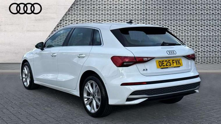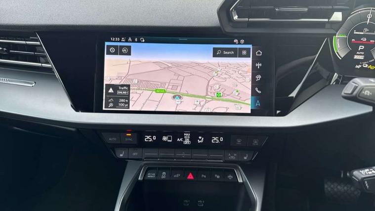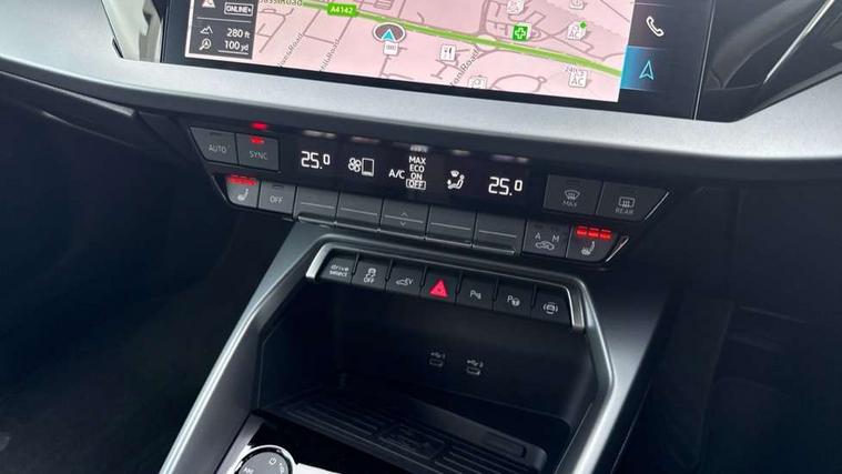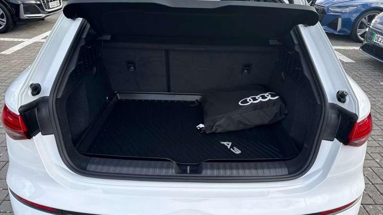 Adjustable speed limiter, Audi drive select, Audi smartphone interface with app store includes wireless Apple carplay, Android auto and Amazon alexa integration, Audi virtual cockpit plus - 12.3" full HD resolution dynamic digital instrument cluster, Automatic start/stop system with recuperation, Bluetooth interface, Camera based traffic sign recognition, Collision avoidance assistant, Cruise control, Distraction and Fatigue warning, e-Call (emergency call), Electromechanical power speed sensitive steering, Emergency assist, Lane departure warning system, MMI Navigation Plus with high resolution 10.1" colour touch screen display, Park Assist with parking system Plus, Service indicator, Trip computer, Voice control system with natural language interaction, 3 pin 10 amp domestic charging cable, CCS socket for DC charging, Charging cable for public charging, mode 3 (type 2), 32 A, Compact charging system, Industrial connector CEE 32 A, 230 V, length 1.6 m, Standard suspension, Type 2 socket for AC charging, Audi Phonebox light with wireless charging, Audi sound system - 10 loudspeakers including centre loudspeaker and subwoofer, DAB Digital radio, USB ports with charging function in the rear, 3rd brake light, Acoustic glass windscreen, Aluminium window trim, Auto dimming frameless rear view mirror, Body colour exterior mirrors, Body colour roof spoiler, Dipped beam, main beam, position light and turning light, Electrically adjustable/heated/folding/auto dimming door mirrors with integrated LED indications + kerb view function for passenger side, Exterior model badging, Front electric windows, Front radiator grill in high gloss dark chrome, Front side air inlets in grained matt black with silver frame, Heat insulating glass windscreen, LED daytime running lights, LED headlights and halogen rear lights, Light and rain sensors, Rear diffuser and grill in grained matt black with silver frame, Rear electric windows, Rear side wing doors, Rear window, rear door windows and rear side windows in clear glass, Rear wiper, 12V socket and storage compartment in front centre console, 3 seat bench in 2nd row, 3 spoke leather multifunction steering wheel with gear shift paddles, 3-zone deluxe automatic air conditioning, 4 way electrically adjustable lumbar support for driver and front passenger, 60/40 split folding rear seat bench, Black front and rear floor mats, Convenience auxiliary air conditioning, Front and rear headrests, Front centre armrest, Front door sill trims with aluminium inlay, Heated front seats, Height and reach adjustable steering wheel, Manual boot compartment lid, Manually adjustable front seats, Routine cloth upholstery with front sports seats, Seat side bolsters, Single front passenger seat, Steel grey cloth headlining, Aluminium interior elements pack - A3, LED interior lighting pack -A3, 3x3 point rear seat belts, Acoustic vehicle alerting system, Driver and front passenger airbag with passenger airbag deactivation, Electronic Stabilisation Control (ESC) including ABS, ASR and EDL, First aid kit with warning triangle and 2 safety vests, Front side airbags with head airbags and interaction airbag, Hill hold assist, Pre-sense front with pedestrian and cyclist detection, Seatbelt monitoring, Tyre pressure loss indicator, Anti theft alarm, Anti-theft wheel bolts, Electronically operated child locks, Immobiliser, Remote central locking with safelock, Black dashboard, Inlays in volcano grey fine paint finish, Tyre repair kit,