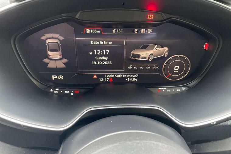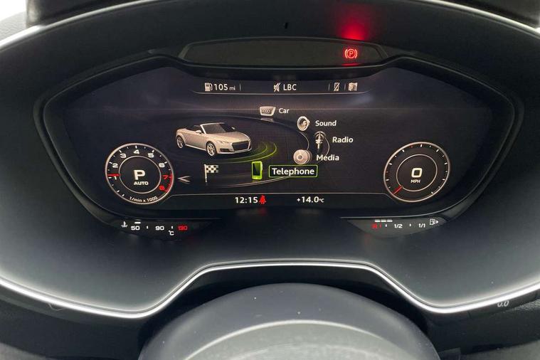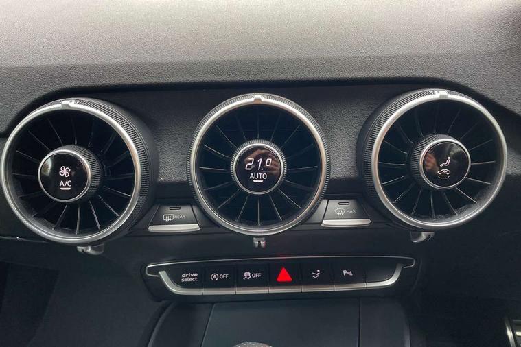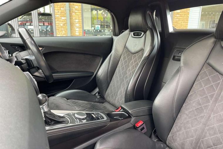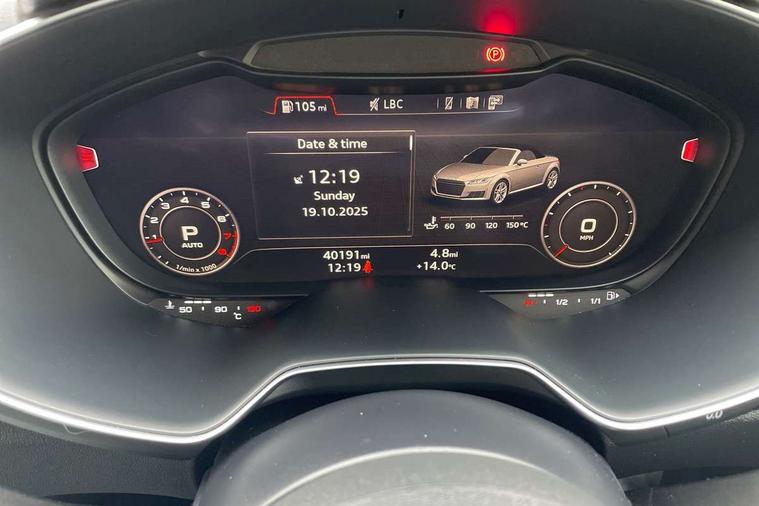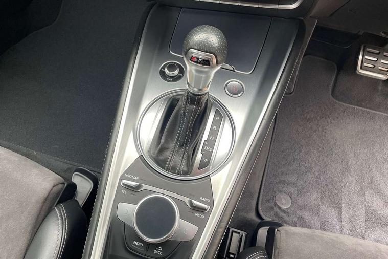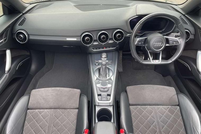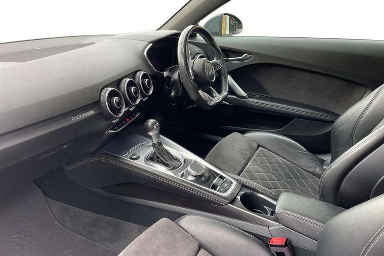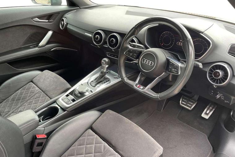 Audi active lane assist, Audi drive select with 4 Pre configured modes, Cruise control + speed limiter, MMI touch panel, Mobile phone preparation with bluetooth interface, Progressive power assisted steering, Rear parking sensors, Service interval indicator, Start/Stop system with energy recuperation, TP memo, 8 speakers, AM/FM radio, Audi music interface, Bluetooth audio streaming, DAB Digital radio, MMI Radio with CD player and SD/XC card slot, Auto dimming rear view mirror, Auto headlight range control, Body colour bumpers, Dynamic rear indicators, Electric front windows, Front fog lights, Green tinted heat insulating glass, Headlight wash system, High gloss black radiator grille, LED daytime running lights, Light and rain sensors, Retractable rear spoiler, S line badges on front wings, S Line body styling, S Line front and rear bumpers, S line rear diffuser with platinum grey insert, S line sill plates, Sunband for windscreen, 12V socket, 3 spoke flat bottomed high multi-function leather sport steering wheel with gearshift paddles, 4 way electric lumbar support for driver and front passenger, Black headlining, Door sill trims with S line logo, Extended aluminium look with stainless steel pedals, Front centre armrest, Front super sports seats, Heated front seats, Height adjustable driver's seat, Height adjustable front head restraints, Height/reach adjust steering wheel, ISOFIX child seat mounting for front passenger seat with airbag deactivation, Perforated leather gearknob, Rear head restraints, Rear top tether child seat ISOFIX attachment, S Line badge on steering wheel, Split folding rear seat, Tool kit, Top tether anchor plate for isofix child seat, Non smoking pack - TT/TT RS, 3 point front seat belts, ABS, ASR traction control, Brake energy regeneration, Curtain airbags, Driver and front passenger airbag with front passenger airbag deactivation, EDL traction control, Electromechanical parking brake, ESP, First aid kit, Front side airbags, Head airbags, Hill hold assist, Roll bar in glossy black, Seatbelt warning, Tyre pressure warning, Warning triangle, Anti theft alarm, Anti theft wheel bolts, Immobiliser, Keyless Go, Remote central locking, Matt brushed aluminium inlays, Tyre repair kit,