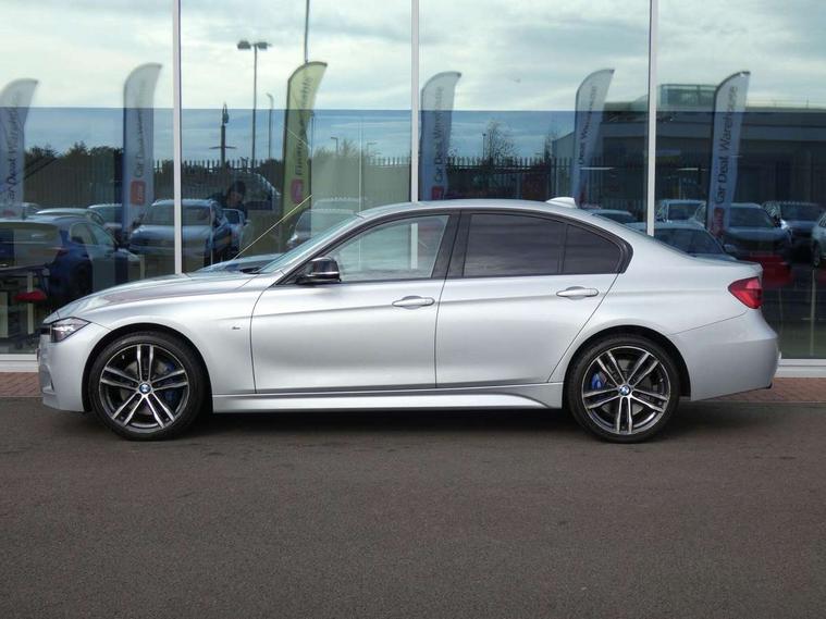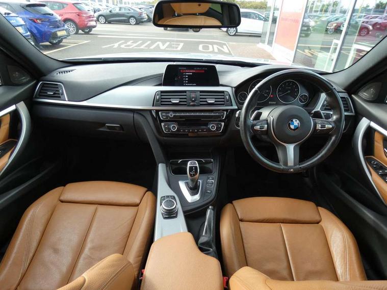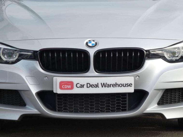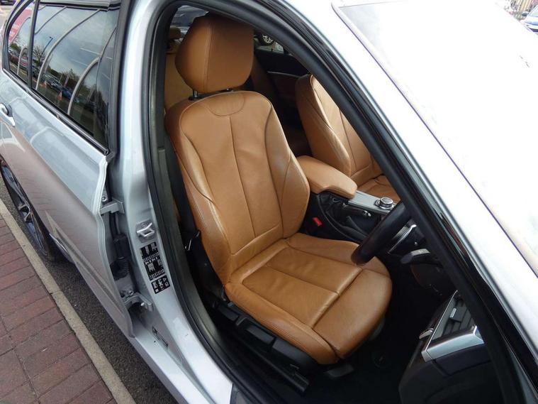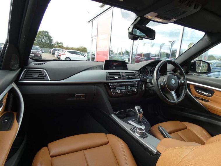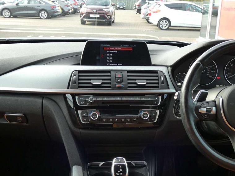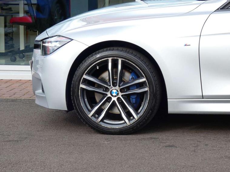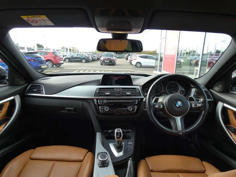 BMW Online services, BMW remote services, BMW Teleservices, Brake force display, Brake pad wear indicator warning light, Check control system, Digital clock, Door/boot open warning light, Lights on warning, Oil temperature gauge, On board computer, On board diagnostics, Operation warning of all exterior lights, Outside temperature display, Push button starter, Real time traffic information, Run flat tyre indicator, Service interval indicator, Traffic message channel (TMC), Drive Performance Control, Electronic differential lock, Sports function on gearbox with steering wheel mounted gearshift paddles, BMW professional radio/CD/MP3, CD Changer preparation, DAB Digital radio, Harman/Kardon logic 7 surround sound system, 'Guide me home' headlamps, 2 speed adjustable intermittent wipers with wash/wipe function, Auto dimming rear view mirror, Automatic headlight beam throw control, Black high gloss door mirrors, Body colour bumpers, Body colour door handles, Body colour roof mouldings, Clear indicator lenses, Dark chrome exhaust tailpipe, Dark headlamp surround, Door sill finishers, Dynamic brake lights, Electric adjustable door mirrors, Electric front and rear windows with one touch/convenient open/close function, Green tinted heat insulating glass, Heated rear window with automatic switch off, Heated windscreen washer jets, High beam assistant, High gloss shadow line, Individual sun protection dark tinted glazing for rear window and rear side door windows, kidney grille with high gloss black vertical slats, LED daytime running lights, LED fog lights, Rain sensor + automatic driving lights control, Shark fin roof aerial, 12V sockets in front centre console and passenger footwell, 2 x folding cupholders in instrument panel above glovebox, 3 rear seat head restraints, 4 foldable grab handles - rear with clothes hook, 4 lashing points to secure luggage, 40:20:40 split folding rear bench seat, Automatic interior light soft on/soft off system, Driver and passenger sunvisors with vanity mirrors + slide cover, Dual zone automatic air conditioning, Folding front centre armrest + storage, Front and rear door armrests, Front and rear velour floor mats, Front door storage bins with bottle holder, Front sports seats with electric side bolster adjustment, Glovebox light, Height adjustable front headrests, Indirect front interior illumination - soft-light function, Individual anthracite headlining, Isofix system on outer rear seats, Leather gear knob, Leather gear selector lever handle, Leather handbrake grip, Lockable glovebox, Luggage compartment lighting, Multi-function controls for steering wheel, Reach + rake adjustable steering column, Rear centre armrest with 2 cupholders, Rear storage compartment in multifunction centre console with sliding cover, Storage compartment in rear doors, Toolkit located in luggage compartment, Extended lighting package - 3 Series, Extended storage pack - 3 Series Saloon, 3 point inertia reel seatbelts + pre-tensioners on outer rear seats, ABS, Automatic Stability Control (ASC), BMW emergency call, Cornering brake control (CBC), Crash sensor, Driver and passenger airbags, DSC+, Dynamic brake control, Dynamic Traction Control - DTC, Front and rear head airbags, Front passenger airbag deactivation, Front seat side impact airbags, Front seatbelt pretensioners + load limiters, Hill start assist, M Sport braking system, Rear child proof door locks, Seatbelt warning, Three 3 point rear seatbelts, Twin horns, Tyre pressure monitor, Warning triangle and first aid kit, Automatic drive away locking facility, Central locking fuel filler cap, Centre lock switch, Electronic immobiliser, Key integrated remote control central locking, Remote control alarm, 19" M double spoke alloy wheels style in bicolour orbit grey - style 704M, Low rolling resistance tyres, Run-flat tyres,