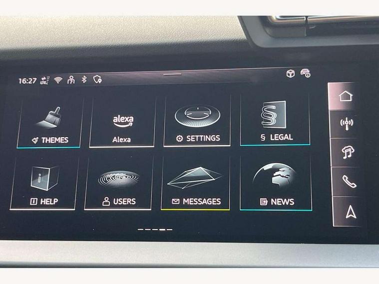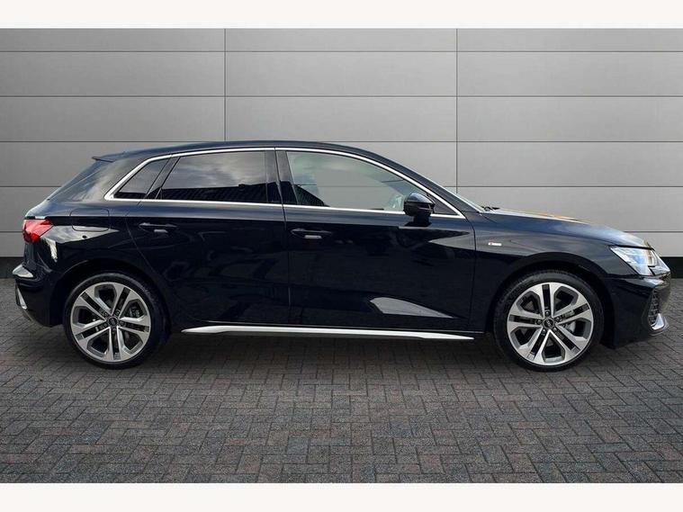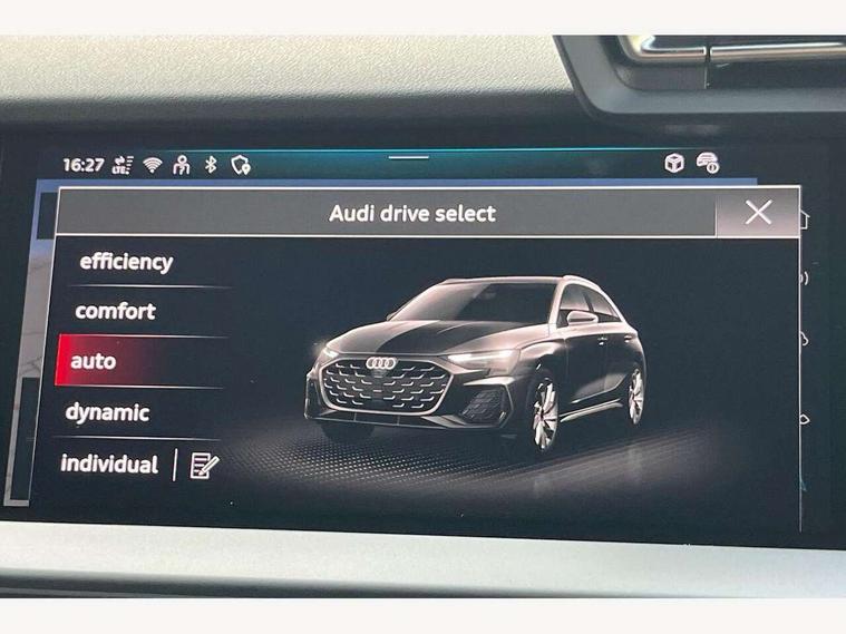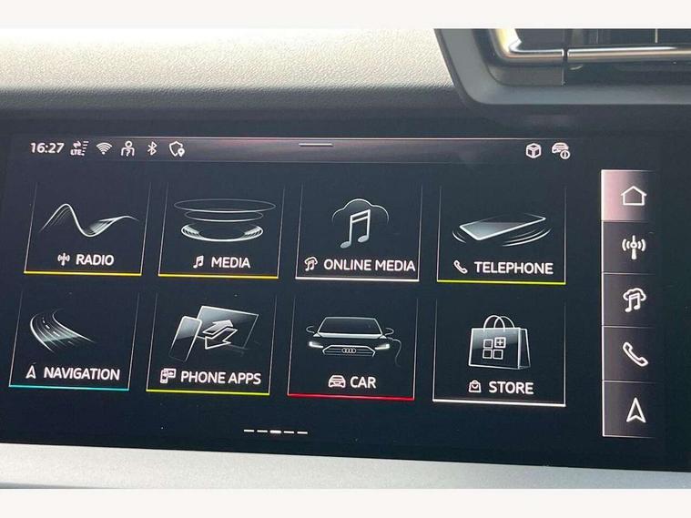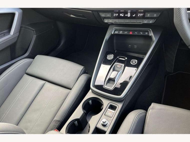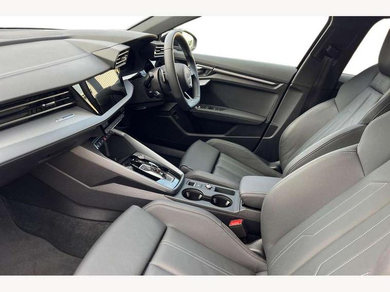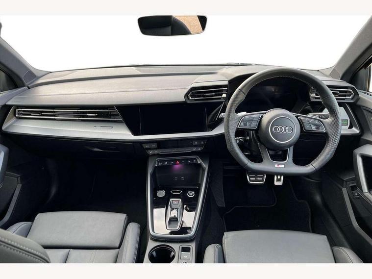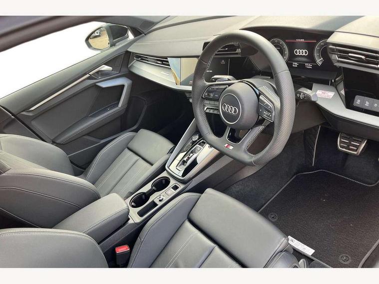 Adjustable speed limiter, Audi drive select, Audi smartphone interface with app store includes wireless Apple carplay, Android auto and Amazon alexa integration, Audi virtual cockpit plus - 12.3" full HD resolution dynamic digital instrument cluster, Automatic start/stop system with recuperation, Bluetooth interface, Camera based traffic sign recognition, Collision avoidance assistant, Cruise control, Distraction and Fatigue warning, e-Call (emergency call), Electromechanical power speed sensitive steering, Lane departure warning system, MMI Navigation Plus with high resolution 10.1" colour touch screen display, Park Assist with parking system Plus, Service indicator, Trip computer, Voice control system with natural language interaction, 3 pin 10 amp domestic charging cable, CCS socket for DC charging, Charging cable for public charging, mode 3 (type 2), up to 22 kW (AC), Compact charging system, Industrial connector CEE 32 A, 230 V, length 1.6 m, Standard suspension, Type 2 socket for AC charging, Audi Phonebox light with wireless charging, Audi sound system - 10 loudspeakers including centre loudspeaker and subwoofer, DAB Digital radio, USB ports with charging function in the rear, Acoustic glass windscreen, Aluminium window trim, Auto dimming frameless rear view mirror, Body colour exterior mirrors, Chrome exhaust tailpipes, Electrically adjustable/heated/folding/auto dimming door mirrors with integrated LED indications + kerb view function for passenger side, Exterior model badging, Front and rear side air inlets in grained matt black with dark liquid chrome frame, Front electric windows, Front radiator grill in high gloss dark chrome, Heat insulating glass windscreen, Illuminated door sills with aluminium inserts at the front with S logo, LED 3rd brake light, LED daytime running lights, LED headlights with LED rear lights and dynamic rear indicators, Light and rain sensors, Privacy glass - dark tinted rear window, rear door and side windows, Rear diffuser and grill in grained matt black with inlay in dark liquid chrome, Rear electric windows, Rear side wing doors, Rear wiper, S line bumpers, S roof spoiler, Side S line emblems on front wings, Side sill trim in dark liquid chrome, 12V socket and storage compartment in front centre console, 3 seat bench in 2nd row, 3 spoke flat bottomed leather multifunction sport steering wheel with gear shift paddles, 3-zone deluxe automatic air conditioning, 4 way electrically adjustable lumbar support for driver and front passenger, 40/20/40 split folding rear seat bench, Black cloth headlining, Convenience auxiliary air conditioning, Front and rear centre armrest in artificial leather, Front and rear centre armrest in artificial leather with contrasting stitching on armrests and instrument panel, Front and rear headrests, Front/rear floor mats, Heated front seats, Height and reach adjustable steering wheel, Manual boot compartment lid, Manually adjustable front seats, Rear cup holders, S badging on the steering wheel, Seat side bolsters, Single front passenger seat, Stainless steel pedals and front footrest in black, Twin leather upholstery with front sports seats S embossed logo, Aluminium interior elements pack - A3 Sportback, Multi-coloured LED interior lighting package - A3, 3x3 point rear seat belts, Acoustic vehicle alerting system, Driver and front passenger airbag with passenger airbag deactivation, Electronic Stabilisation Control (ESC) including ABS, ASR and EDL, First aid kit with warning triangle and 2 safety vests, Front side airbags with head airbags and interaction airbag, Hill hold assist, Pre-sense front with pedestrian and cyclist detection, Seatbelt monitoring, Tyre pressure loss indicator, Anti theft alarm, Anti-theft wheel bolts, Electronically operated child locks, Immobiliser, Remote central locking with safelock, Dash & door Inlay in dark aluminium Spectrum, Tyre repair kit,