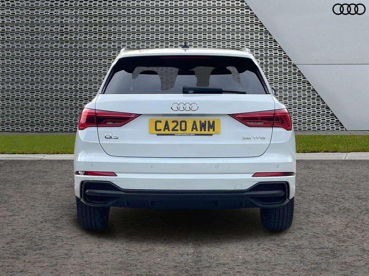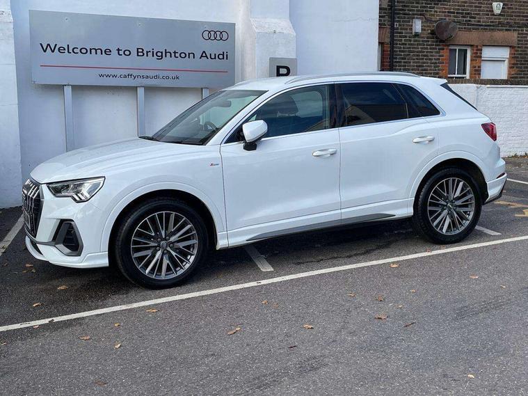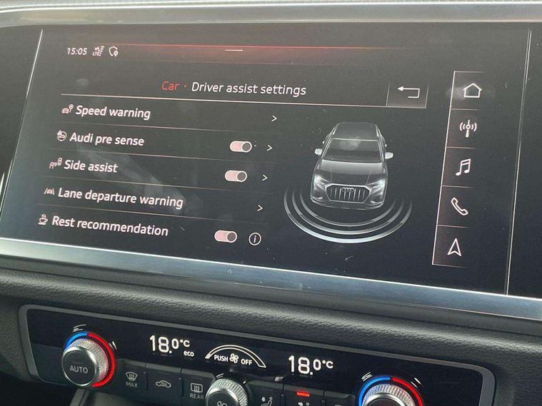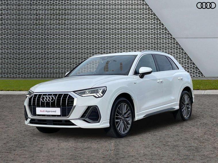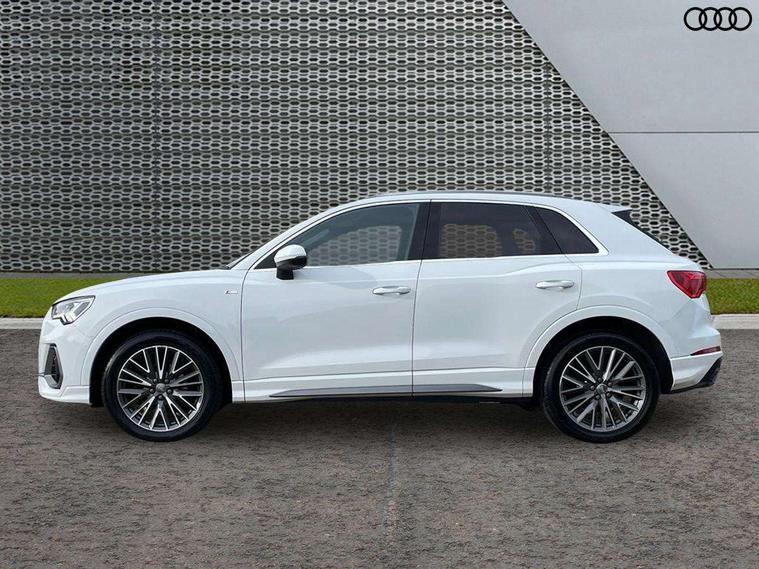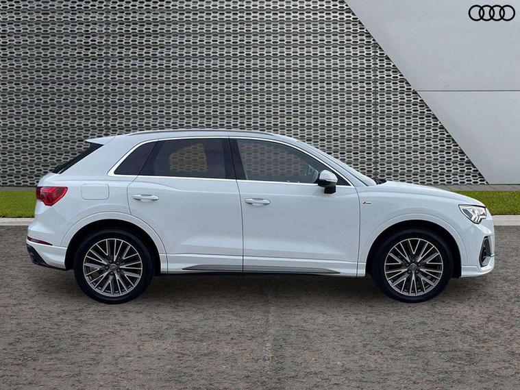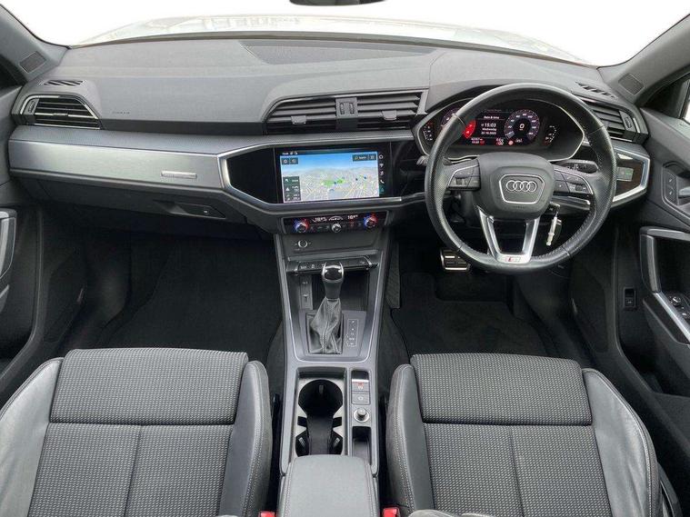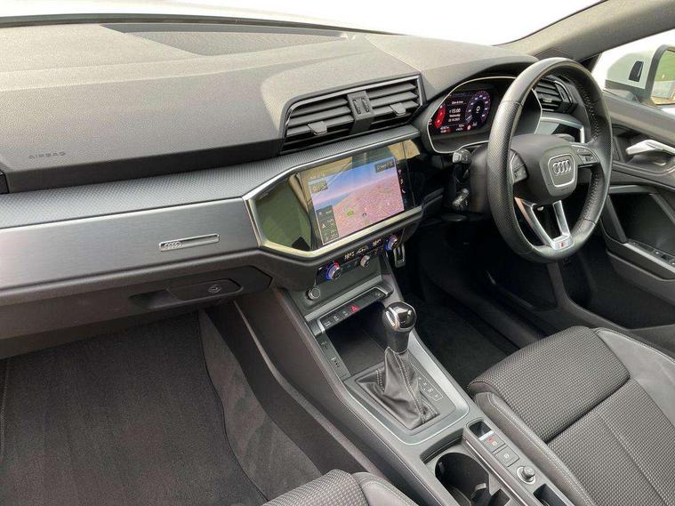 Audi connect safety and service (e-call), Audi drive select, Audi lane departure warning, Audi side assist, Audi smartphone interface includes wireless Apple carplay/Android Auto, Audi Virtual Cockpit - 10.25" display, Bluetooth interface, Camera based traffic sign recognition, MMI Navigation Plus with high resolution 10.1 inch touchscreen colour display, Power operated tailgate, Progressive steering, Service interval indicator, Start stop system with recuperation, Voice control system with natural language interaction, 48V Mild hybrid technology, Sports suspension, 1 x USB type C and 1 USB type A charging points, 6 passive loudspeakers, DAB digital radio module, Acoustic windscreen, Aluminium roof rails, Aluminium window trim, Auto dimming frameless rear view mirror, Body coloured bumpers, Electrically folding, adjustable and heated door mirrors with integrated LED side indicators and kerb view function for passenger side, Front and rear electric windows, Front fog lights, Front side air inlets in matt platinum grey, Front spoiler blade in matt platinum grey, Grille vertical bars in aluminium silver/Matt, High gloss black finish B and C pillars, LED headlights with LED daytime running lights and dynamic rear indicator, LED rear lights, Privacy glass dark tinted rear and rear-side windows (from B-pillar backwards), Rain and light sensors, Rear diffuser strip in matt titanium black, S line badges on front wings, S Line front and rear bumpers, Side skirt insert in matt Platinium grey, Silver chrome grille surround, Titanium black radiator grille, 12V socket in rear centre console, 40:20:40 folding with manual adjustment for 60:40 forwards/backwards position and backrest angle, Adjustable rear seat bench/backrest with centre armrest and cupholder, Black cloth headlining, Dual zone electronic climate control, Front and rear black floor mats with contrast stitching in rock grey, Front and rear headrests, Front and rear roof module including reading lights, Front centre armrest, Glove compartment lighting, Height and reach adjustable steering wheel, Illuminated door sill trims with S logo, ISOFIX child seat mounting for front passenger with airbag deactivation and outer rear seat including top tether attachment point for outer rear seats, Luggage compartment light, Manual front seats with height adjustment, Perforated leather gearknob, Stainless steel luggage compartment sill finisher, Stainless steel pedals, Tool kit, Non smoking pack - Q3, 3x3 point rear seatbelts, 6 airbags - Driver, front passenger, curtain and side windows, Electrically operated child locks on rear doors, Electromechanical parking brake, Electronic stabilisation control including ABS, ASR and EDL, Hill descent control, Hill hold assist, Pre sense basic, Seatbelt monitoring, Tyre pressure warning, Warning triangle and first aid kit, Anti theft alarm, Anti theft wheel bolts, Audi pre-sense front with pedestrain and cyclist recognition, Remote central locking, Dark matt brushed aluminium inlay, Leatherette door armrest, MMI touch colour display in glass look, black with surround in aluminium look, Tyre repair kit,