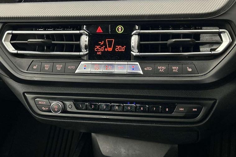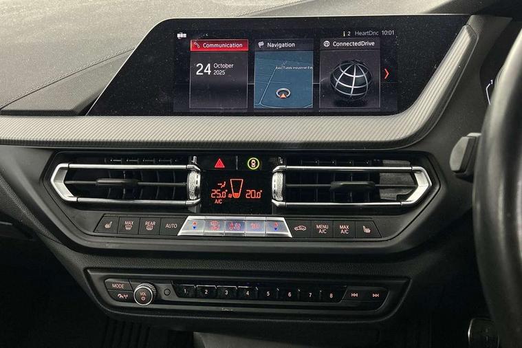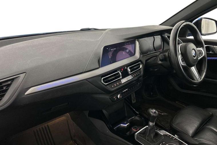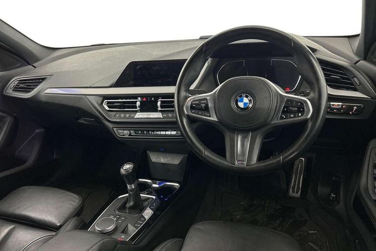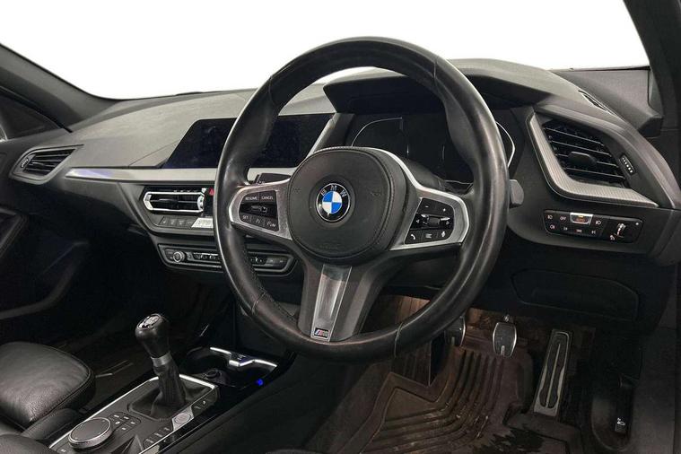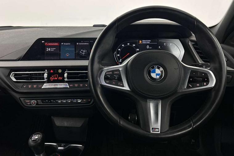 Active guard plus, Attentiveness assist, BMW Online services, BMW Teleservices, Check Control warning system for monitoring of lights and door/luggage compartment open warning, Connected eDrive Services, Cruise control with brake assist, Eco pro mode, Electric power steering, Integrated owners handbook, Lane departure warning system, On board computer, Optimum shift indicator, Personal Profile, Pull away assistant, Speed limiter, Anti roll bar front and rear, Balancer shaft, Double VANOS, Drive Performance Control, Electronic differential lock, M sports suspension + self levelling, Petrol Particulate Filter, VALVETRONIC engine management, Bluetooth audio streaming, DAB Digital radio, Auto dimming rear view mirror, Body colour door handles, Body colour mirror caps, Chrome 'M' logo side designation, Chrome exhaust tailpipe in single, round (Exhaust tailpipe, stainless steel - single, round), Chrome kidney grille frame with Satin Aluminium struts, Direction indicator side lights in exterior mirrors, Electric folding and anti dazzle exterior mirrors, Fading support, Follow me home headlights, Front and rear electric windows with open and close fingertip control, anti trap facility and comfort closing, Front door sill finishers in black plastic with BMW designation, Green tinted heat protection glazing, Headlight beam throw control, High gloss shadow line exterior trim, High level third brake light, LED daytime running lights, LED front fog lights, Lightweight engineering, Matt black air guide grilles, Matt black roof moulding, B pillar finisher and wheel arch trim, Matt black window frame, Model designation on right side of tailgate, Nearside reverse light in rear light cluster, Rain sensor including auto headlights activation, Rear fog lights, Rear window wiper, Shark fin antenna, Visible VIN plate, Welcome lighting, Windscreen wipers with integrated washing jets, 12V power socket in centre console, 2 cupholders in front centre console, 3 rear seat head restraints, 3 spoke M sports design leather steering wheel finished in nappa leather with specific M badge, Anthracite headlining, Anthracite Velour floor mats, Child seat ISOFIX attachment for two outer rear seats and front passenger seat with anchorage points, Conditioned based service, Dakota leather upholstery with perforation and contrast stitching, Driver and front passenger seat heating, Driver side folding compartment in instrument panel, Folding rear clothes hook, Folding rear seats, Four grab handles integrated in roof lining, Front and rear door pockets, Front and rear side armrest integrated into door trim, Front Armrest foldable with integrated storage compartment, Front sports seats with electric side bolster adjustment, Gearshift lever with M designation, Glove compartment, Height adjustable front head restraints, Manual adjust steering wheel, Multi-function controls for steering wheel, Rear seat backrest with manual 60:40 split folding with 3 top tether clips integrated on rear of seat panels, Storage compartment in centre console, Sun visors with vanity mirrors and insert tab, Two zone automatic air conditioning, Extended Lighting pack - 1 Series, Extended storage pack - 1 Series, Interior lights pack - 1 Series, Luggage compartment pack - 1 Series, M Sport exterior styling aerodynamics pack - 1 Series, 2 tone horn, 3 point seatbelts on all seats, front pyrotechnic belt tensioners, stopper and belt force limiters, rear coded belt buckles, Airbags - Front driver and passenger, front and rear head, front side, curtain head protection, Anti lock braking system (ABS) with brake assist, BMW emergency call, Brake drying, Braking readiness, City braking function, Crash sensor activating central locking release, hazard warning lights, fuel cut off, interior lighting + activation of safety battery terminal clamp, Driver and front passenger seat belt security check, Dynamic stability control + (DSC+), Dynamic Traction Control - DTC, Electrically operated hand brake, Front passenger manual airbag deactivation, Rear child proof door locks, Seatbelt warning, Side impact protection, Tyre pressure monitoring system, Warning triangle and first aid kit, Automatic drive away locking facility, Central locking switch for all doors, fuel filler cap and luggage compartment, Deadlocking function system to all doors, Locking wheel bolts, Remote control with integrated key with High-gloss Black inlay and M designation and 1 button for open/ close lock, window, open luggage compartment, Start/stop button with comfort go keyless engine start and auto start stop deactivation button, Thatcham Cat.1 alarm and immobiliser, Contrast stitching on instrument panel, Reduced rolling resistance tyres,