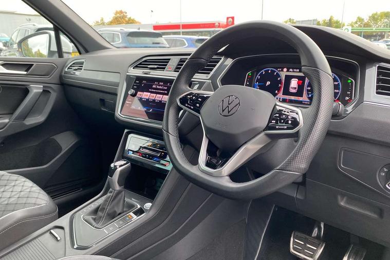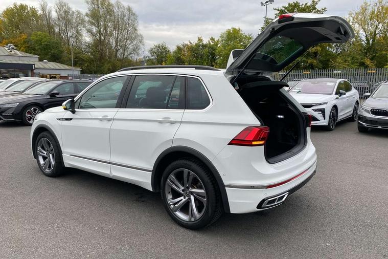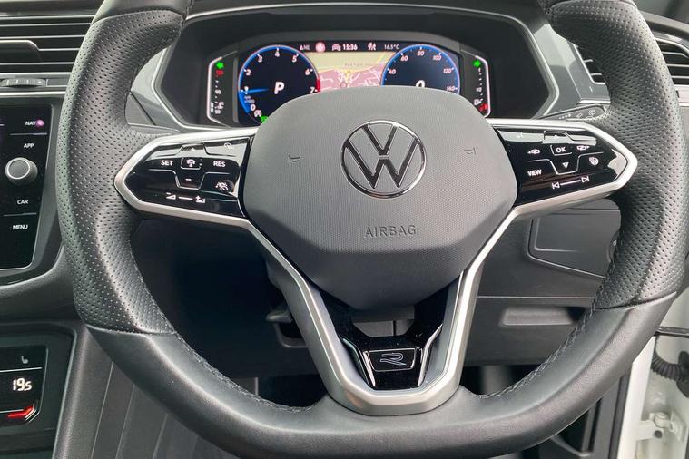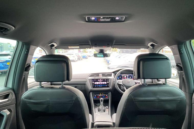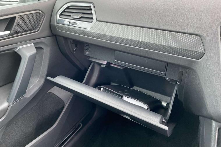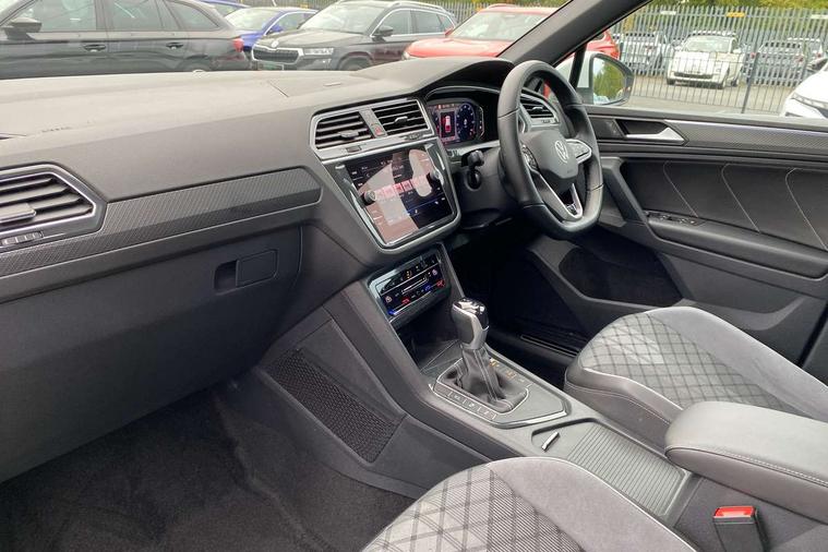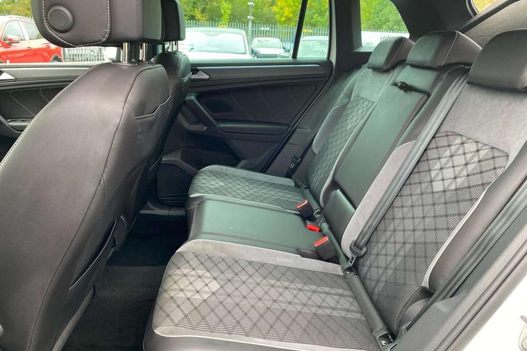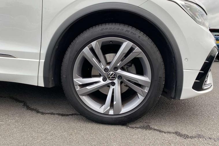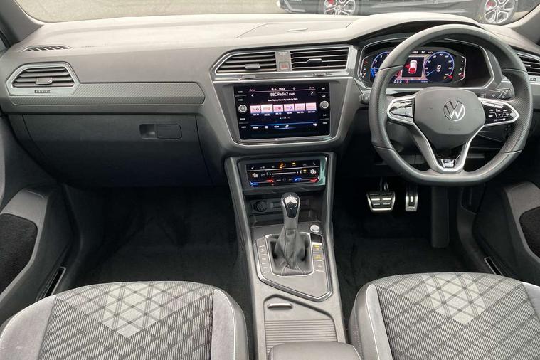 Adaptive cruise control ACC stop and go including speed limiter, App-Connect incl. App-Connect Wireless for Apple CarPlay and Android Auto, Bluetooth phone integration system, Comfort drive travel assist, Digital cockpit pro, Driver alert system, Driver profile selection, Dynamic road sign display, eCall emergency call system, Electromechanical speed sensitive power steering, Emergency assist, Front and rear parking distance sensors, Instrument cluster mph speedometer Great Britain, Lane keeping system Lane Assist, Lights on warning, Multifunction front facing camera, Outside temperature display, Premium multifunction display with multi colour display, Preparation for subsequent activation Navigation feature Discover Media includes Streaming and Internet, Remote control boot opening, Rev counter, Service interval indicator, Speed limit display, Start/stop system with regenerative braking, Tailgate/trunk lid unlocking from outside, Trip computer, Warning sound and light for doors and tailgate open, Battery regeneration during braking, Sports suspension, 8 Speakers, Digital radio reception DAB+, Diversity antenna for FM reception, Radio, Auto dimming interior rear view mirror, Automatic headlight control system, Body colored bumpers in R-Line style, Body colored exterior mirror housings, Body colour door handles, Chrome moldings on the side windows, Coming/leaving home lighting function, Dynamic headlight range control, Front and rear electric windows, Heated rear window, High level 3rd brake light, Laminated safety glass windshield, heat and sound insulating, LED headlamps with LED separate daytime running light and dynamic cornering light, LED rear combination lamps, LED rear number plate lights, License plate carrier in front and rear, Poor weather light and cornering light, Power adjustable, folding and heated door mirrors with surround lighting, front passenger exterior mirror lowering function, Privacy glass for rear side windows and rear window, R Line body kit, R Line side sills, Rain sensor, Rear exhaust tailpipe, Rear fog lamp, Rear side wing doors, Rear spoiler in R style, Rear windscreen washer and wiper with interval delay, Side and rear windows in heat insulating glass, Trailer Stability Programme, Unique R Line badging, Windscreen wipers/ intermittent wipe + 4 position delay, 12V outlet in center console rear and in luggage compartment, 12V outlet in front and tray, 2 LED front reading lights, 2 LED rear reading lights, 3 bench rear seats in 2nd row, 3 rear headrests, Air Care Climatronic 3 zone automatic climate control with enhanced air filter and controls in the rear, Art Velours greyson sports cloth upholstery, Backrest release for left front seat, Black headlining, Brushed stainless steel pedals and footrest, Carpet mats in front and rear with decorative stitching in Gray, Climate control unit rear with touch function, Door and side trim panel in foam film, insert in leatherette, Driver + front passenger lumbar support, Front footwell illumination, Front scuff plates in aluminum with R-Line logo, Front seats head restraints (x-adjustment), Height adjustable front seats, Height/reach adjust steering wheel, Isofix Preparation 2 Rear child seats, Leather gear knob, Rear bench seat asymetrically split folding, longitudinally movable and folding with load-through hatch and center armrest, Remote unlocking for rear seat backrest, Single front passenger seat, Sun visors with illuminated vanity mirrors, Top front comfort seats, Winter pack - Tiguan, 3 point seat belt for centre rear seats, 3 point seat belts with seat belt pretensioners for the outer rear seats, Curtain airbags for front and rear passengers, Driver/Front Passenger airbags, Drivers knee airbag, Electronic parking brake with auto hold, Electronic Stability Control with driver steering recommendation, ABS, ASR, EDL, EDTC and trailer stabilization, Front assist with autonomous emergency braking (for Adaptive Cruise Control ACC up to 130 mph), Front disc brakes, Front passenger airbag deactivation, Front side airbags, Height adjustable front 3 point seatbelts + pretensioners, Manual child proof rear door locks, Pedestrian monitoring system, Proactive passenger protection system in combination with front assist, Rear disc brakes, Two tone horn, Tyre pressure loss indicator, Warning sound and light for front seat belts if unfastened, Warning triangle, Anti theft alarm system with interior monitoring, backup horn and towing protection, Anti theft wheel bolts, Electronic engine immobiliser, Keyless locking and starting system keyless access with safelock, Chrome elements on the mirror switch power window switches and door pulls, Decorative inserts Carbon Gray for dashboard and front door trim panels, Interior door handle in matte chrome, 19" Valencia alloy wheels with AirStop tyres, Tool kit, Tyre mobility kit Includes 12V compressor and tyre sealant,