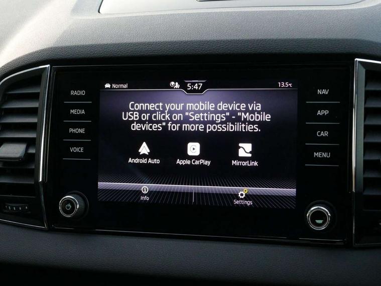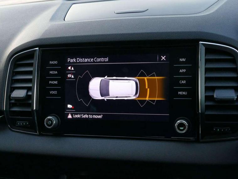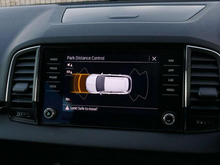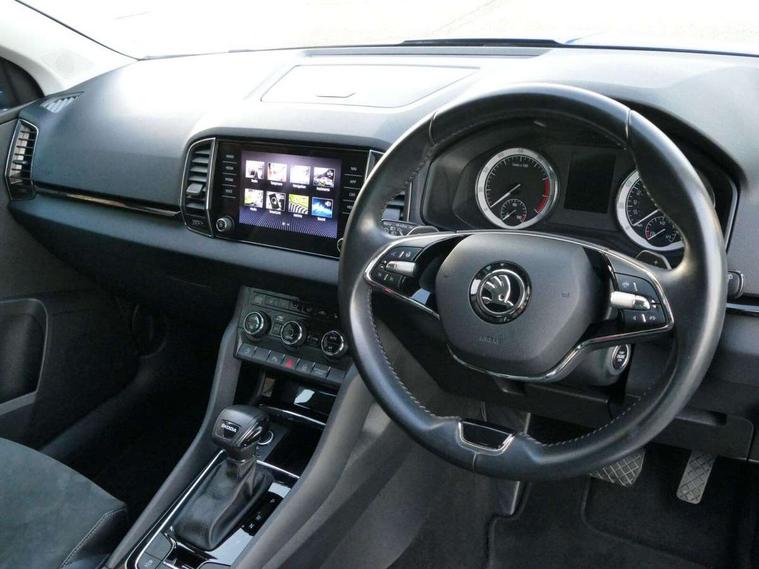 8" Digital display, Care connect, Colour multifunction trip computer, Driver fatigue sensor, Emergency services call system, Outside temperature gauge, Service interval indicator, SmartLink wireless for Apple and wired for Android, Start/stop system with regenerative braking, USB C Port x 2 in front centre console, 8 Speakers, DAB radio with Bluetooth, USB connection, Acoustic glass, Aero front windscreen wipers with intermittent function, Auto dimming rear view mirror with light and rain sensors, Automatic headlight control system, Black electric window control buttons, Body colour door mirrors and handles, Electric front and rear windows with child proof lock, Heated rear windscreen, LED daytime running lights, LED rear lights with high functionality welcome effect and dynamic indicators, Light assistant (coming/leaving home/tunnel light), Plastic scuff plates, Privacy glass, Rear side wing doors, Rear spoiler, Rear window wiper with washer system and intermittent control, Safety reflectors on front doors, 1.5 litre bottle holders in driver and front passenger door panels, 12V socket in boot, 12v socket in front centre armrest with storage compartment and rear air vents, 2 Folding hooks and nets in boot, 2 spoke leather heated multifunction steering wheel with DSG paddles, 2 x Tablet holder, 3 rear height adjustable headrests, 3 seat bench in 2nd row, 4 foldable roof handles with rear coat hooks, Black floor carpet, Chrome inner door handles, Decorative door sills with KAROQ badging, Double sided boot floor, Foldable hooks in the boot, Front head restraints, Height adjustable front three point seats belts with tensioners, Height/reach adjust steering wheel, Ice scraper, Illuminated glovebox, Illuminated luggage compartment, Isofix child seat preparation for front passenger seat, Isofix child seat preparation outer rear, Manual lumbar support for front seats, Pen holder, Pollen filter, Rear boot cover, Rear reading lights, Rubbish bin door, Safety vest holder, Single front passenger seat, Storage box in upper central dashboard closed, Sunvisors with illuminated vanity mirrors, Textile floor mats, Ticket holder, VarioFlex seats with standard rear seat release, Chrome roof rails + chrome pack - Karoq, Parking pack - Karoq, Automatic door unlocking in case of crash, Automatic fuel cut off in case of crash, Child locks on rear doors, Driver airbag, Electronic parking brake with auto hold function, Emergency rear braking signal, ESC including ABS, MSR, ASR, EDS, HBA, DSR, RBS, MKB and traction control, Front side airbags, Hill hold control, Knee airbags, Passenger airbag with switch-off function, Pedestrian monitor, Seatbelt reminder signalisation and pretensioner for all seats, Three point seatbelts rear, Two tone horn, Tyre pressure display, Tyre pressure monitor, Alarm with interior monitoring, back up horn and tilt sensor with safe function, Electronic engine immobiliser, Keyless entry and start/stop, Remote central locking with 2 remote folding keys, Chrome framed air vents, Anti-theft wheel bolts protection, Storage on wheel cover, Tool kit,