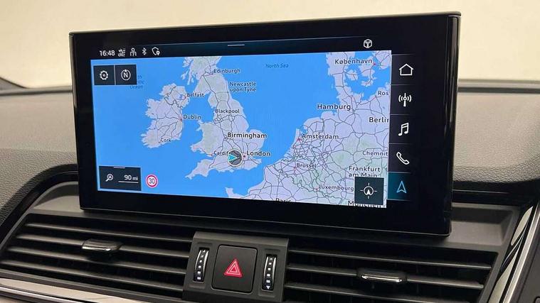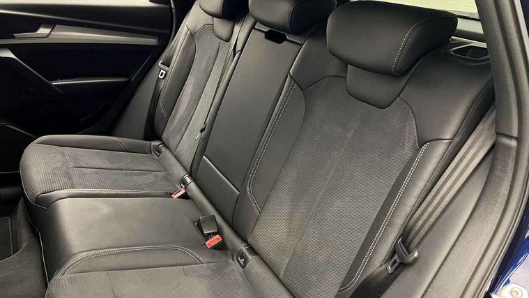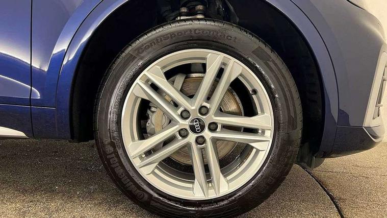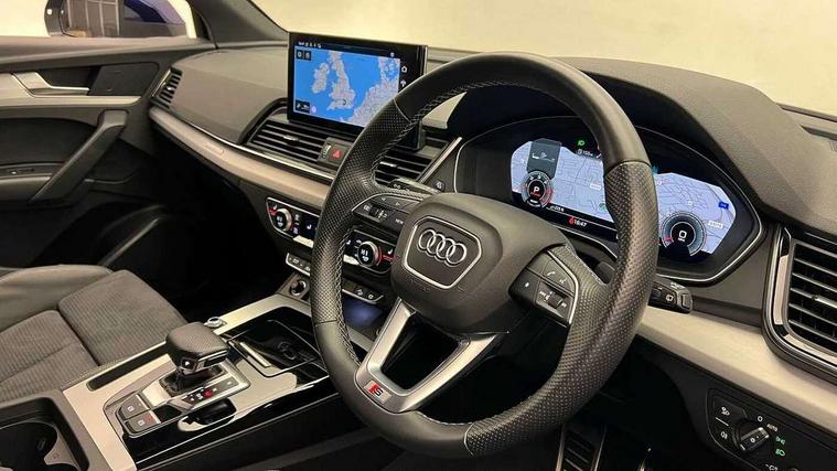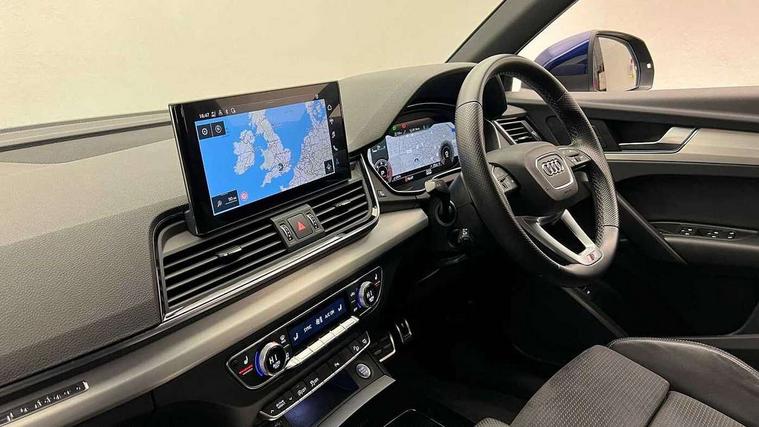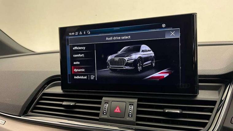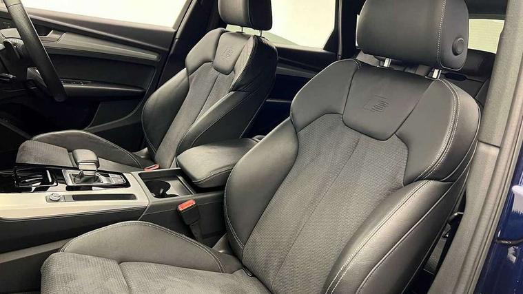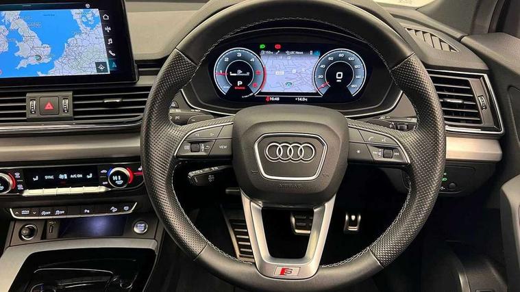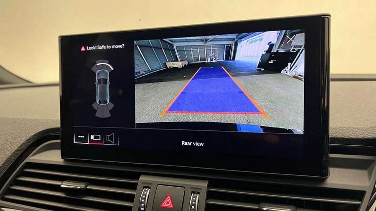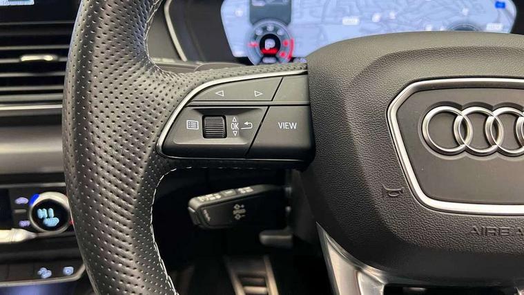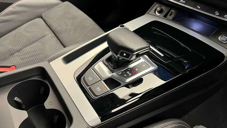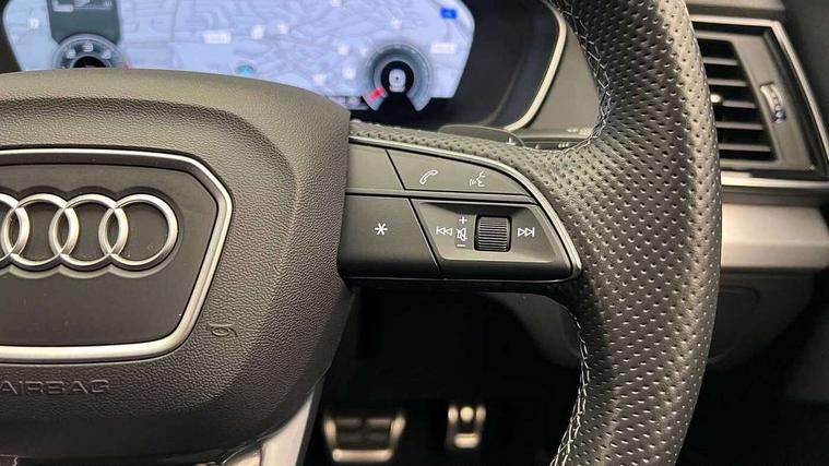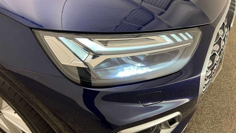 Audi connect safety and service (e-call), Audi connect with Amazon Alexa Integration, Audi drive select, Audi virtual cockpit plus with 12.3" screen and three different layout designs, Audi wireless smartphone interface, Automatic start-stop system with coasting functionality and efficiency programme, Bluetooth interface, Electro - mechanical power assisted steering, MMI navigation plus with 10.1" touch screen, Power tailgate, Reversing camera, Service interval indicator, Voice control system with Audi hotword activation "Hey Audi", Diesel particulate filter, Quattro on demand, S line sports suspension, 2 x USB charging port with aux input socket, DAB Digital radio, Acoustic windscreen, Aluminium roof rails, Audi matrix LED headlights with dynamic front and rear indicators, Auto dimming rear view mirror, Automatic headlights and windscreen wipers, Body colour door mirrors, Body colour rear diffuser with matt aluminium silver surrounds, Body colour underbody protection, Chrome plated exhaust trims, Door sills in Selenite silver, Electric adjustable/heated/folding door mirrors, Front air inlet surrounds in aluminium, Front and rear electric windows, Front radiator grille in honeycomb design, Headlight washers, Lower bumpers painted in contrast Manhattan grey, Rear chrome trim strip below lights, Rear privacy glass and rear side windows, Rear spoiler, Rear wiper, Roof bars, S Line badges on the front wings, S Line front and rear bumpers, S Line side skirts, 3 rear headrests, 40:20:40 split folding rear seat with rear centre armrest, Black cloth headlining, Comfort front centre armrest, Contrast stitching on seats, steering wheel and gear lever gaiter, Deluxe 3 zone electronic climate control, Front head restraints, Front/rear floor mats, Gear lever in black leather, Heated front seats, Height/reach adjustable steering column, Illuminated door sill trims with S logo, ISOFIX child seat mounting and top tether, Manual seat adjustment with 4-way electric lumbar support, Removable luggage compartment floor, Stainless steel pedals, Sunvisors with vanity mirrors, Trunk roller cover, High gloss pack - Q5, LED interior light pack - Q5, 3 point seatbelts on all seats, 6 airbags - Driver, front passenger, curtain and side airbags, Electrically operated child locks on rear doors, Electromechanical parking brake, Electronic stabilisation control including ABS, ASR and EDL, Front passenger airbag deactivation, Hill descent control, Hill hold assist, Multi collision brake assist, Pop-up bonnet for pedestrian protection, Pre sense city, Seat belt force limiter, Seatbelt monitoring, Tyre pressure warning, Warning triangle and first aid kit, Anti theft alarm, Anti-theft wheel bolts, Keyless Go access/ignition system, Matt brushed aluminium inlays,