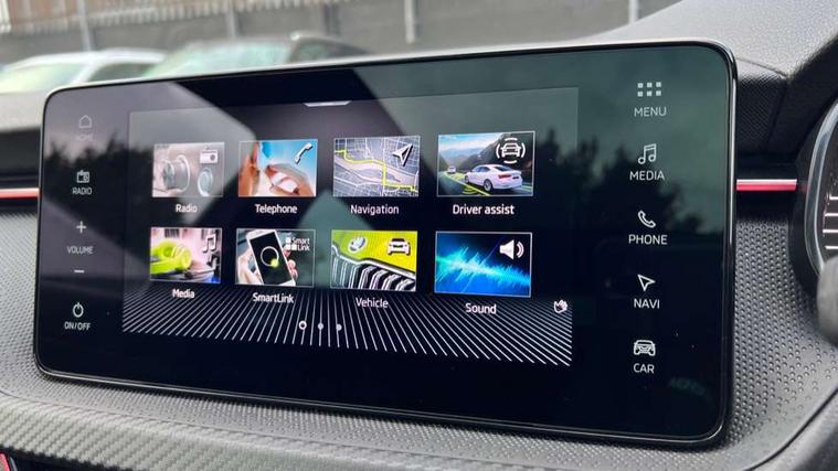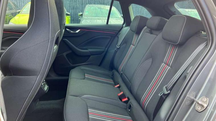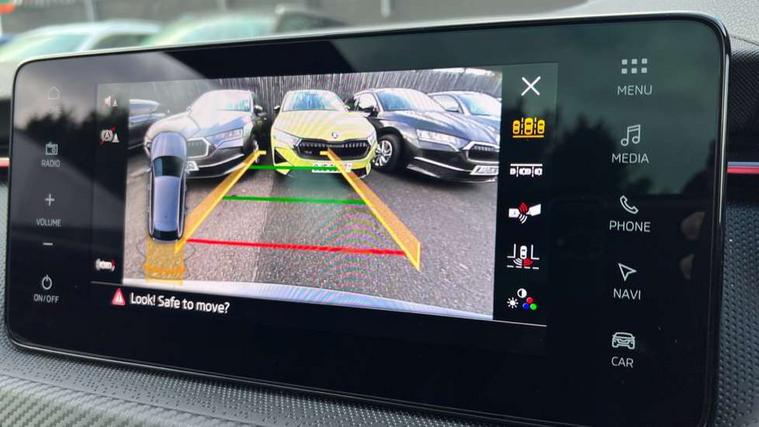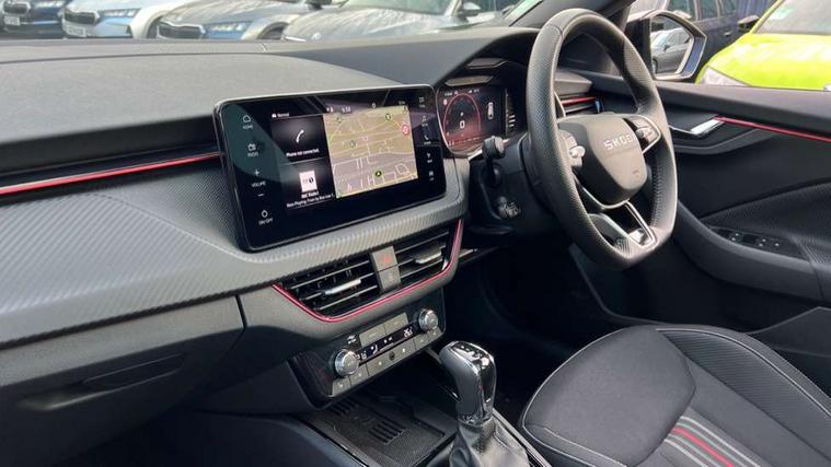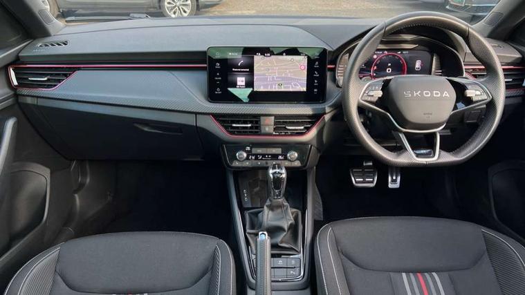 Advanced driver attention and drowsiness monitor, Bluetooth, e-Call (emergency call), Front assist system, PAS, Rear parking sensors, Rear view camera, Speed limiter, Tailgate, Traffic sign recognition, Virtual Cockpit - 10.25" digital display, Voice control system, Wireless smartlink, 4 USB C ports, 8 Speakers, 9.2" Skoda navigation display, DAB radio, Auto dimming rear view mirror, Automatic headlamp activation with Coming home and Leaving home feature, Automatic high/low beam, Automatic intermittent wipers, Black door mirrors, Black lettering on boot lid, Black radiator grille, Black rear diffuser, Black roof spoiler, Body colour bumpers, Body colour door handles, Chrome moulding around grille, Extended tailgate glass, Front and rear electric windows, Heated rear window, LED 3rd brake light, LED brake lights, LED daytime running lights, LED high beam, LED low beam, Light sensors, Monte carlo plaque, Panoramic glass roof, Privacy glass, Rear LED fog light, Rear side wing doors, Rear wiper, Tinted windows, Unique dark chrome design logo on alloy wheels, 12V socket in luggage compartment, 3 seat bench in 2nd row, Aluminium pedals, Ambient lighting in white/red, Black / White armrest stitching, Black ceiling, Black roof headlining, Cargo elements, Chrome inner door handles, Door inserts in art.leather carbon, Driver and passenger sun visors with vanity mirror, Dual zone climate control, Front and rear roof lights, Front centre armrest, Front head restraints, Height adjustable driver seat, Height adjustable passenger seat, Ice scraper, Illuminated glove compartment, Inner circulation control with pollen filter, ISOFIX for front passenger seat, Isofix preparation for back seats, Leather gearknob and handbrake lever, Luggage net under rear parcel shelf, Manual lumbar support for front seats, Monte Carlo cloth upholstery, Net package and top tether hooks in boot space, Pocket on the back of both front seats, incl. mobile phone pockets, Rear centre armrest, Red hotstamping, Single front passenger seat, Skoda lettering on steering wheel, Sport seats, Textile floor mats, Third rear headrest, Ticket holder, Top tether for front passenger seat, Umbrella in driver's door, Light and view plus pack - Scala, 3x3 point rear seatbelts, ABS, Child locks, Curtain airbags and front side airbags, Disc brakes, Driver and front passenger airbags, ESP, Hill hold control, Manual leather parking brake, One tone horn, Passenger airbag switch off function, Seatbelt reminder for driver and front passenger, Tyre pressure monitoring system, Anti theft alarm system with interior monitoring, backup horn and towing protection, Anti-theft wheel bolts, Remote central locking with 2 remote folding keys, SAFE function for remote central locking, Carbon effect decorative inserts, 18" Ursa black diamond cut alloy wheels,