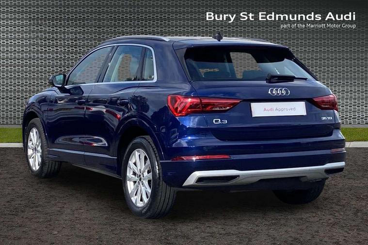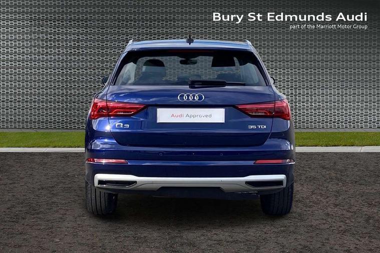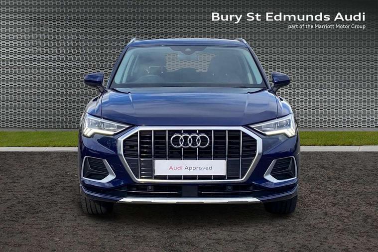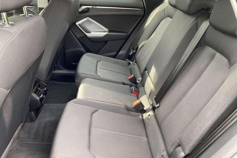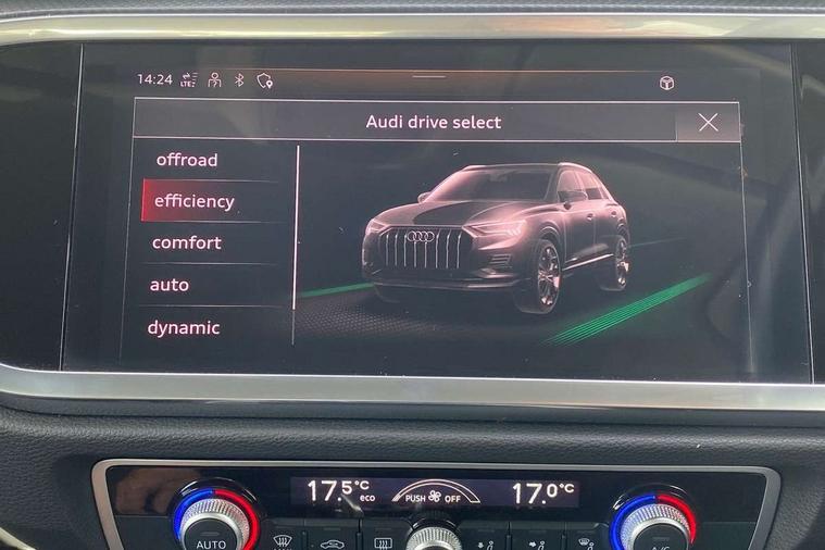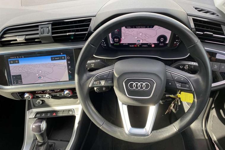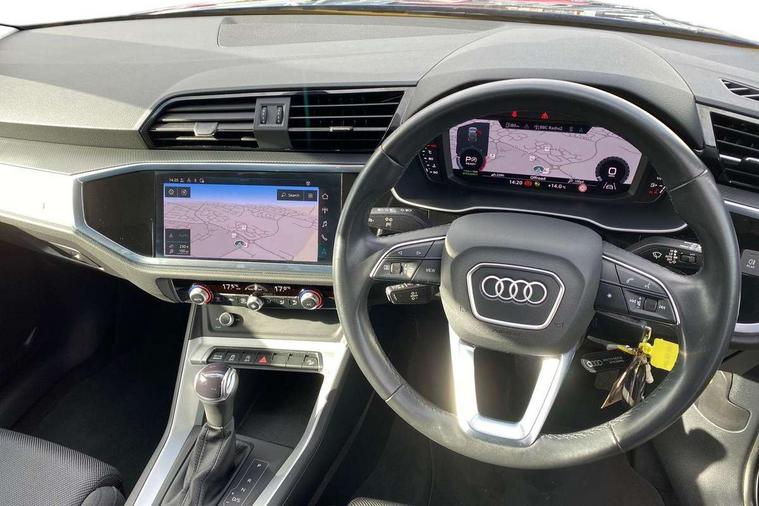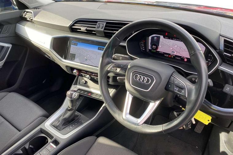 Amazon alexa Integration, Audi connect safety and service (e-call), Audi drive select, Audi lane departure warning, Audi Virtual Cockpit - 10.25" display, Bluetooth interface, Camera based traffic sign recognition, MMI Navigation Plus with high resolution 10.1 inch touchscreen colour display, Power operated tailgate, Progressive steering, Service interval indicator, Smartphone interface includes wireless Apple carplay/Android Auto, Start stop system with recuperation, Voice control system with natural language interaction, Diesel particulate filter, Standard suspension, 2 USB-C ports with charge and data functions, 6 passive loudspeakers, DAB digital radio module, Acoustic windscreen, Aluminium roof rails, Aluminium window trim, Auto dimming frameless rear view mirror, Body coloured bumpers, Electrically folding, adjustable and heated door mirrors with integrated LED side indicators and kerb view function for passenger side, Front and rear electric windows, Front fog lights, Front side air inlets in matt selenite silver, Front spoiler in matt selenite silver, Grille vertical bars in aluminium silver/Matt, High gloss black finish B and C pillars, LED headlights with LED daytime running lights, LED rear lights, LED third brake light, Rain and light sensors, Rear diffuser strip in matt selenite silver, Rear side wing doors, Rear wiper, Silver chrome grille surround, Titanium black radiator grille, Variable front intermittent wipers, 12V socket in rear centre console, 3 seat bench in 2nd row, 3 spoke multi-function leather steering wheel, 40:20:40 folding with manual adjustment for 60:40 forwards/backwards position and backrest angle, Door sill trims with aluminium inlay, Dual zone electronic climate control, Front and rear floor mats, Front and rear headrests, Front and rear roof module including reading lights, Front centre armrest, Glove compartment lighting, Height and reach adjustable steering wheel, ISOFIX child seat mounting for front passenger with airbag deactivation and outer rear seat including top tether attachment point for outer rear seats, Luggage compartment light, Lunar silver cloth headlining, Manual front seats with height adjustment, Single front passenger seat, Stainless steel luggage compartment sill finisher, Non smoking pack - Q3, 3x3 point rear seatbelts, 6 airbags - Driver, front passenger, curtain and side windows, Audi pre-sense front with pedestrain and cyclist recognition, Electromechanical parking brake, Electronic stabilisation control including ABS, ASR and EDL, Front seatbelt reminder, Hill descent control, Hill hold assist, Manual child lock in rear doors, Pre sense basic, Seatbelt monitoring, Tyre pressure warning, Warning triangle and first aid kit, Anti theft alarm, Anti theft wheel bolts, Immobiliser, Remote central locking, Detail dashboard around MMI touch colour display in glass look, black with surround in aluminium look, Micrometallic silver inlay,