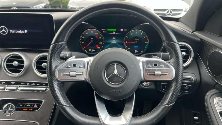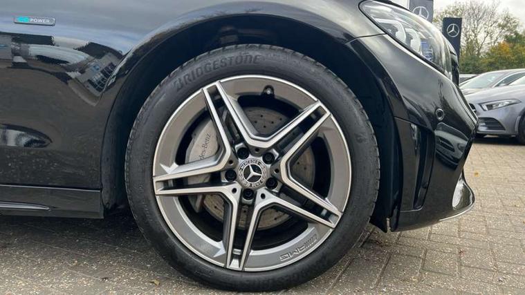 12.3" digital instrument cluster display, Active park assist with parktronic system, Analogue clock, Attention assist, Collision prevention assist plus, Colour display - 10.25" colour display screen, Cruise control with speedtronic variable speed limiter, DYNAMIC SELECT with a choice of driving modes (ECO, Comfort, Sport, Sport+ and Individual), Mercedes connect me, Multi function trip computer, Outside temperature gauge, Remote boot release, Reversing camera, SD card based satellite navigation system, Service indicator (ASSYST), Sports direct steer speed sensitive steering, Status display for rear seat belts in instrument cluster, 1 x type 2 and 3 phase 8m straight wallbox cable, 66 litre fuel tank, 8m charging cable for household socket, 9G TRONIC 9 speed automatic transmission, Agility control sports suspension lowered by 15 mm, Diesel particulate filter, 2 USB ports and one SD card slot centre console, Audio 20 with integrated media interface and bluetooth handsfree function, DAB Digital radio, Frontbass loudspeakers, Steering wheel mounted audio controls, Adaptive brake lights, AMG body styling front apron, rear apron and side skirts, Automatically dimming rear view mirror and driver's exterior mirror, Body coloured bumpers, Body coloured door mirrors, Chrome pins diamond radiator grille with integrated stars, Electric windows with one touch opening/closing and obstruction sensors, Electrically adjustable and heated door mirrors, EQ badging, Green tinted glass, Heated windscreen washers, LED Indicators, LED tail lights, LED third brake light, Multi beam LED headlights, Privacy glass (rear side windows and rear screen), Radio aerial integrated into rear window, Rain sensor windscreen wipers, Side windows surround in polished aluminium, Twin tailpipe design integrated into rear bumper, 2 cupholders in front centre console, 3 spoke flat bottom AMG steering wheel in nappa leather with chrome inserts perforated leather grip, 40:20:40 split folding rear seats, AMG sports seats, Auto Mercedes-Benz child seat recognition sensor, Black floor mats with AMG lettering, Dual zone automatic climate control, Front and rear head restraints, Front centre armrest with storage compartment, Front door sills with Mercedes Benz lettering, Gearshift paddles on steering wheel, Heated front seats, Height/reach adjustable steering column, Illuminated glovebox, Leather upholstery, Multifunction steering wheel, Rear top tether child seat ISOFIX attachment, Sports pedals with stainless steel surfaces and rubber studs, Sunvisors with illuminated vanity mirrors, Lighting pack - C class, Mirror pack - C Class, Seat comfort pack - C Class, Stowage space pack - C Class, 3 rear 3 point seatbelts, Active bonnet, Adaptive brake system with HOLD function and brake drying in the wet, Anti-lock braking system (ABS), Black seat belts, Brake calipers with Mercedes-Benz lettering + perforated front brake discs, Child proof door locks, Drivers knee airbag, Drivers pelvis airbag, Dual stage driver/passenger airbags, Electronic parking brake, ESP with ASR, Front passenger seat occupancy sensor, Front side airbags, Hill start assist, Rear seatbelt warning indicator, Sports braking system, Tyre pressure monitoring system, Warning triangle and first aid kit, Window airbags, Alarm system/interior protection/immobiliser, Central locking with interior switch, automatic locking and crash sensor with emergency opening function, Chrome surround in electric key, Urban guard, Grey oak open pore trim, 18" AMG 5 twin spoke aero alloy wheels in tremolite grey, TIREFIT with tyre inflation compressor,