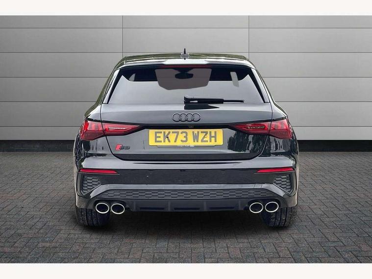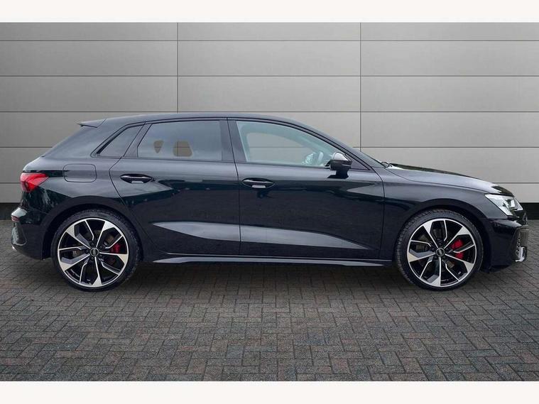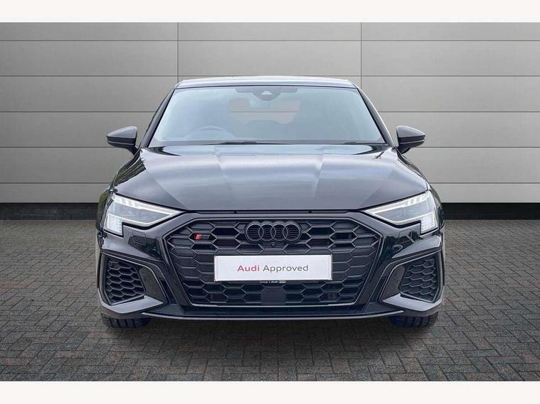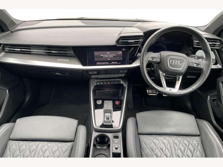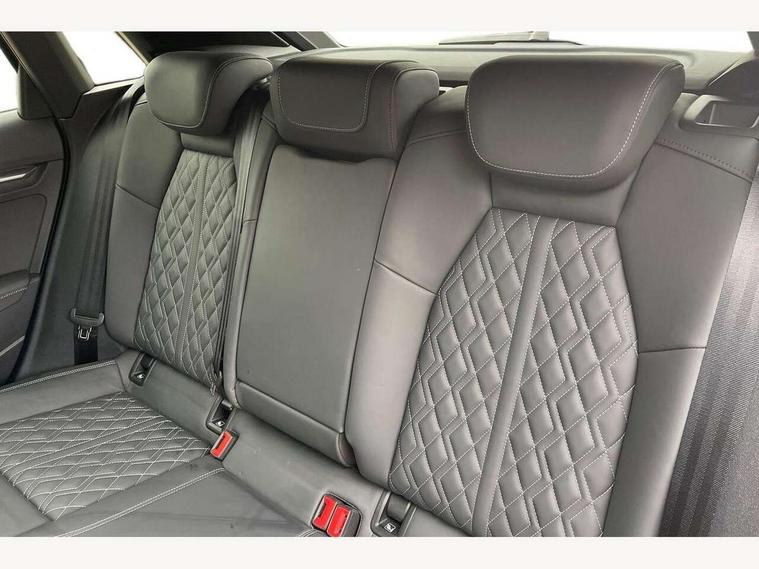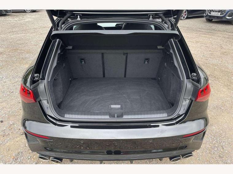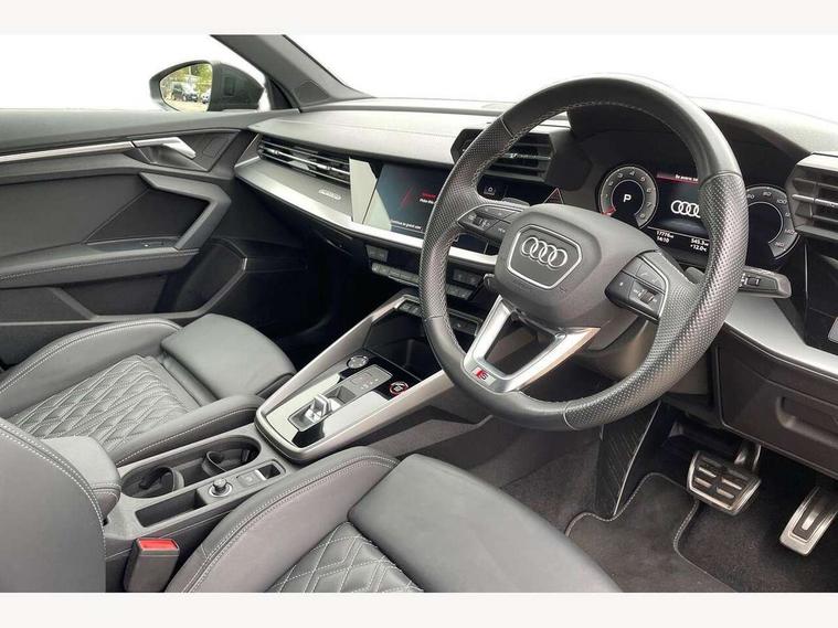 Adaptive cruise assist, Audi drive select (Auto, Comfort, Dynamic, Efficiency and Individual), Audi smartphone interface, Audi virtual cockpit plus - 12.3" full HD resolution dynamic digital instrument cluster, Automatic start/stop system with recuperation, Bluetooth interface, Collision avoidance assistant, e-Call (emergency call), Head up Display, Lane change assistant with exit warning system and rear cross traffic alert, Lane departure warning system, MMI Navigation Plus with high resolution 10.1" colour touch screen display, Power operated tailgate - Luggage compartment lid opens/closes electrically, Progressive steering, Service indicator, Trip computer, Voice control system with natural language interaction, Quattro permanent all wheel drive, S suspension with damper control, 2xUSB-C connection with data and charging functions, DAB Digital radio, 3rd brake light, Acoustic glass windscreen, Audi Beam uses LEDs to project Vorsprung onto the ground as you exit your S3, Auto dimming frameless rear view mirror, Carbon door mirror housings, Dual branch oval twin tailpipes in chrome plated finish, Electrically adj heated/folding + automatically dimming exterior mirrors with memory + automatic kerb side function for passenger side exterior mirror, Front electric windows, Headlight washers, Heat insulating glass windscreen, Illuminated door sills with aluminium inserts at the front with S logo, Integrated LED indicators in door mirrors, LED daytime running lights, Light and rain sensors, Privacy glass - dark tinted rear window, rear door and side windows, Rear electric windows, Rear side air outlets in grained matt black, Rear side wing doors, Rear wiper, 12V socket and storage compartment in front centre console, 3 seat bench in 2nd row, 3 spoke leather multifunction steering wheel with gear shift paddles, 4 way electrically adjustable lumbar support for driver and front passenger, 60/40 split folding rear seat bench, Black cloth headlining, Dual zone electronic climate control, Fine Nappa leather upholstery with front sports seats S embossed logo, Front and rear centre armrest in artificial leather, Front and rear headrests, Front/rear floor mats, Height and reach adjustable steering wheel, Interior lighting - glove compartment light and right hand side, Luggage compartment floor covering, Seat side bolsters, Single front passenger seat, Stainless steel pedals and front footrest in black, Aluminium interior elements pack - A3 Sportback, Black styling pack - A3 Sportback/S3, Body styling design pack - S3, Extended ambient lighting pack - A3 Sportback, Storage pack - A3 Sportback, Technology pack pro with 360 camera - A3 Sportback/Voursprung, 3x3 point rear seat belts, Driver and front passenger airbag with passenger airbag deactivation, Electronic Stabilisation Control (ESC) including ABS, ASR and EDL, First aid kit with warning triangle and 2 safety vests, Front side airbags with head airbags and interaction airbag, Pre-sense front with pedestrian and cyclist detection, Seatbelt monitoring, Tyre pressure loss indicator, Anti theft alarm, Anti-theft wheel bolts, Electronically operated child locks, Immobiliser, Remote control central locking, Carbon inlays, accent surfaces in the dashboard and centre console in platinum grey silk effect paint finish,