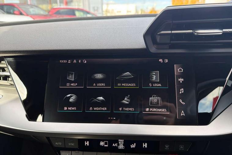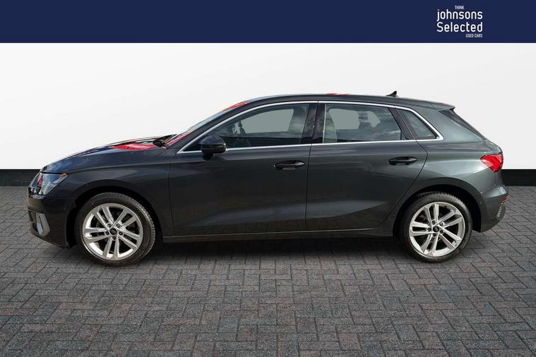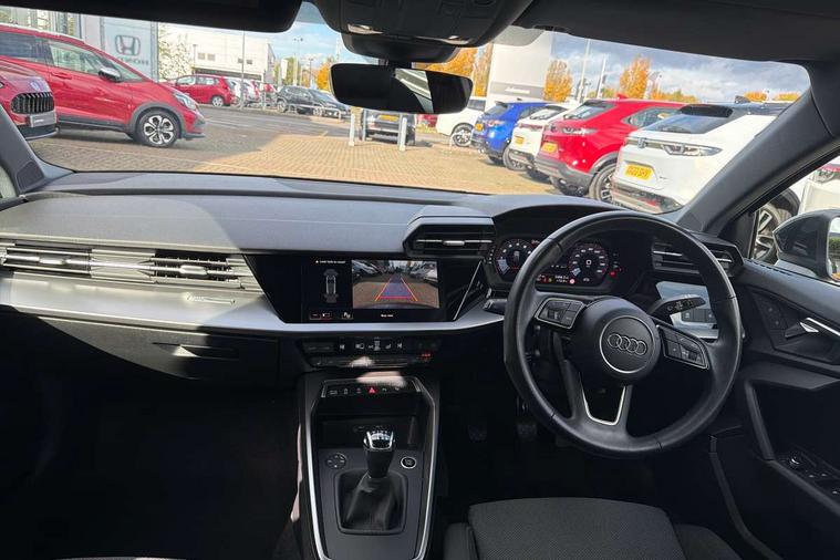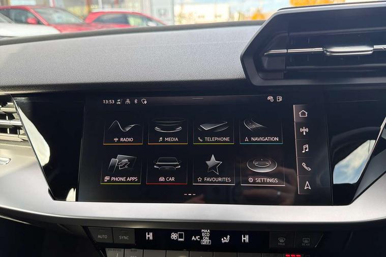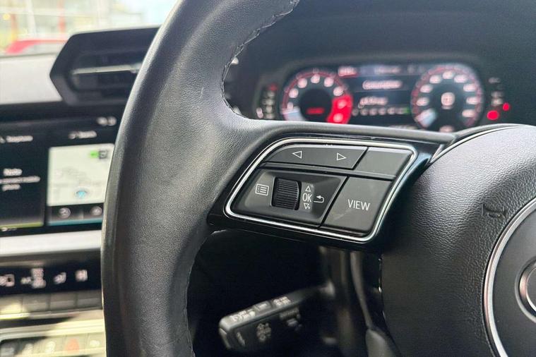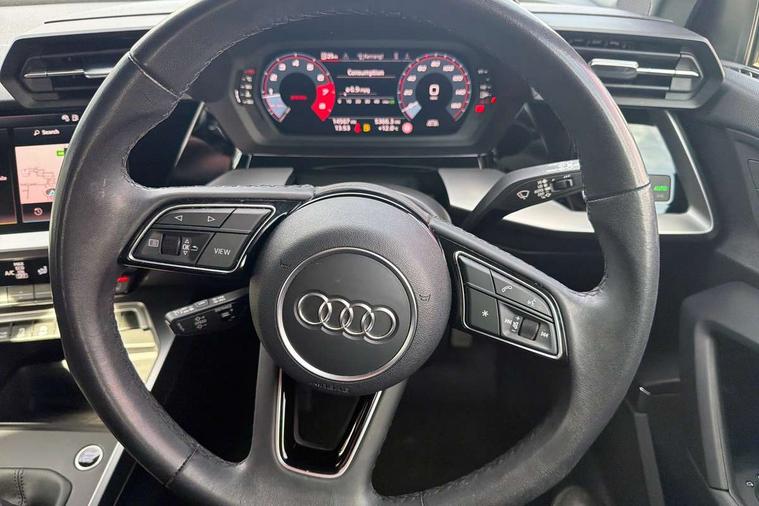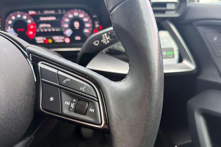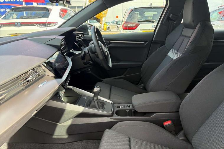 Audi drive select (Auto, Comfort, Dynamic, Efficiency and Individual), Audi smartphone interface, Audi Virtual Cockpit - 10.25" digital and colour instrument cluster, Automatic start/stop system with recuperation, Bluetooth interface, Camera based traffic sign recognition, Collision avoidance assistant, Cruise control, e-Call (emergency call), Electromechanical power speed sensitive steering, Lane departure warning system, MMI Navigation Plus with high resolution 10.1" colour touch screen display, Rear parking sensors, Service indicator, Trip computer, Voice control system with natural language interaction, Standard suspension, 2xUSB-C connection with data and charging functions, 6 passive loudspeakers, DAB Digital radio, 3rd brake light, Acoustic glass windscreen, Aluminium window trim, Auto dimming frameless rear view mirror, Body colour exterior mirrors, Body colour roof spoiler, Electrically adjustable/heated/folding/auto dimming door mirrors with integrated LED indications + kerb view function for passenger side, Front electric windows, LED daytime running lights, LED headlights and halogen rear lights, Light and rain sensors, Rear electric windows, Rear side wing doors, Rear window, rear door windows and rear side windows in clear glass, Rear wiper, 12V socket and storage compartment in front centre console, 3 seat bench in 2nd row, 3 spoke leather multifunction steering wheel, 4 way electrically adjustable lumbar support for driver and front passenger, 60/40 split folding rear seat bench, Dual zone electronic climate control, Front and rear headrests, Front centre armrest, Front door sill trims with aluminium inlay, Front/rear floor mats, Height and reach adjustable steering wheel, Interior lighting - Front and rear roof module including reading lights, glove compartment light and right hand side, Interior lighting - glove compartment light and right hand side, Luggage compartment floor covering, Manual boot compartment lid, Manually adjustable front seats, Routine cloth upholstery with front sports seats, Seat side bolsters, Single front passenger seat, Steel grey cloth headlining, Aluminium interior elements pack - A3 Sportback, LED interior lighting pack - A3 Sportback, Sport styling pack - A3 Sportback, 3x3 point rear seat belts, Driver and front passenger airbag with passenger airbag deactivation, Electronic Stabilisation Control (ESC) including ABS, ASR and EDL, First aid kit with warning triangle and 2 safety vests, Front side airbags with head airbags and interaction airbag, Pre-sense front with pedestrian and cyclist detection, Seatbelt monitoring, Tyre pressure loss indicator, Anti theft alarm, Anti-theft wheel bolts, Electronically operated child locks, Immobiliser, Remote control central locking, Inlays with silk effect paint in platinum grey,