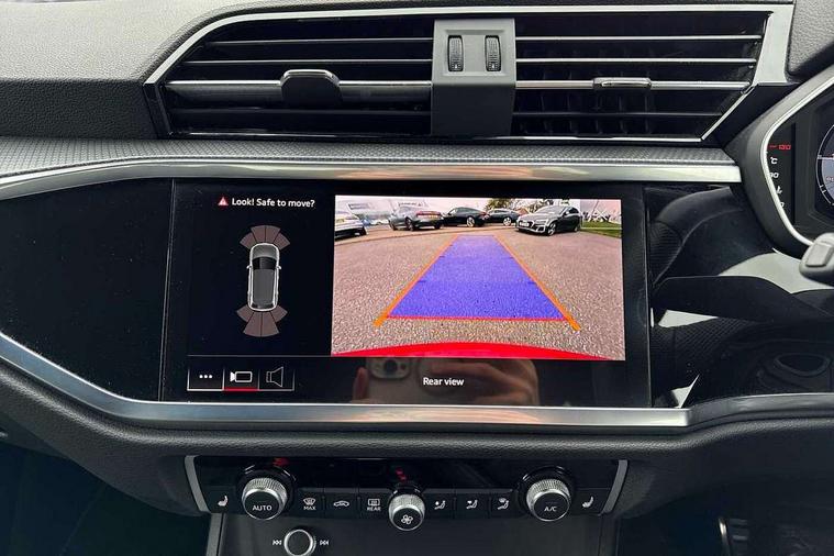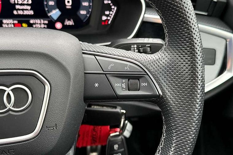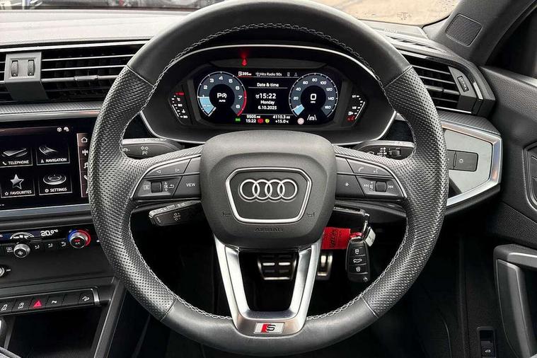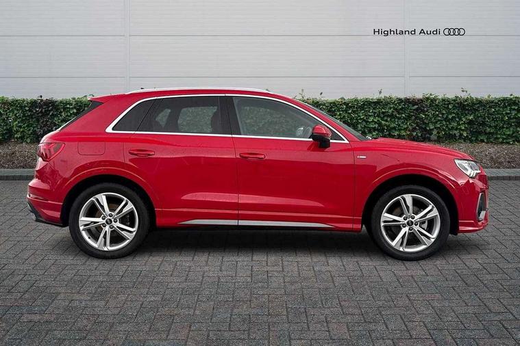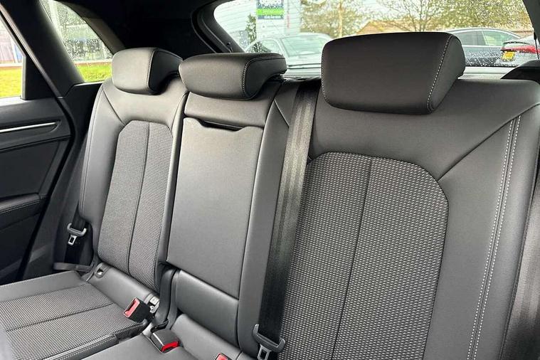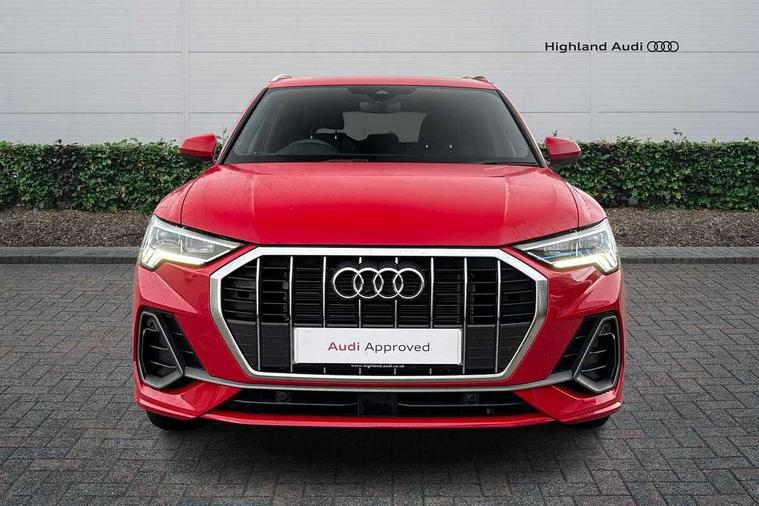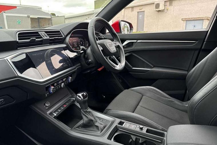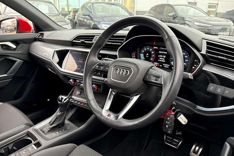 Amazon alexa Integration, Audi drive select, Audi lane departure warning, Audi Virtual Cockpit - 10.25" display, Bluetooth interface, Camera based traffic sign recognition, Legal emergency call, MMI Navigation Plus with high resolution 10.1 inch touchscreen colour display, Power operated tailgate, Progressive steering, Service interval indicator, Smartphone interface includes wireless Apple carplay/Android Auto, Start stop system with recuperation, Voice control system with natural language interaction, Sports suspension, 2 USB-C ports with charge and data functions, 6 passive loudspeakers, DAB digital radio module, Acoustic windscreen, Aluminium roof rails, Aluminium window trim, Auto dimming frameless rear view mirror, Body colour front spoiler blade, Body coloured bumpers, Electrically folding, adjustable and heated door mirrors with integrated LED side indicators and kerb view function for passenger side, Front and rear electric windows, Front fog lights, Front side air inlets in matt platinum grey, Grille vertical bars in aluminium silver/Matt, High gloss black finish B and C pillars, LED Dynamic rear indicators, LED headlights with LED daytime running lights, LED rear lights, LED third brake light, Privacy glass dark tinted rear and rear-side windows (from B-pillar backwards), Rain and light sensors, Rear diffuser grille in grained matt black, Rear diffuser strip in matt titanium black, Rear side wing doors, Rear wiper, S line badges on front wings, S Line front and rear bumpers, Side skirt insert in matt Platinium grey, Titanium black radiator grille, Variable front intermittent wipers, 12V socket in rear centre console, 3 seat bench in 2nd row, 40:20:40 folding with manual adjustment for 60:40 forwards/backwards position and backrest angle, Adjustable rear seat bench/backrest with centre armrest and cupholder, Black cloth headlining, Dual zone electronic climate control, Front and rear black floor mats with contrast stitching in rock grey, Front and rear headrests, Front and rear roof module including reading lights, Front centre armrest, Glove compartment lighting, Height and reach adjustable steering wheel, Illuminated door sill trims with S logo, ISOFIX child seat mounting for front passenger with airbag deactivation and outer rear seat including top tether attachment point for outer rear seats, Luggage compartment light, Manual front seats with height adjustment, Perforated leather gearknob, Single front passenger seat, Stainless steel luggage compartment sill finisher, Stainless steel pedals, Ambient lighting pack - Q3, Non smoking pack - Q3, 3x3 point rear seatbelts, 6 airbags - Driver, front passenger, curtain and side windows, Audi pre-sense front with pedestrain and cyclist recognition, Electrically operated child locks on rear doors, Electromechanical parking brake, Electronic stabilisation control including ABS, ASR and EDL, Front seatbelt reminder, Hill descent control, Hill hold assist, Pre sense basic, Seatbelt monitoring, Tyre pressure warning, Warning triangle and first aid kit, Anti theft alarm, Anti theft wheel bolts, Immobiliser, Remote central locking, Dark matt brushed aluminium inlay, Detail dashboard around MMI touch colour display in glass look, black with surround in aluminium look, Leatherette door armrest,