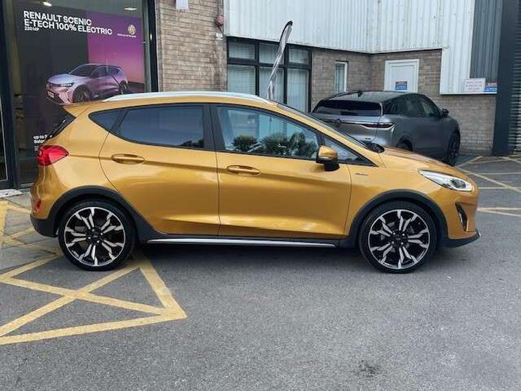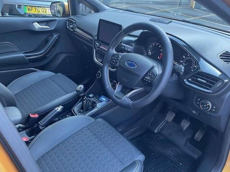 4.2" TFT instrument cluster screen, Bluetooth system, Electric power steering, Extra selectable drive modes ( Trail, Slippery), Ford easy fuel, Rear parking distance sensors, Selectable drive modes (Normal, Sport, Track), Traffic sign recognition, Trip computer, Rough road suspension with increased ride height adjust, 2 USB ports, Auxiliary input socket, B&O Premium audio system with 8" touchscreen, 10 speakers, 360 degree sound system, Ford SYNC 3 navigation system and Ford pass connect, DAB Digital radio, Steering wheel mounted controls, Auto high beam, Body colour bumpers, Body colour door handles, Body colour rear spoiler, Chrome beltline trim, Cornering front fog lights, Electric front windows/one touch facility, Electric rear windows, LED Night signature to rear lights, Mesh design front grille with chrome surround, Power foldable door mirrors with puddle lights, Quickclear heated windscreen, Rain sensing wipers and auto dimming rear view mirror, Rear privacy glass, Rear wiper, Rugged body styling kit with active front wing badges, 3 spoke leather trimmed steering wheel with audio control, 60/40 split folding rear seat, Adjustable head restraints, Boot carpet, Centre console with opening armrest, 2x cupholders, 12v and USB, Chrome inner door handles, Drivers and Passenger lumbar support, EATC - Electronic Auto Temperature control, Footwell illumination, Front floor mats in velour, Front map reading lights, Front seat and rear pockets, Height adjustable passenger seat, Illuminated glovebox, Leather gaiter, LED ambient lighting, Load area light, Manual 4-way driver seat adjust, Overhead console with sunglasses holder, Pollen filter, Rake/reach adjustable steering wheel, Sensico partial premium upholstery, Sensico wrapped steering wheel, NCAP Pack - Fiesta, 3 point seatbelts on all rear seats, ABS+EBA, Curtain airbags, Driver and passenger airbags, Drivers knee airbag, Electronic stability control with hill start assist, Front passenger airbag deactivation, Front side airbags, Seatbelt warning, Two tone horn, Tyre pressure monitoring system, Ford keyfree system with Keyless entry and keyless start, MyKey system, Remote central locking & engine immobiliser, Thatcham Cat.1 alarm, 18" 5 spoke alloy wheels with shadow black machined finish,