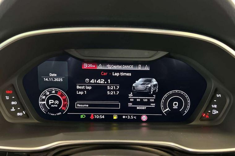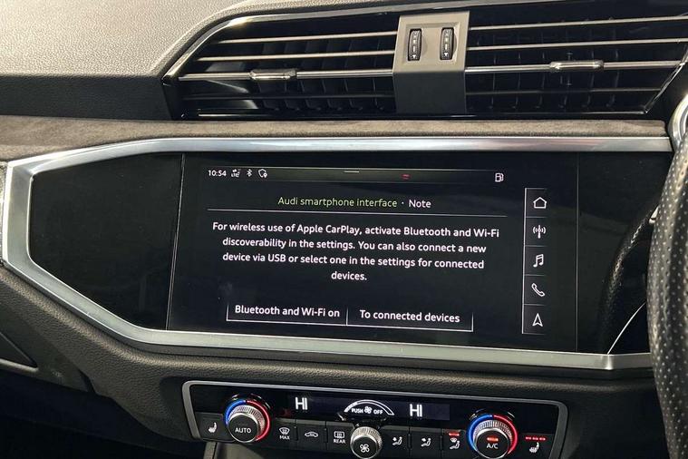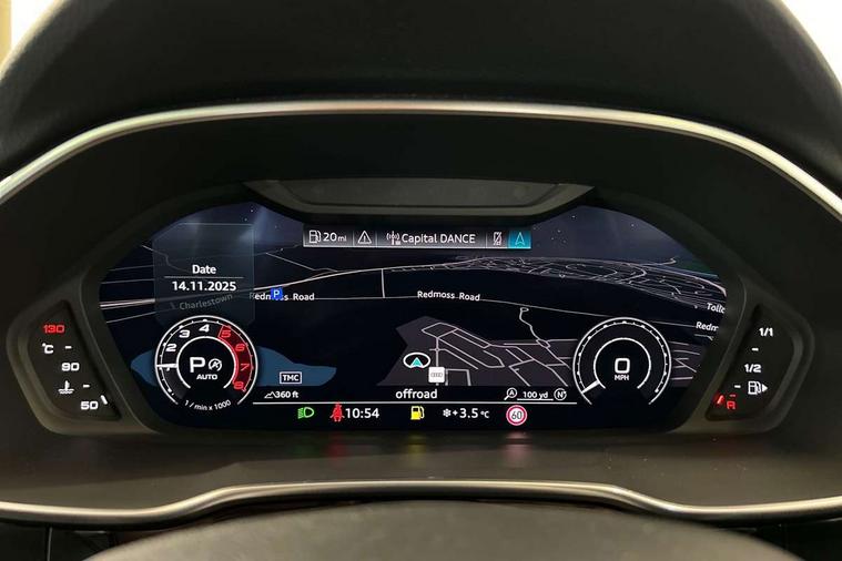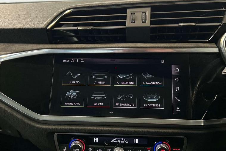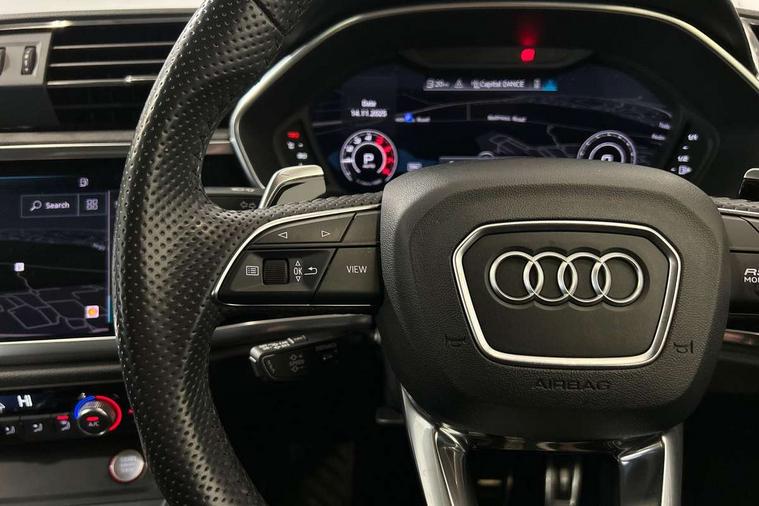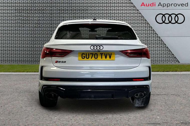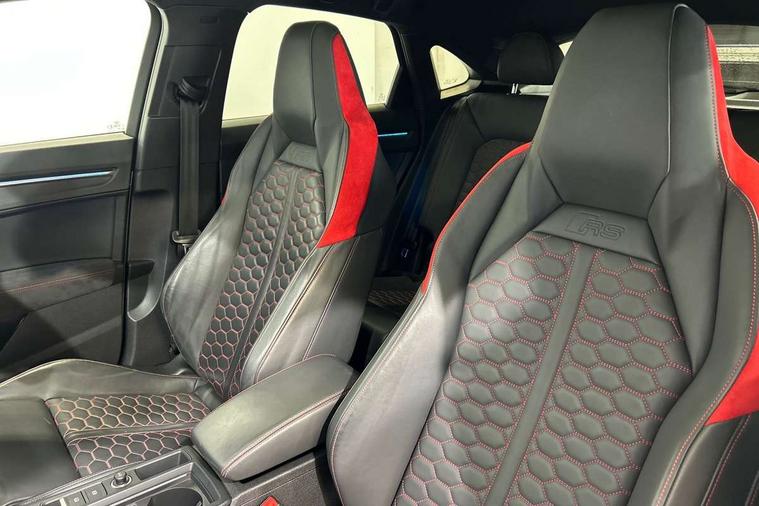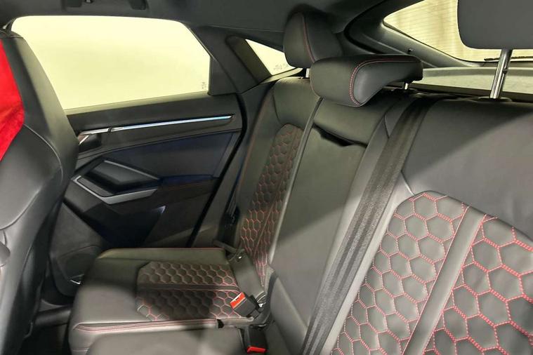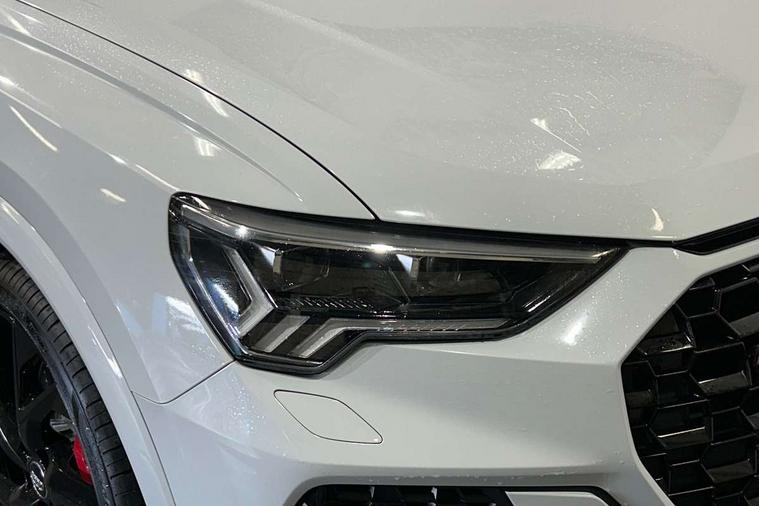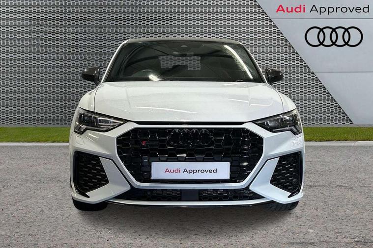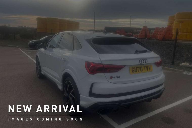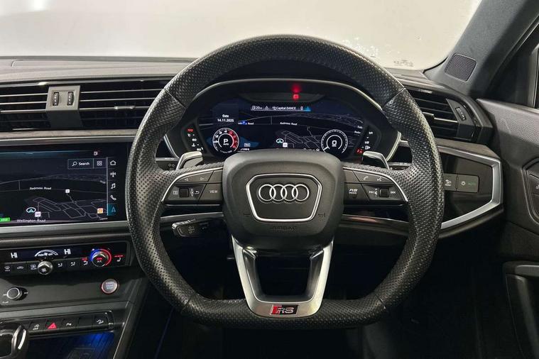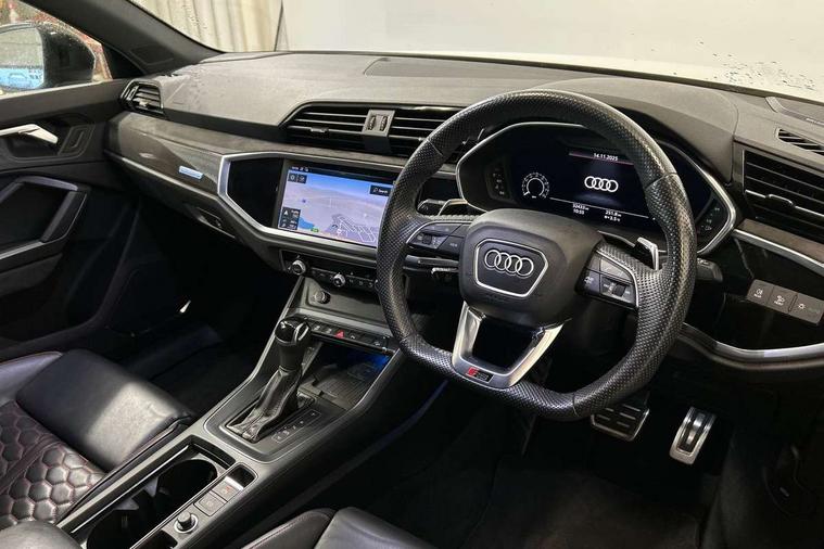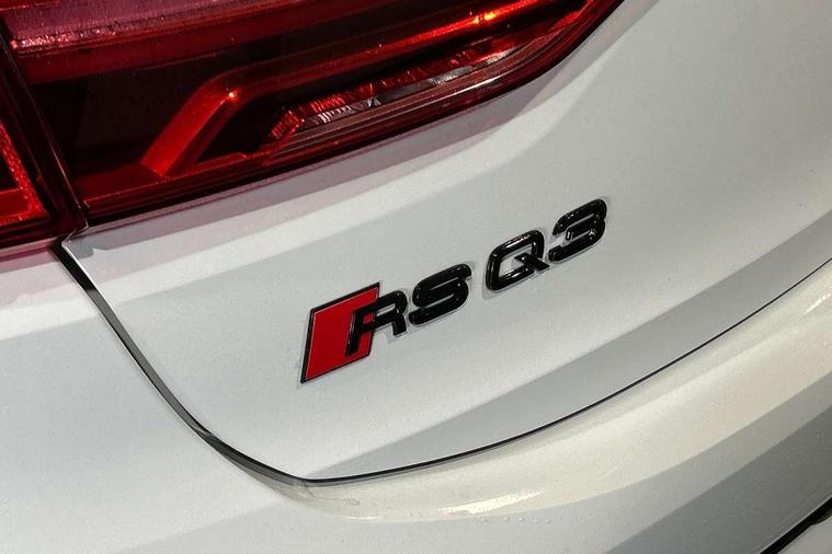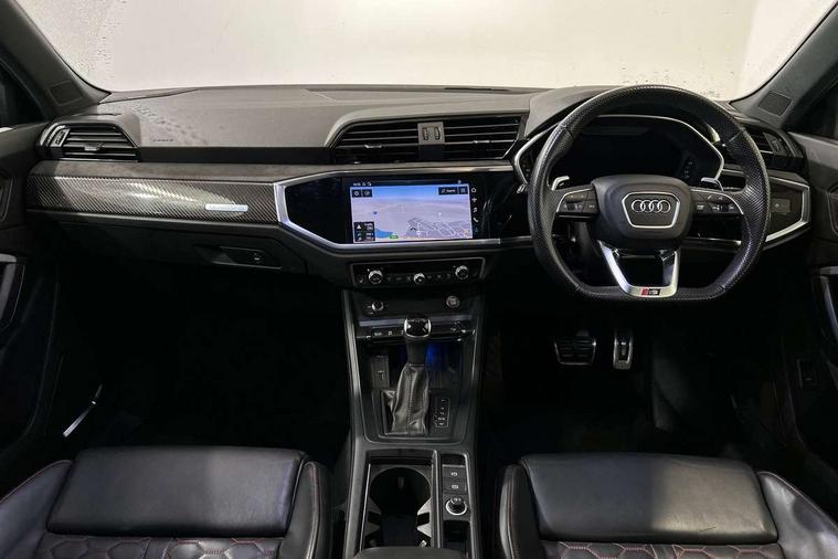 360 degree parking camera, Audi connect safety and service (e-call), Audi drive select with new RS modes, Audi lane departure warning, Audi parking system plus with front and rear sensors, Audi phone box with wireless charging, Audi side assist, Audi smartphone interface includes wireless Apple carplay/Android Auto, Audi virtual cockpit plus - 12.3 inch display, Bluetooth interface, Camera based traffic sign recognition, MMI Navigation Plus with high resolution 10.1 inch touchscreen colour display, Power operated tailgate, Progressive steering, Rear cross traffic alert, Start stop system with recuperation, Voice control system with natural language interaction, Quattro all wheel drive, RS sports suspension plus, 1 x USB type C and 1 USB type A charging points, Bang + Olufsen 3D sound system, DAB digital radio module, Acoustic windscreen, Audi Beam uses LEDs to project the Audi Sport logo, Auto dimming door mirrors, Auto dimming frameless rear view mirror, Body colour rear spoiler with lip in gloss black, Carbon door mirror housings, Dark tinted Matrix LED headlights with dynamic front and rear indicators, Electrically folding, adjustable and heated door mirrors with integrated LED side indicators and kerb view function for passenger side, Flared wheel arches, Flat slits on single frame grille, Headlight washers, High gloss black finish B and C pillars, Honeycomb radiator grille in gloss black, Illuminated door sill trims with RS logo, LED rear lights, Panoramic glass sunroof, Privacy glass dark tinted rear and rear-side windows (from B-pillar backwards), Rain and light sensors, RS specific bumpers with large front air inlets in black, RS Sport exhaust system, dual branch with exhaust flap control and gloss black oval tailpipe trims, 3 zone electronic climate control, 4 way electric lumbar support for driver and front passenger, Adjustable rear seat bench/backrest with centre armrest and cupholder, Black Alcantara elements - dashboard and the armrests in the front and rear doors, Black cloth headlining, Electrically adjustable front seats, Fine Nappa leather upholstery with front sports seats + honeycomb stitching and RS embossed logo, Flat bottom multifunction leather steering wheel with shift paddles in gloss black with aluminium trim + mode button, contrast stitching and RS emblem, Front and rear floor mats, Front and rear head restraints, Front centre armrest, Heated front seats, ISOFIX child seat mounting for front passenger with airbag deactivation and outer rear seat including top tether attachment point for outer rear seats, Stainless steel luggage compartment sill finisher, Stainless steel pedals, Tool kit, Black styling pack - RS Q3, Driver assistance pack - RS Q3, Multi-coloured extended ambient lighting pack - RS Q3, Non smoking pack - RS Q3, 3x3 point rear seatbelts, 6 airbags - Driver, front passenger, curtain and side windows, Audi pre-sense front with pedestrain and cyclist recognition, Electrically operated child locks on rear doors, Electromechanical parking brake, Electronic stabilisation control including ABS, ASR and EDL, Hill descent control, Hill hold assist, Pre sense basic, RS brake system, Seatbelt monitoring, Tyre pressure warning, Warning triangle and first aid kit, Advanced key, Anti theft alarm, Anti theft wheel bolts, Aluminium look interior elements, Carbon twill inlays, Detail dashboard around MMI touch colour display in glass look, black with surround in aluminium look, Tyre repair kit,