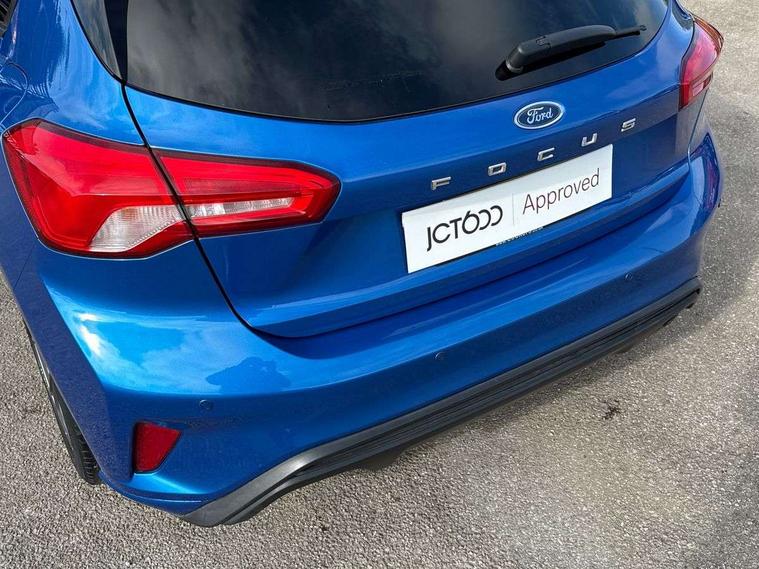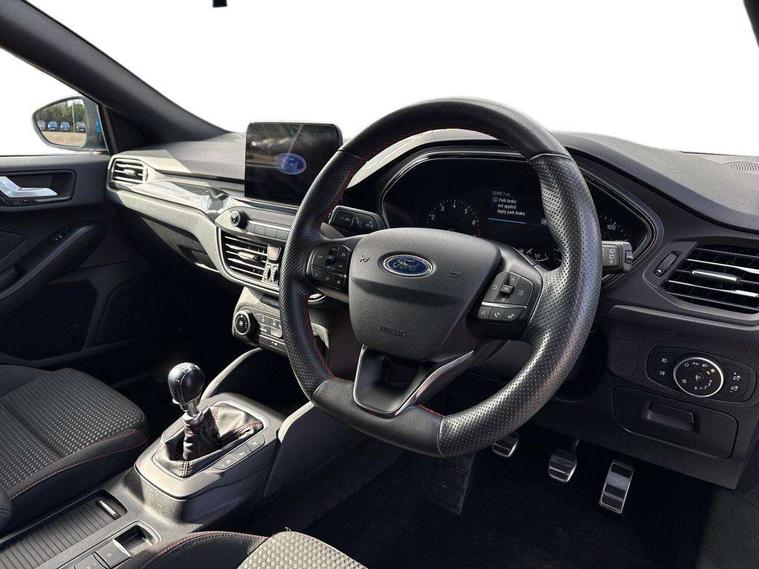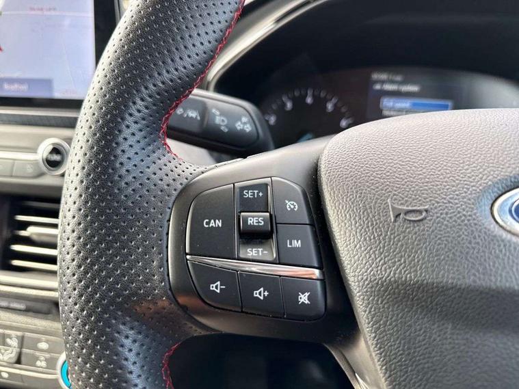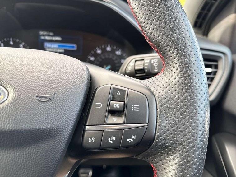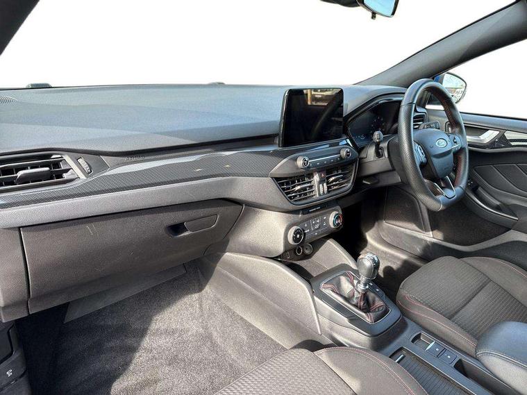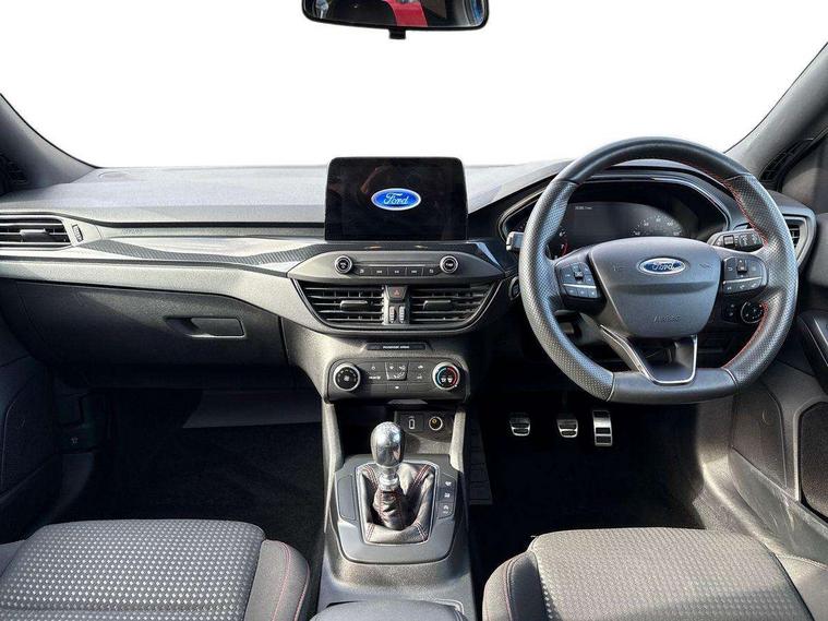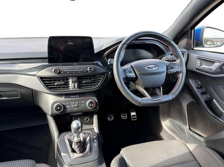 Bluetooth system, Digital clock, Easy fuel capless refuelling system, Eco mode, Ford pass connect, Ford SYNC 3 with 8" TFT touchscreen, and app link Android auto/Apple carplay, Intelligent speed assist, Lane keeping aid with lane departure warning, PAS, Selectable drive mode, Trip computer, Sports tuned suspension, 6 speakers, Aux input, 'Quickclear' heated windscreen/heated washer jets, Auto headlamps (on/off), Body colour large rear spoiler, Body colour side skirt, Body coloured bumpers, Body coloured door handles, Body coloured electrically operated and heated door mirrors with side indicators, Electrically operated front and rear windows with one touch opening and closing, Front variable intermittent wipers with electric wash, Halogen reflector headlamps, Heated rear window, LED daytime running lamp, LED front fog lamps with cornering function, Polished twin tailpipe, ST-Line upper and lower grille with full body styling kit and wing badges, Tailgate wash/wipe, 3 spoke flat bottomed leather steering wheel with red stitching, 60/40 split back and cushion rear seats with 2 height adjustable headrests, Alloy finish pedals, Aluminium gear knob, Centre console with armrest, Cloth upholstery with red stitching, Dark headliner, Driver's lumbar support, Front floor mats, Height adjustable front headrests, Isofix child seat preparation, Manual air conditioning, Reach + rake adjustable steering column, Rear centre headrest, ABS+Electronic Brake force Distribution, Auto hold function, Driver airbag, Electronic parking brake, Electronic stability control, Front and rear seatbelt reminder, Front inertia reel height adjustable seatbelts with pre-tensioners, Front passenger airbag, Front side airbags, Hill start assist, Passenger airbag deactivate switch, Post collision braking, Pre collision assist with autonomous emergency braking and pedestrian/cyclist detection, Side curtain airbags, Three rear inertia reel lap/diagonal seatbelts, Tyre pressure monitoring system, Keyless start with 'Ford Power' starter button, MyKey system, Remote central locking & engine immobiliser, Thatcham category 1 alarm, Contrast stitching - Red, 17" 5x2 spoke alloy wheels with rock metallic finish, Mini steel spare wheel,