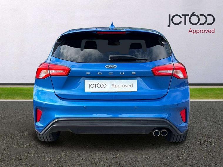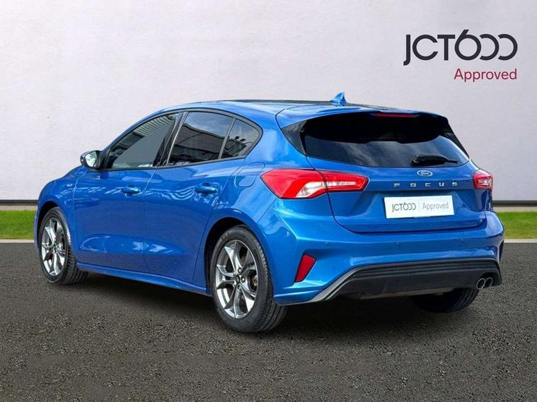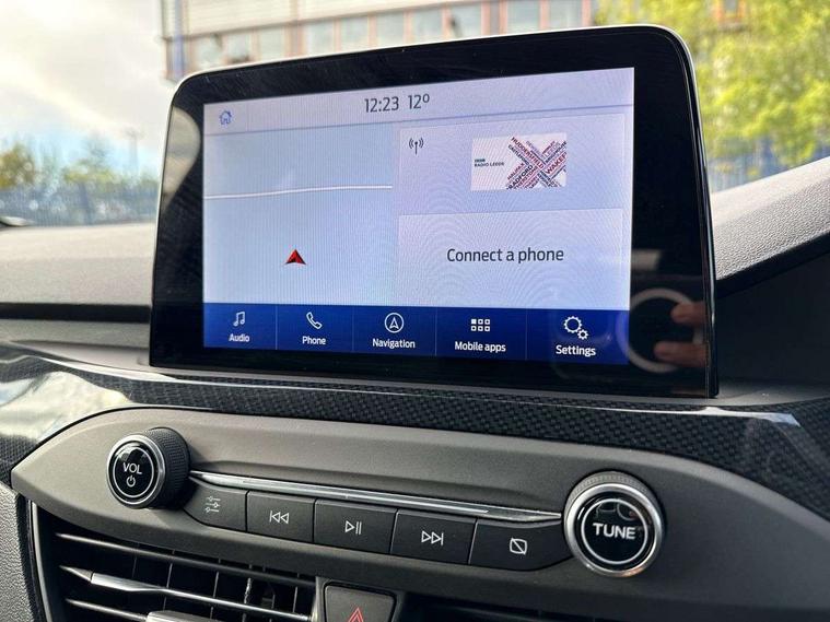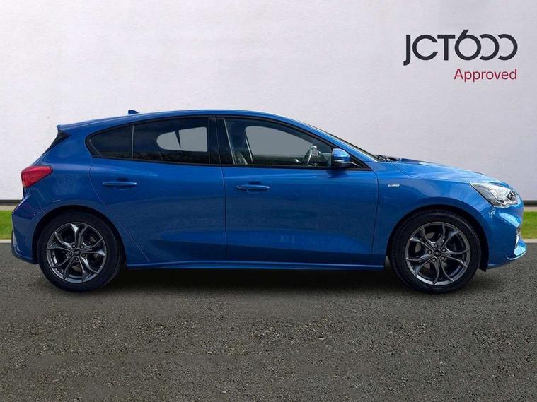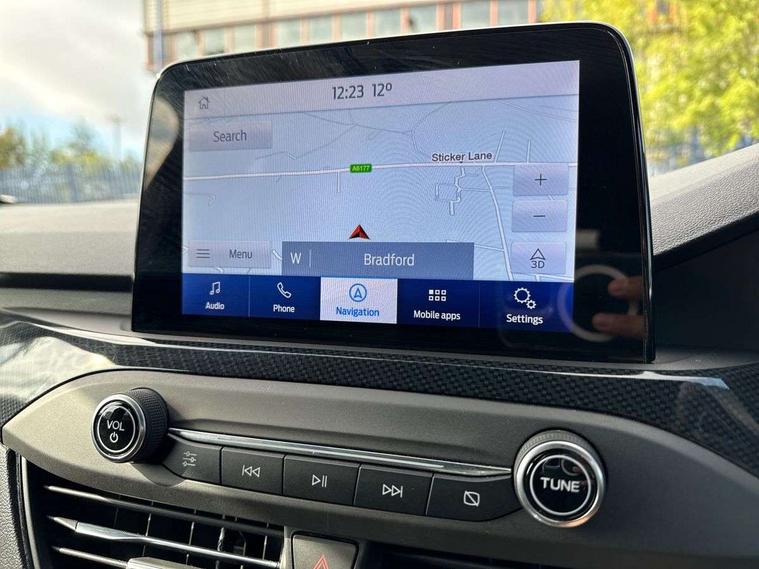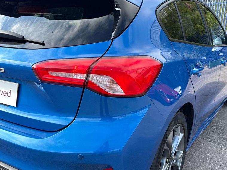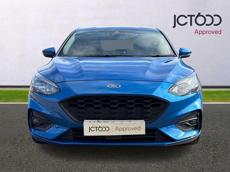 Bluetooth system, Digital clock, Easy fuel capless refuelling system, Eco mode, Ford pass connect, Ford SYNC 3 with 8" TFT touchscreen, and app link Android auto/Apple carplay, Intelligent speed assist, Lane keeping aid with lane departure warning, PAS, Selectable drive mode, Trip computer, Sports tuned suspension, 6 speakers, Aux input, 'Quickclear' heated windscreen/heated washer jets, Auto headlamps (on/off), Body colour large rear spoiler, Body colour side skirt, Body coloured bumpers, Body coloured door handles, Body coloured electrically operated and heated door mirrors with side indicators, Electrically operated front and rear windows with one touch opening and closing, Front variable intermittent wipers with electric wash, Halogen reflector headlamps, Heated rear window, LED daytime running lamp, LED front fog lamps with cornering function, Polished twin tailpipe, ST-Line upper and lower grille with full body styling kit and wing badges, Tailgate wash/wipe, 3 spoke flat bottomed leather steering wheel with red stitching, 60/40 split back and cushion rear seats with 2 height adjustable headrests, Alloy finish pedals, Aluminium gear knob, Centre console with armrest, Cloth upholstery with red stitching, Dark headliner, Driver's lumbar support, Front floor mats, Height adjustable front headrests, Isofix child seat preparation, Manual air conditioning, Reach + rake adjustable steering column, Rear centre headrest, ABS+Electronic Brake force Distribution, Auto hold function, Driver airbag, Electronic parking brake, Electronic stability control, Front and rear seatbelt reminder, Front inertia reel height adjustable seatbelts with pre-tensioners, Front passenger airbag, Front side airbags, Hill start assist, Passenger airbag deactivate switch, Post collision braking, Pre collision assist with autonomous emergency braking and pedestrian/cyclist detection, Side curtain airbags, Three rear inertia reel lap/diagonal seatbelts, Tyre pressure monitoring system, Keyless start with 'Ford Power' starter button, MyKey system, Remote central locking & engine immobiliser, Thatcham category 1 alarm, Contrast stitching - Red, 17" 5x2 spoke alloy wheels with rock metallic finish, Mini steel spare wheel,