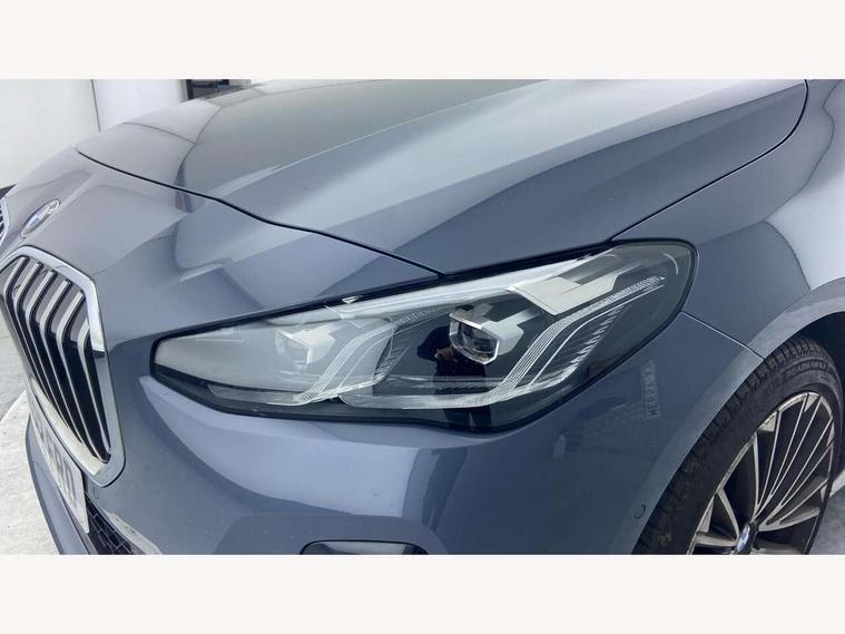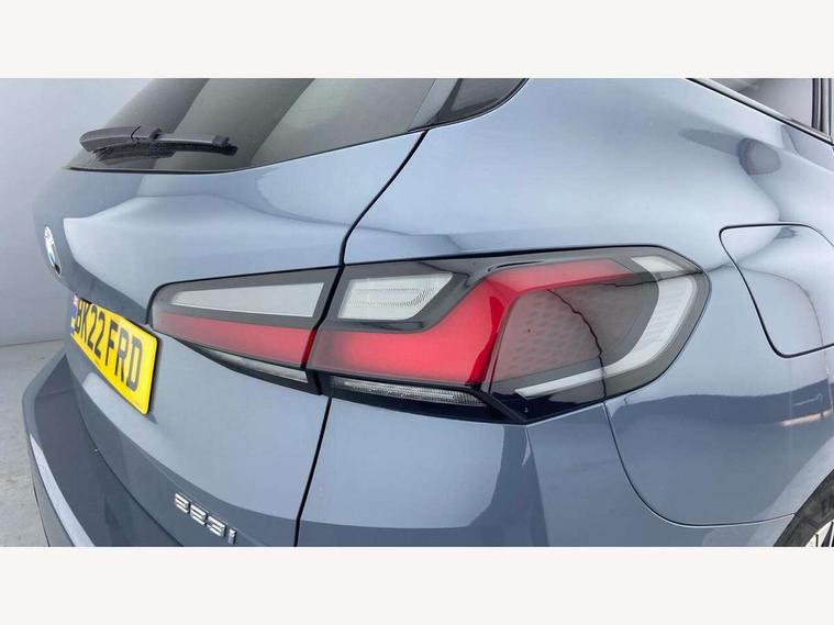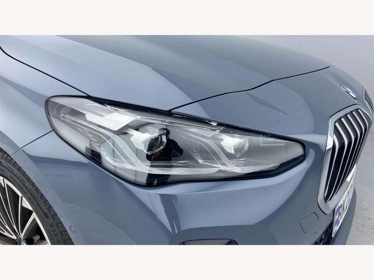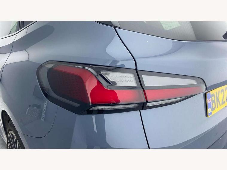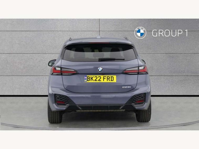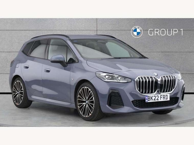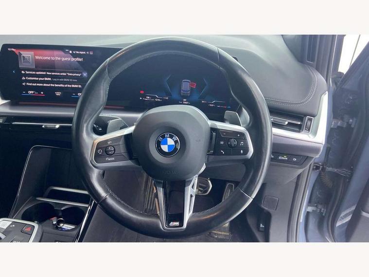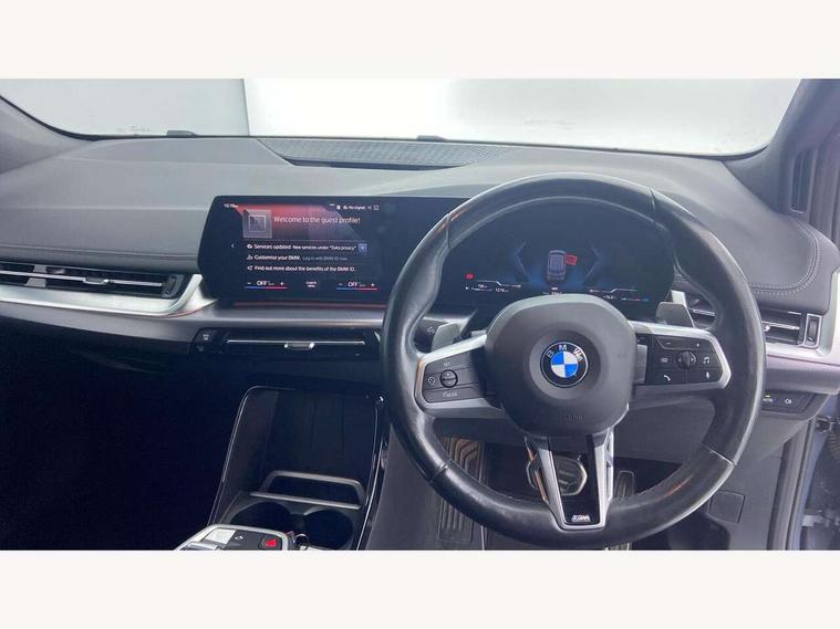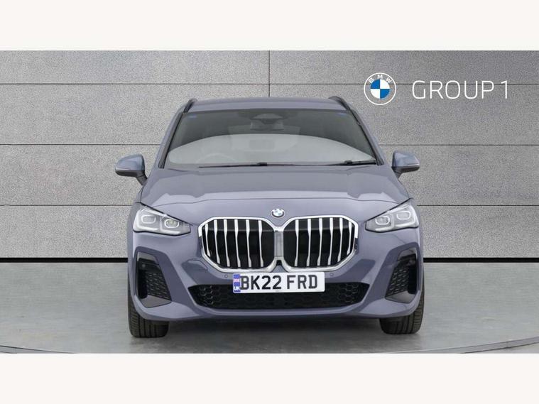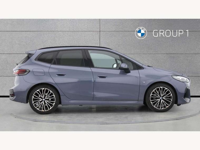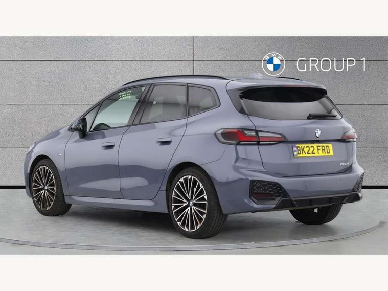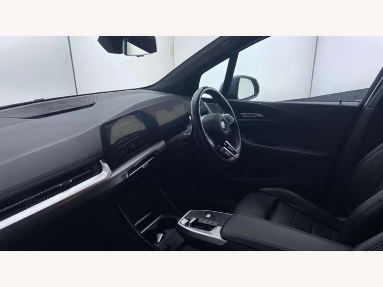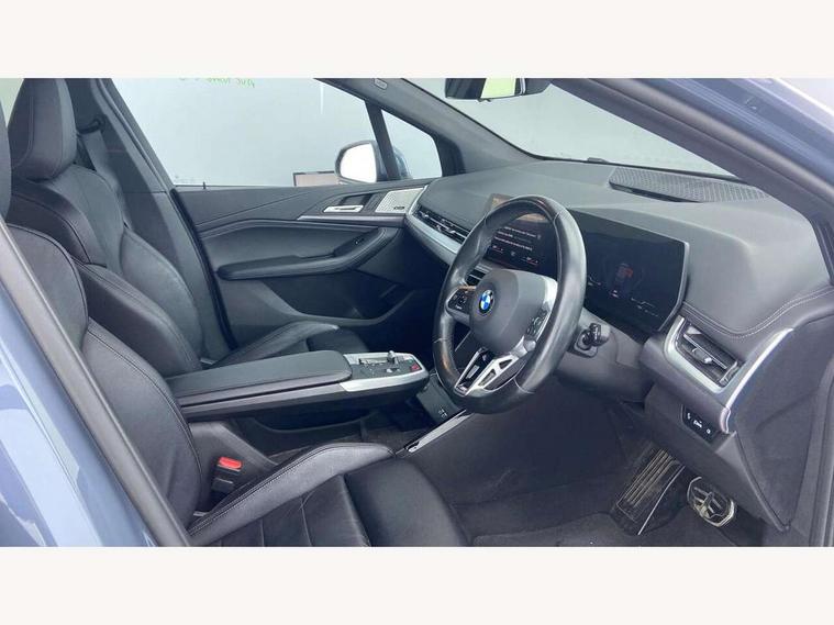 Active Guard incl speed limiting and lane departure functions with auto steering, and front collision warning with brake intervention, Automatic powered tailgate, Automatic start/stop function, BMW Live cockpit plus with Navigation function, BMW Teleservices, Brake pad wear indicator in front and rear, Drive off assistant, Flat air vents on instrument panel in high gloss black, adjustable slats with elements in pearl chrome, iDrive controller, Instrument cluster with speedometer with miles per hour read out, tachometer and fuel gauge, Language version English, On board computer - average speed+fuel consumption, service interval, clock/date, odometer/trip meter, outside temperature display and ice warning, Parking assistant with active park distance control, reversing assistant, lateral parking aid and rear view camera, Servotronic variable electric power steering (EPS), Smartphone integration, Widescreen display, Drive performance control with ECO PRO comfort + sport mode, Gear selector switch with toggle operation, M Adaptive suspension, Petrol Particulate Filter, Steptronic sport transmission with double clutch and gear shift paddles, 2x USB Type C ports in front centre console for charging and data transfer, 2x USB Type C ports in rear centre console for charging, DAB Digital radio, Air inlet middle part on front apron in lines specific design with trim strip in satinised aluminium, Automatic headlights, BMW emblem, engine compartment lid and tailgate, Body colour roof mouldings, Body coloured door mirror caps, Contoured rear roof spoiler in vehicle colour with side aeroblades in black high-gloss, Driver side exterior mirror lighting with BMW logo projection, Dynamic brake lights, Electric adjustable heated door mirrors, Electric windows - front and rear, with open/close fingertip control, anti-trap facility and comfort closing, Folding door handles integrated flush with surface, Front and rear windscreen wipers with heated front washer nozzles, Front bumper cover with independent design in body colour with inserts in black high gloss, Front bumper design elements in satinised aluminium, Front door exit lights, Front door sill finishers aluminium inserts with M inscription, Front entry sills with aluminium inserts + BMW inscription, Front oramental grille with radiator grille bars in satinised aluminium, Heated rear window, Hidden exhaust pipe, High gloss shadow line, High gloss shadowline roof rails, Key with M identification, LED Daytime running lights and parking lights with turn indicators, LED number plate light, LED third brake light in rear spoiler, M identification on sides, Manual headlight range control, Model inscription on right tailgate, Rain sensor, Rear bumper cover with independent design in body colour with inserts in black high gloss, Rear bumper trim strip in satinised aluminium, Rear side wing doors, Shark fin antenna, Side sill covers with independent design in Body colour, Trailer stabilisation logic, Trims on front and rear bumper covers colour-coordinated with side window graphic, Visible VIN plate, Welcome lighting, Windscreen washer nozzle for rear view camera, 12V power socket in luggage compartment and front centre console, 12V socket in right side trim panel, 2 bag hooks in luggage compartment, 2 front reading lights, 2 open cup holders in front centre console, 3 seat bench in 2nd row, 40:20:40 split folding rear seat backrests, Ambient lighting front and rear, Automatic two zone climate control air conditioning, Bottle trays in all doors, Child seat ISOFIX attachment for two outer rear seats and front passenger seat with anchorage points, Driver and front passenger sports seats, Four grab handles integrated in roof lining, Front and rear door pockets, Front and rear footwell lighting, Front and rear side armrest integrated into door trim, Front centre console storage compartment, Front head restraints, Glovebox with light, Heated front seats, Height adjustable 3 rear head restraints, Interior door handle recess light on all doors, Luggage compartment lighting, M Anthracite headlining, M specific floor mats, M sport leather steering wheel, Map pockets, Mechanical rear seats with fore/aft adjustment, Multi-function controls for steering wheel, One piece parcel shelf opens together with tailgate and removable, Rear cloth hooks, Single front passenger seat, Sliding rear seat bench, Stainless steel pedals, Steering wheel column manual adjustment, Storage compartment lighting in centre console and storage tray in centre stack, Storage compartment net in left side trim panel, Storage compartment with folding cover under centre console armrest cushion, Storage tray in right side trim panel, Sunvisors with illuminated vanity mirrors, Three spoke sport leather steering wheel, Connected pack professional - 2 Series Active Tourer, Technology pack - 2 Series Active Tourer - MY22, 3 point seatbelts on all seats, front pyrotechnic belt tensioners, stopper and belt force limiters, rear coded belt buckles, Airbag - Front driver and passenger, front and rear head, front side, curtain head protection, manual deactivation of front passenger airbag possible, Anti lock braking system (ABS) with brake assist, Automatic hold function, BMW emergency call, Brake drying, Braking readiness, Child proof locking system in rear door, Cornering brake control, Crash Sensor - activates hazard/interior lighting + unlocks doors, DSC - Dynamic Stability Control, Dynamic brake control, Dynamic Traction Control - DTC, Electromechanical parking brake, Energy recovery system, Front disc brakes, Integrated braking system, PC iBrake PostCrash approach control warning with light braking function, Rear disc brakes, Tyre pressure monitoring system, Warning triangle and first aid kit, Anti theft alarm system, Closing system with central locking, Engine immobiliser, Locking wheel bolts, Front centre console trim in high gloss black, BMW mobility tyre sealing system, Reduced rolling resistance tyres,
