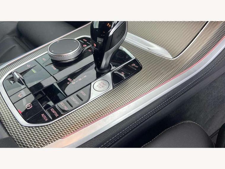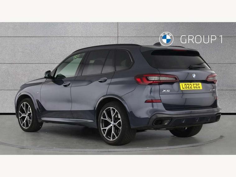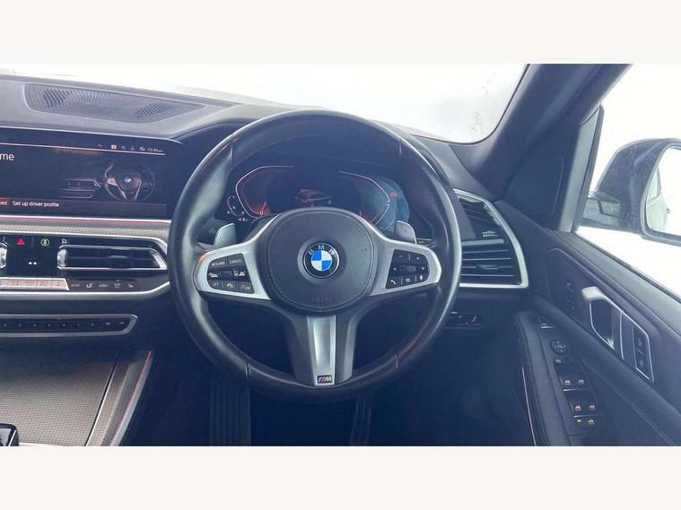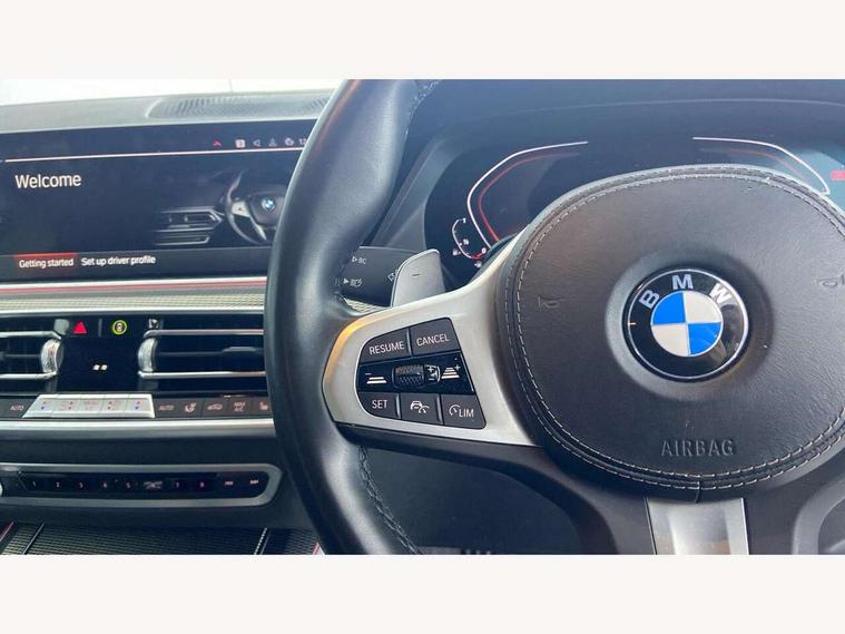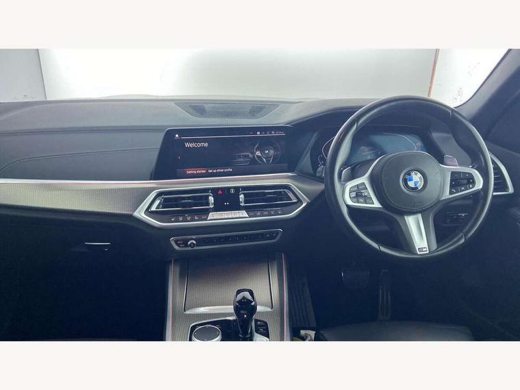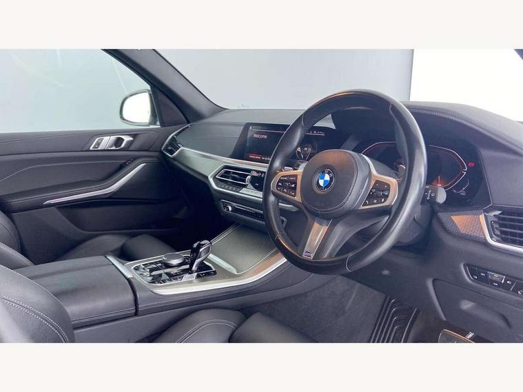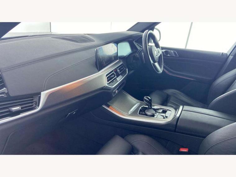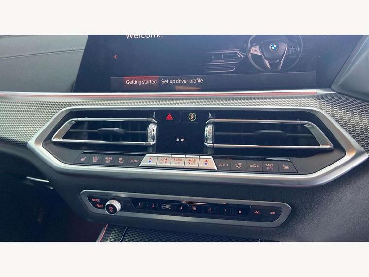 20GB hard disc drive (HDD) memory, Active guard plus, Attentiveness assist, Automatic tailgate with top hinged section open and manual bottom hinged section, BMW ConnectedDrive online services, BMW digital live cockpit professional - 12.3" digital instrument panel and 12.3" CID, with touch/voice command, BMW legal emergency call, BMW Teleservices, Brake force display, Brake pad wear indicator warning light, Cruise control with brake assist, Enhanced bluetooth with wireless charging, Front/rear park distance control, iDrive controller with shortcut buttons, Lights on warning, Oil sensor for level and grade, On board computer inc. average speed, fuel consumption, liquid crystal Info display, journey computer, outside temperature display, personal profile, Service interval indicator, Speed limit info display, Speed limiting function, Wi-Fi hotspot, 48V Mild hybrid technology, Adaptive 2-axle air suspension, Double VANOS, Double wishbone front axle, Drive performance control with ECO PRO comfort + sport mode, Eight speed steptronic sport automatic transmission and gearshift paddles on the steering wheel, High precision injection, Petrol Particulate Filter, Safety battery terminal clamp, Twin scroll turbocharger with Valvetronic, DAB Tuner enables digital radio reception, Favourite buttons, Hi-Fi loudspeaker system, USB connection, USB type A 1.5A in cupholder, USB Type C 3A in centre armrest, Active Air Stream kidney grille with high-gloss chrome, Adaptive air flap control bar in high-gloss black, Automatically dimming rear view mirror, BMW Individual high gloss black shadow line roof rails, BMW Individual high gloss shadow line, Body colour bumpers, Body colour door handles, Dynamic brake lights with LED technology, Exhaust tailpipes - single, left and right with Chrome finisher, Follow me home headlight function, Front and rear electric windows with open and close fingertip control, anti trap facility and comfort closing, Heated windscreen washer jets, High beam assistant, High gloss black outer and central air intakes on front bumper with pearlescent chrome finish, High gloss black Side elements, LED daytime running lights, LED rear lights, M aerodynamic body styling, M designation on left and right front side panels, Pearlescent chrome front grille bars, Rain sensor with automatic headlight activation and windscreen wiper control, Rear side wing doors, Satin aluminium side window graphic, Third brake light in rear spoiler, Variable intermittent rear wash/wipe, Welcome light carpet, X5 on left tailgate, xDrive designation on right tailgate, 12V - Power sockets with 2x centre console and 1x luggage compartment, 3 seat bench in 2nd row, 40:20:40 split folding rear seats, Ambient interior lighting with 6 pre-designed selectable lights including dynamic function, Centre and rear interior light, Child seat ISOFIX attachment with rear outer seats includes top tether, Compartment in front of cupholder, Electric front seat adjustment with driver and front passenger memory function, Electrical steering column with adjustable height and length with activation and control on the steering column, Foldable rear centre armrest with 2 cupholders and storage compartment, Front and rear cupholders x 2, Front and rear door pockets, Front and rear door sill inlays with illuminated BMW M designation, Front and rear side armrest integrated into door trim, Front footwell lights, Front reading lights, Light inside glove compartment, Lockable glove compartment, Luggage compartment floor panel with integral storage tray, Luggage compartment lighting, M leather steering wheel, M specific key, M specific steering wheel, Make-up mirror lights, Multifunction controls for leather steering wheel, Multifunctional hooks, Rear head restraints, Seat back with flap pocket, Securing rings in luggage compartment, Single front passenger seat, Storage bins on all doors, Storage tray and compartment with cover in centre console, Sunvisors with illuminated vanity mirrors, Toolkit located in luggage compartment, Velour floormats, Connected Package Professional - X5, Expanded exterior mirror pack - X5/X5 M, Non-smokers pack - X5, Airbags - driver/front passenger, rear and side, first and second row seats head airbags, front passenger seat airbag deactivation + knee airbag, Anti-lock braking system (ABS), Automatic Stability Control (ASC), Brake drying, Brake energy regeneration, Brake fade compensation, Braking pre-tensioning, Cornering brake control (CBC), Crash sensor activating central locking release, hazard warning lights, fuel cut off, interior lighting + activation of safety battery terminal clamp, Deformation zones - front and rear with door reinforcements and bumpers up to 2.5 mph, DSC - Dynamic Stability Control, Dynamic brake control, Dynamic Traction Control - DTC, Electromechanical parking brake with automatic drive away release and auto hold function, Electronic brake force distribution, Front and rear seatbelts with seatbelt stopper, seatbelt tensioner for front and outer rear seats and belt force limiter, Front head restraints with anti-whiplash, Height adjustable front seatbelts, Hill start assistant, Integrated brake system, M Sport braking system in blue high gloss + blue painted brake calipers with M designation, Mechanical child proof lock on rear doors, Passive protection for pedestrians, Seat occupancy detection for driver and passenger side, Side impact protection, Three 3 point inertia reel seatbelts, Two tone horn, Tyre pressure monitoring system, Ventilated front and rear disc brakes, Warning triangle and first aid kit, Closing system with central locking, Driver and front passenger door centre lock switch, Locking wheel bolts, Thatcham 1 alarm system with remote control and engine immobiliser, Start/stop toggle diamond shaped trim finisher in pearl chrome,