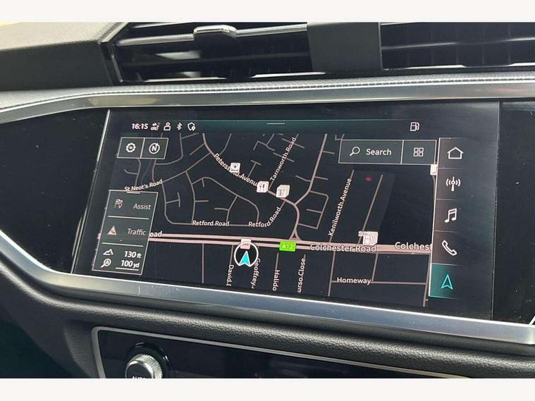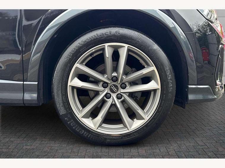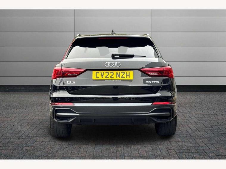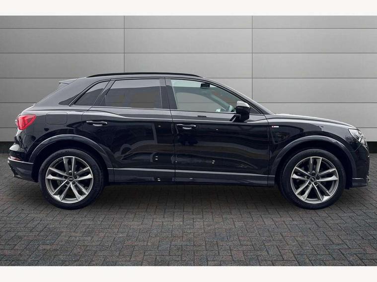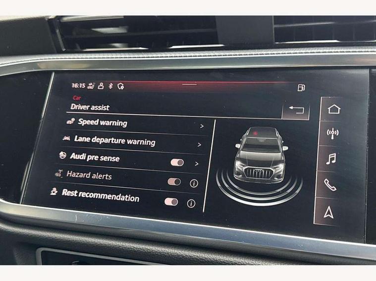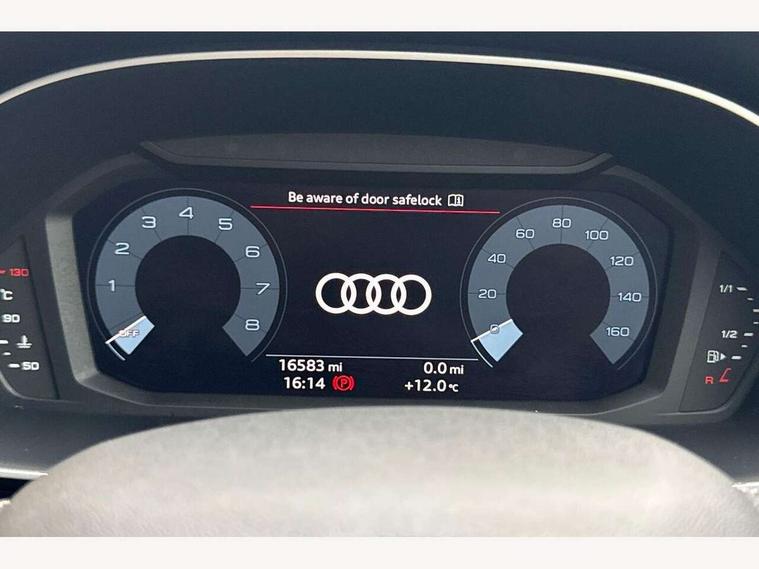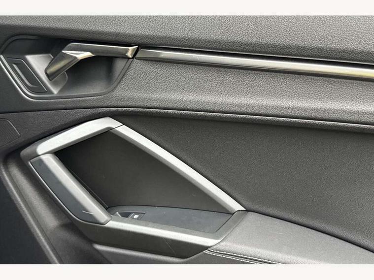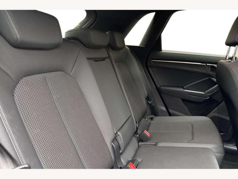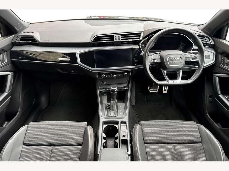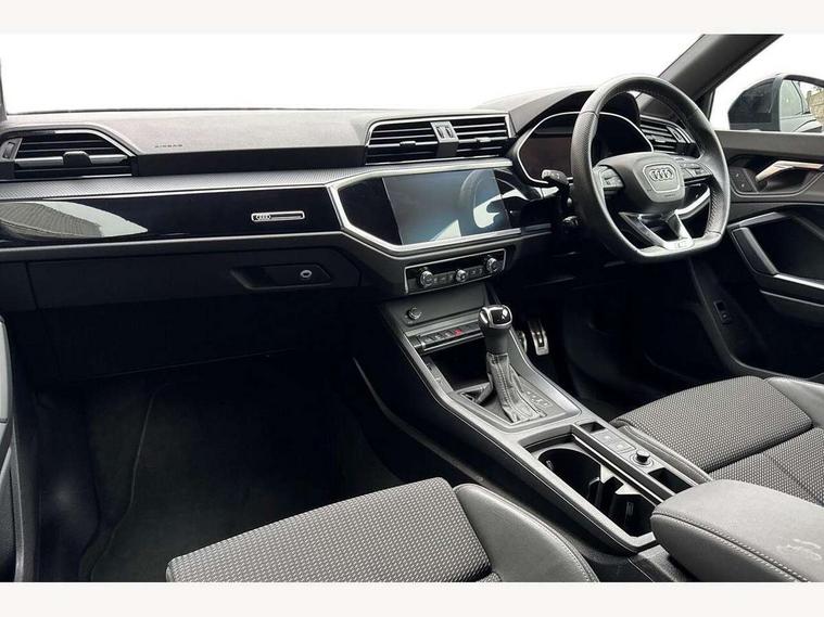 Amazon alexa Integration, Audi connect safety and service (e-call), Audi drive select, Audi lane departure warning, Audi Virtual Cockpit - 10.25" display, Bluetooth interface, Camera based traffic sign recognition, MMI Navigation Plus with high resolution 10.1 inch touchscreen colour display, Power operated tailgate, Progressive steering, Service interval indicator, Smartphone interface includes wireless Apple carplay/Android Auto, Start stop system with recuperation, Voice control system with natural language interaction, 48V Mild hybrid technology, Sports suspension, 2 USB-C ports with charge and data functions, 6 passive loudspeakers, DAB digital radio module, Acoustic windscreen, Auto dimming frameless rear view mirror, Black roof rails, Electrically folding, adjustable and heated door mirrors with integrated LED side indicators and kerb view function for passenger side, Front and rear electric windows, Front fog lights, Grille vertical bars in aluminium silver/Matt, High gloss black finish B and C pillars, LED headlights with LED daytime running lights, LED rear lights, LED third brake light, Privacy glass dark tinted rear and rear-side windows (from B-pillar backwards), Rain and light sensors, Rear diffuser strip in matt titanium black, Rear side wing doors, Rear wiper, S line bumpers in contrasting Manhattan grey, Variable front intermittent wipers, 12V socket in rear centre console, 3 seat bench in 2nd row, 40:20:40 folding with manual adjustment for 60:40 forwards/backwards position and backrest angle, Adjustable rear seat bench/backrest with centre armrest and cupholder, Black cloth headlining, Dual zone electronic climate control, Front and rear black floor mats with contrast stitching in rock grey, Front and rear headrests, Front and rear roof module including reading lights, Front centre armrest, Glove compartment lighting, Height and reach adjustable steering wheel, Illuminated door sill trims with S logo, ISOFIX child seat mounting for front passenger with airbag deactivation and outer rear seat including top tether attachment point for outer rear seats, Luggage compartment light, Manual front seats with height adjustment, Perforated leather gearknob, Single front passenger seat, Stainless steel luggage compartment sill finisher, Stainless steel pedals, Black styling pack - Q3, Non smoking pack - Q3, 3x3 point rear seatbelts, 6 airbags - Driver, front passenger, curtain and side windows, Audi pre-sense front with pedestrain and cyclist recognition, Electromechanical parking brake, Electronic stabilisation control including ABS, ASR and EDL, Front seatbelt reminder, Hill descent control, Hill hold assist, Manual child lock in rear doors, Pre sense basic, Seatbelt monitoring, Tyre pressure warning, Warning triangle and first aid kit, Anti theft alarm, Anti theft wheel bolts, Immobiliser, Remote central locking, Detail dashboard around MMI touch colour display in glass look, black with surround in aluminium look, Leatherette door armrest, Piano black inlay, Tool kit, Tyre repair kit,