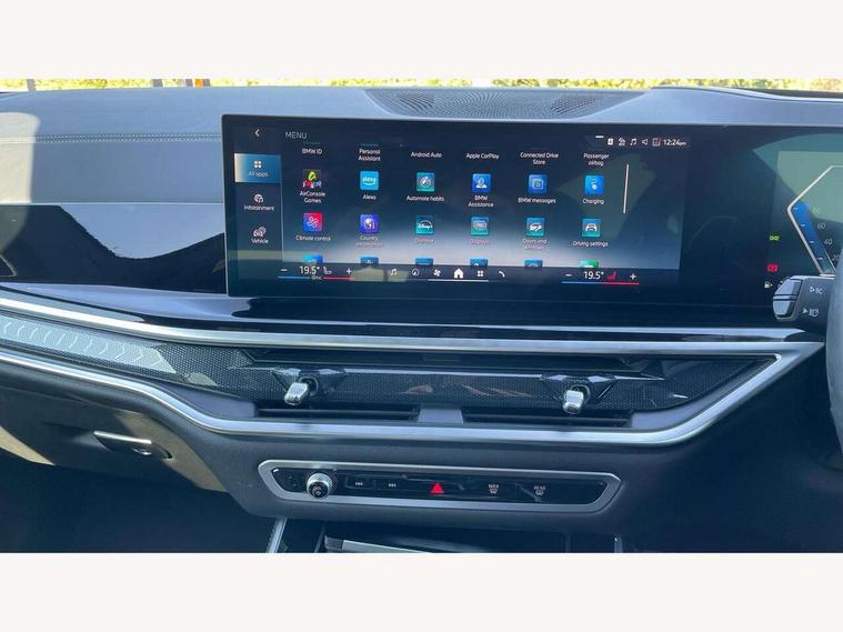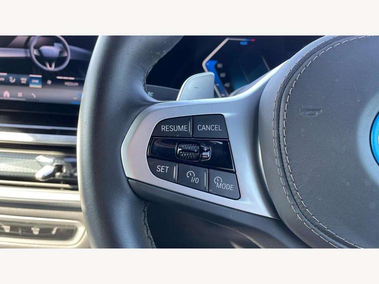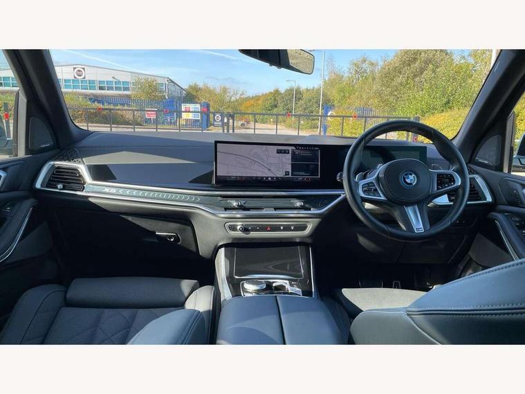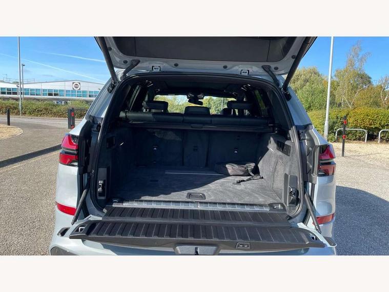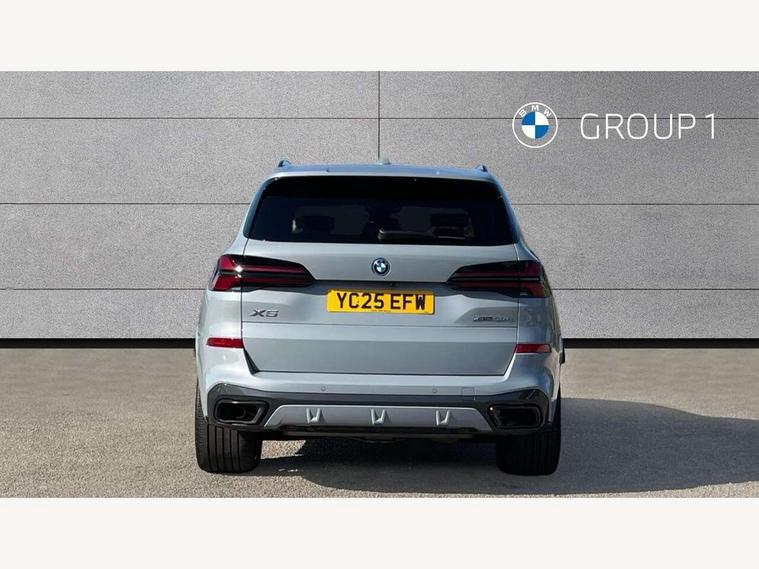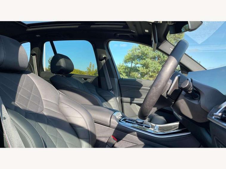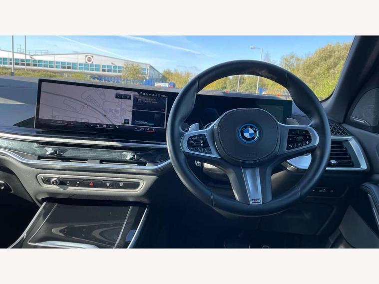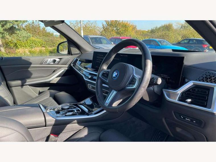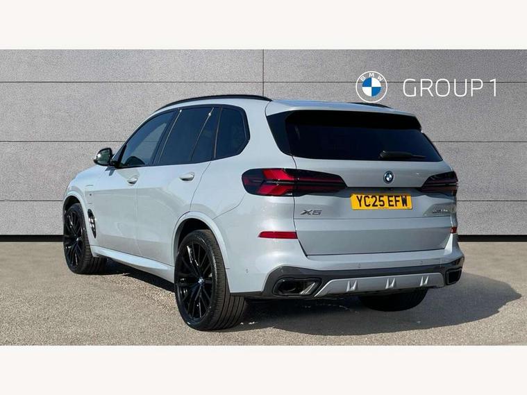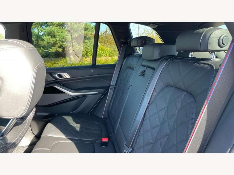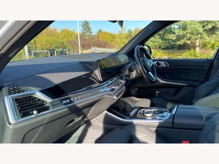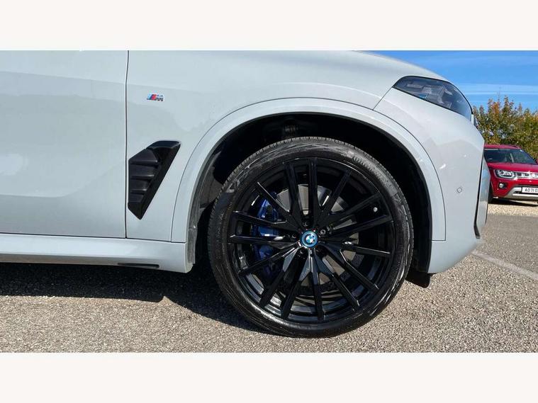 Attentiveness assist, Automatic tailgate operation, BMW ConnectedDrive online services, BMW live cockpit + with curved 12.3 instrument cluster/14.9 central display, nav/Tuner with diversity reception, RDS/4GLTE/remote software upgrade, BMW Teleservices, Condition based service, Cruise control with brake assist, eCall emergency call system, Enhanced bluetooth with wireless charging, Integrated owner's handbook, PAS, Speed limiter, Wi-Fi hotspot, AC Fast charging preparation (Maximum charging power 11kW), Adaptive 2-axle Front and rear air suspension, Drive performance control with ECO PRO comfort + sport mode, Eight speed steptronic sport automatic transmission and gearshift paddles on the steering wheel, Adaptive LED Headlights, Front and rear electric windows, High beam assistant, High gloss black shadow line roof rails, LED daytime running lights, Rain sensor, Rear side wing doors, Third brake light in rear spoiler, Variable intermittent rear wash/wipe, 12V - Power sockets with 2x centre console and 1x luggage compartment, 3 seat bench in 2nd row, Foldable rear centre armrest with 2 cupholders and storage compartment, Front and rear side armrest integrated into door trim, Headrests for all seats, Luggage compartment separating net, Lumbar support with height and depth adjustment in backrest, Single front passenger seat, Three spoke sport M leather steering wheel, Velour floormats, Ambient light interior pack - X5, Driving assistant pack with radar based driver assistance system - X5, Expanded exterior mirror pack - X5/X5 M, M aerodynamics pack - X5, Parking assistant pack - X5, 3 rear seatbelts, Acoustic protection for pedestrians, Active protection, Airbags - driver/front passenger, rear and side, first and second row seats head airbags, front passenger seat airbag deactivation + knee airbag, Anti-lock braking system (ABS), Automatic Stability Control (ASC), Brake energy regeneration, Cornering brake control (CBC), Crash sensor activating central locking release, hazard warning lights, fuel cut off, interior lighting + activation of safety battery terminal clamp, DSC - Dynamic Stability Control, Dynamic Traction Control - DTC, Electromechanical parking brake with automatic drive away release and auto hold function, Electronic brake force distribution, Hill start assistant, M Sport blue painted brake calipers with 'M' designation, Mechanical child proof lock on rear doors, Tyre pressure monitoring system, Tyre pressure sensors, Ventilated front and rear disc brakes, Warning triangle and first aid kit, Alarm system, Closing system with central locking, Comfort access system, Locking wheel bolts,